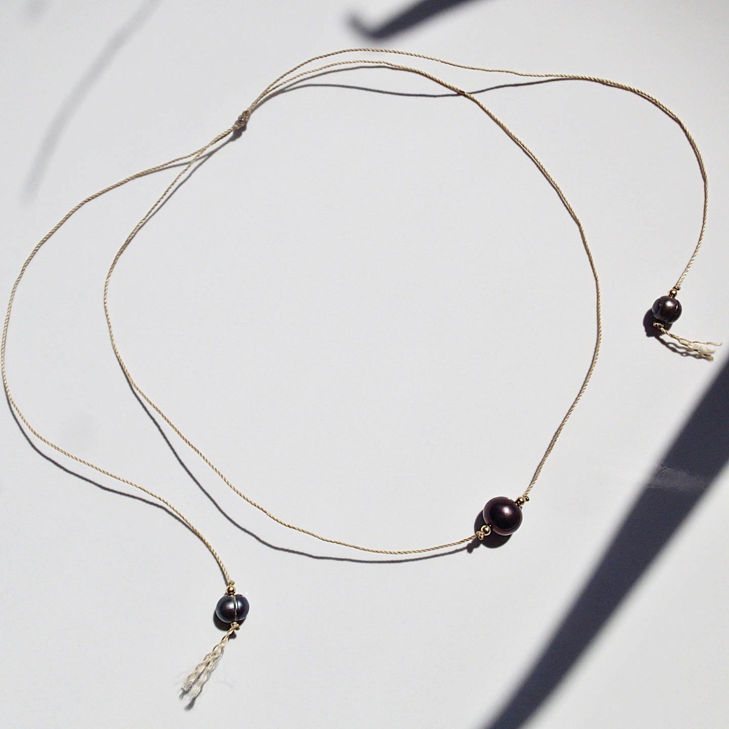 Handgefertigte Halskette an einer beigen, strapazierfähigen Schnur. Verziert mit einer natürlichen schwarze Süßwasserperle in der Mitte und zwei Perlen an den Enden an der Regulierung. Zusätzlich verziert mit Silber (925) vergoldeten Kugeln.