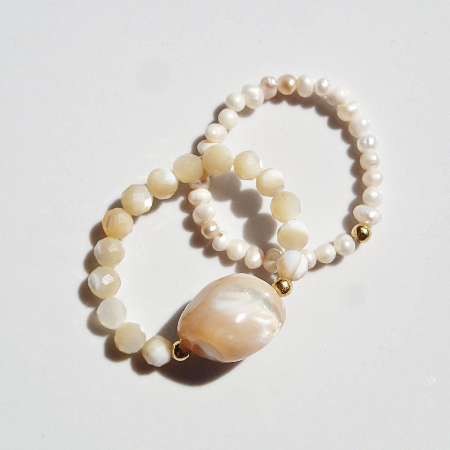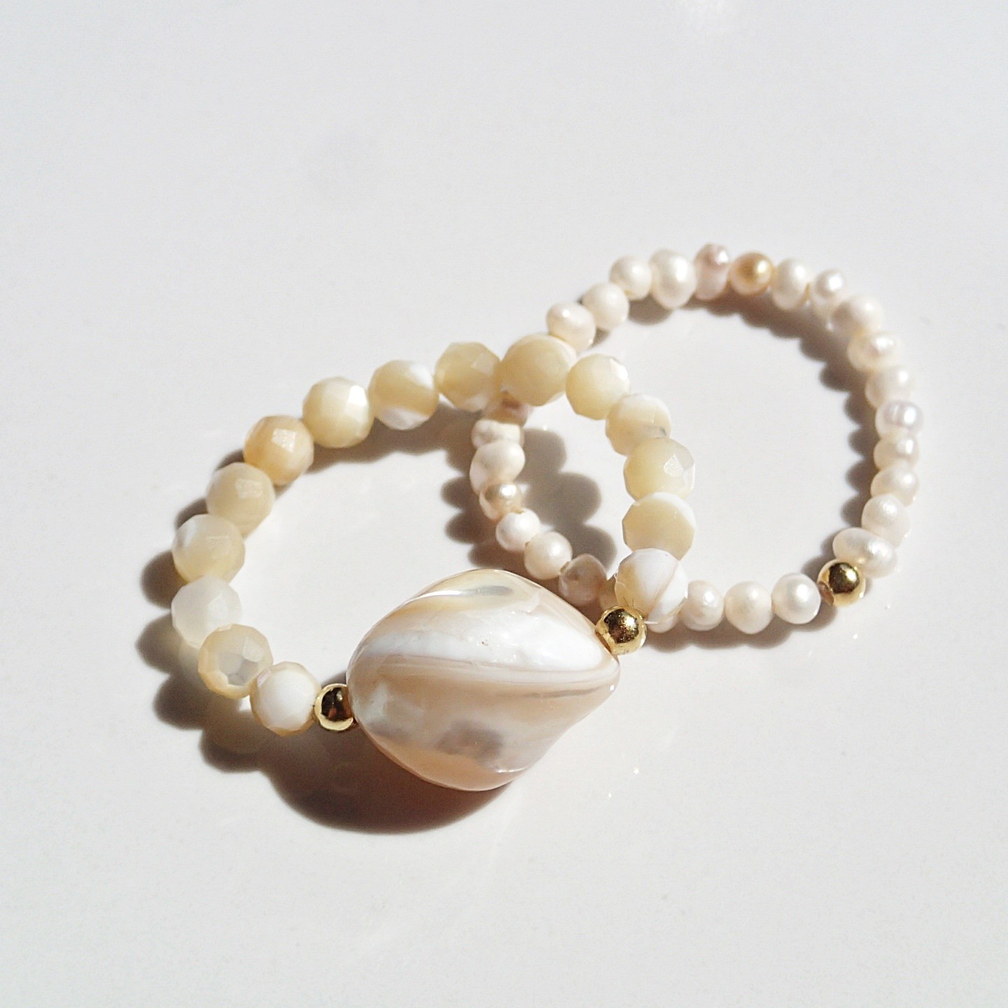 Handgefertigte natürliche Ringe: Muschel und Süßwasserperlen. Dekorative Kugeln aus Silber und vergoldetem Silber.