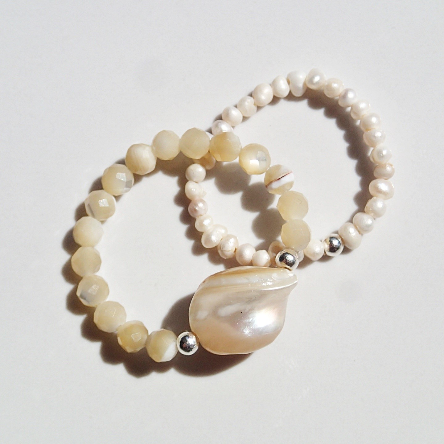 Steingröße: unregelmäßiger Muschel 6-8mm, Muschel facettierte Kugel ~2,5mm, unregelmäßiger Perle ca. 2mm