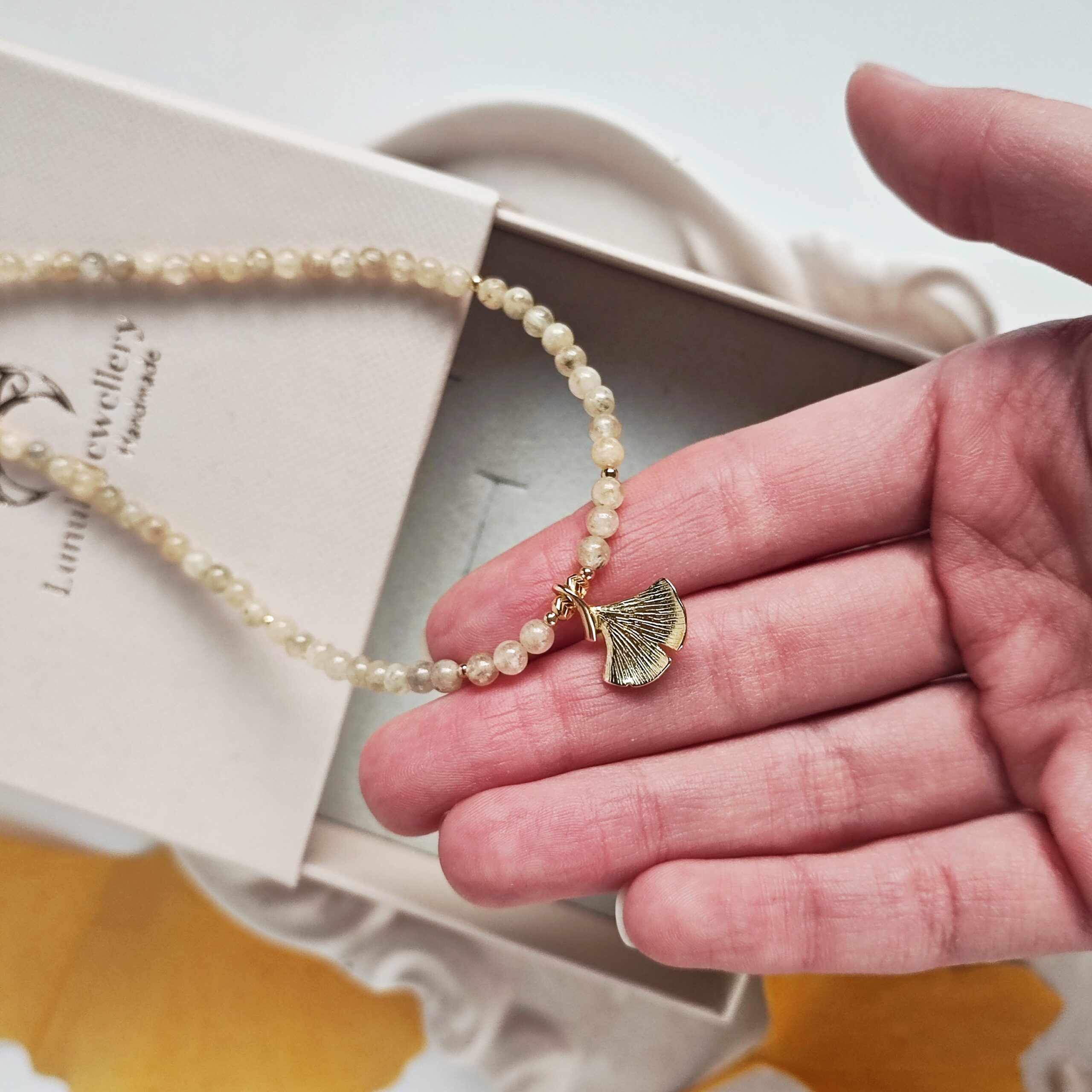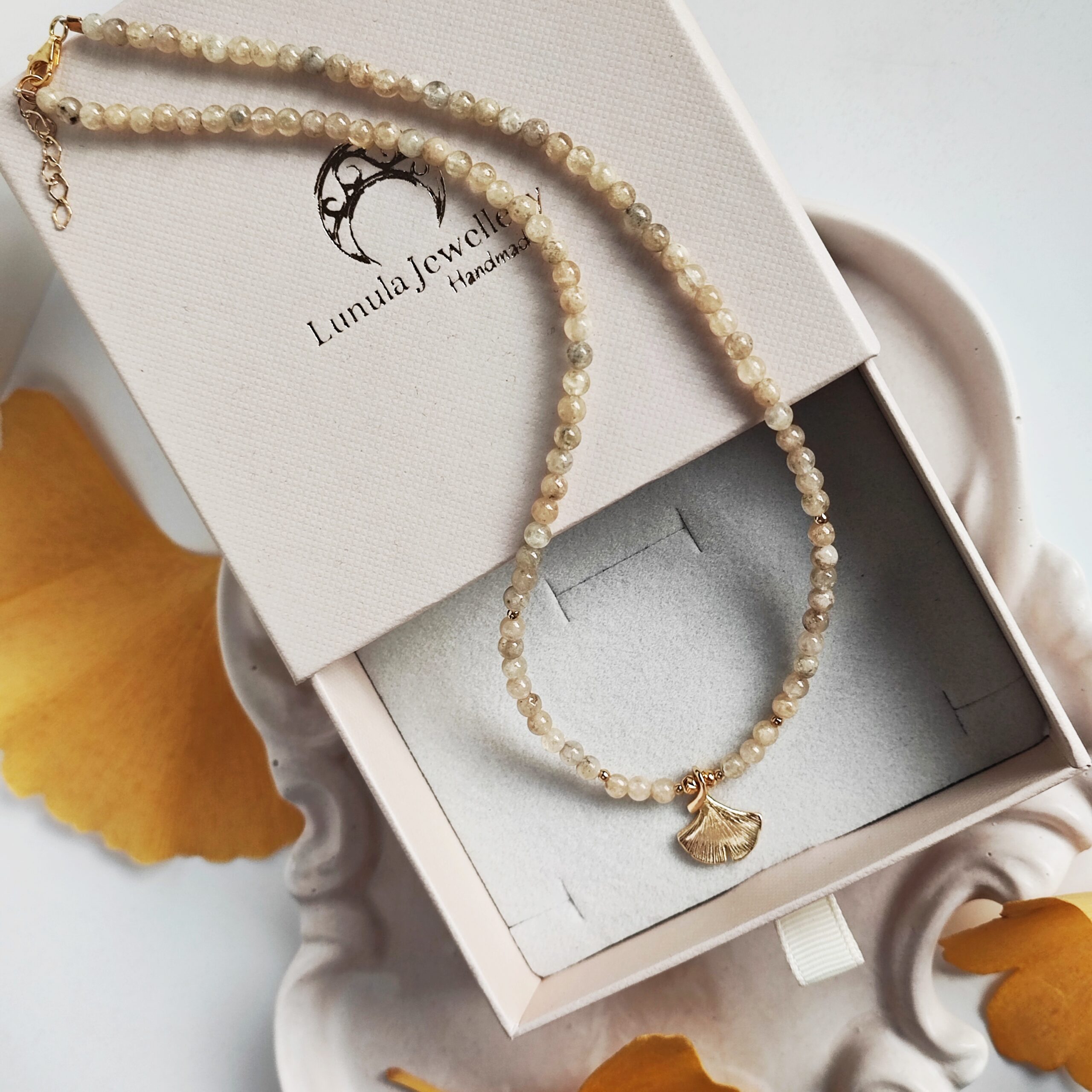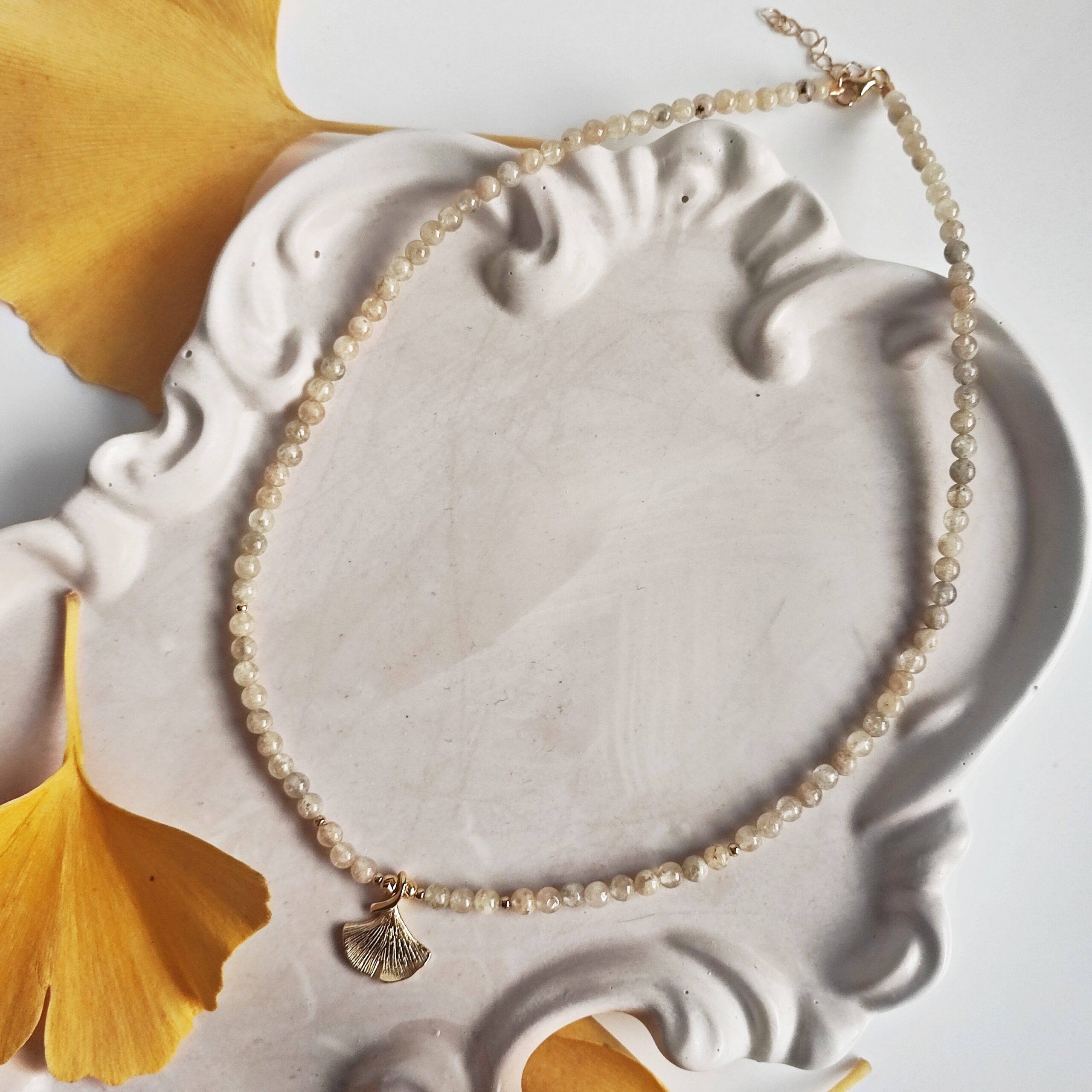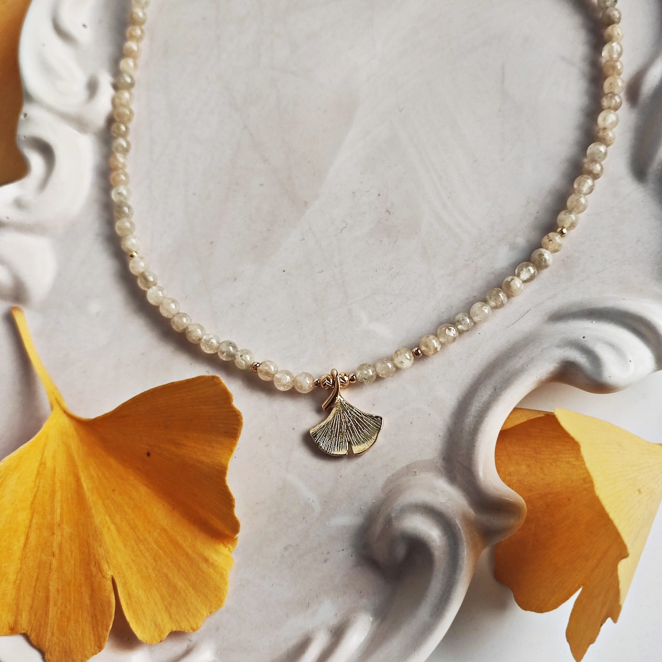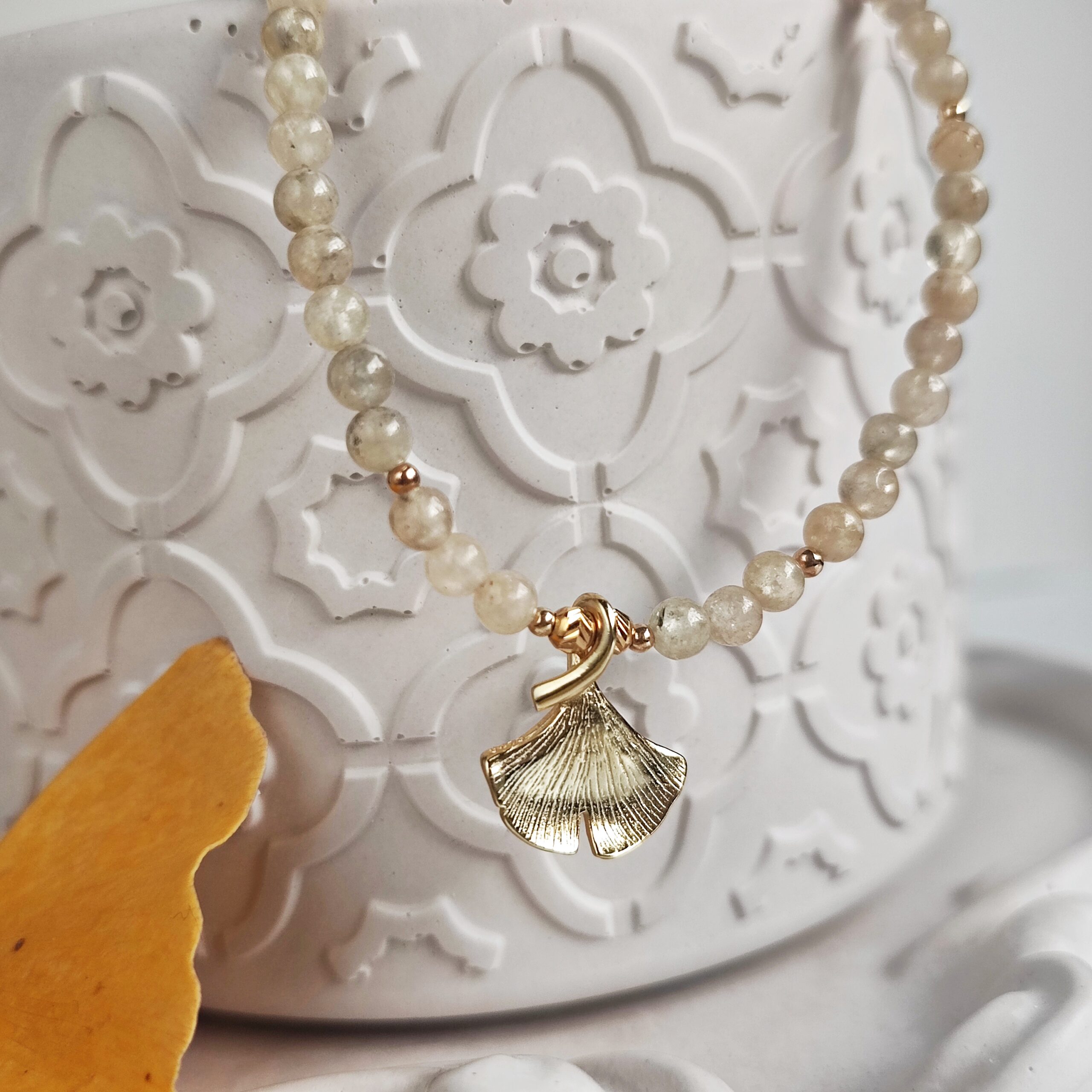 Centralnym punktem naszyjnika jest zawieszka w kształcie liścia Ginkgo, symbolu długowieczności, nadziei i harmonii.