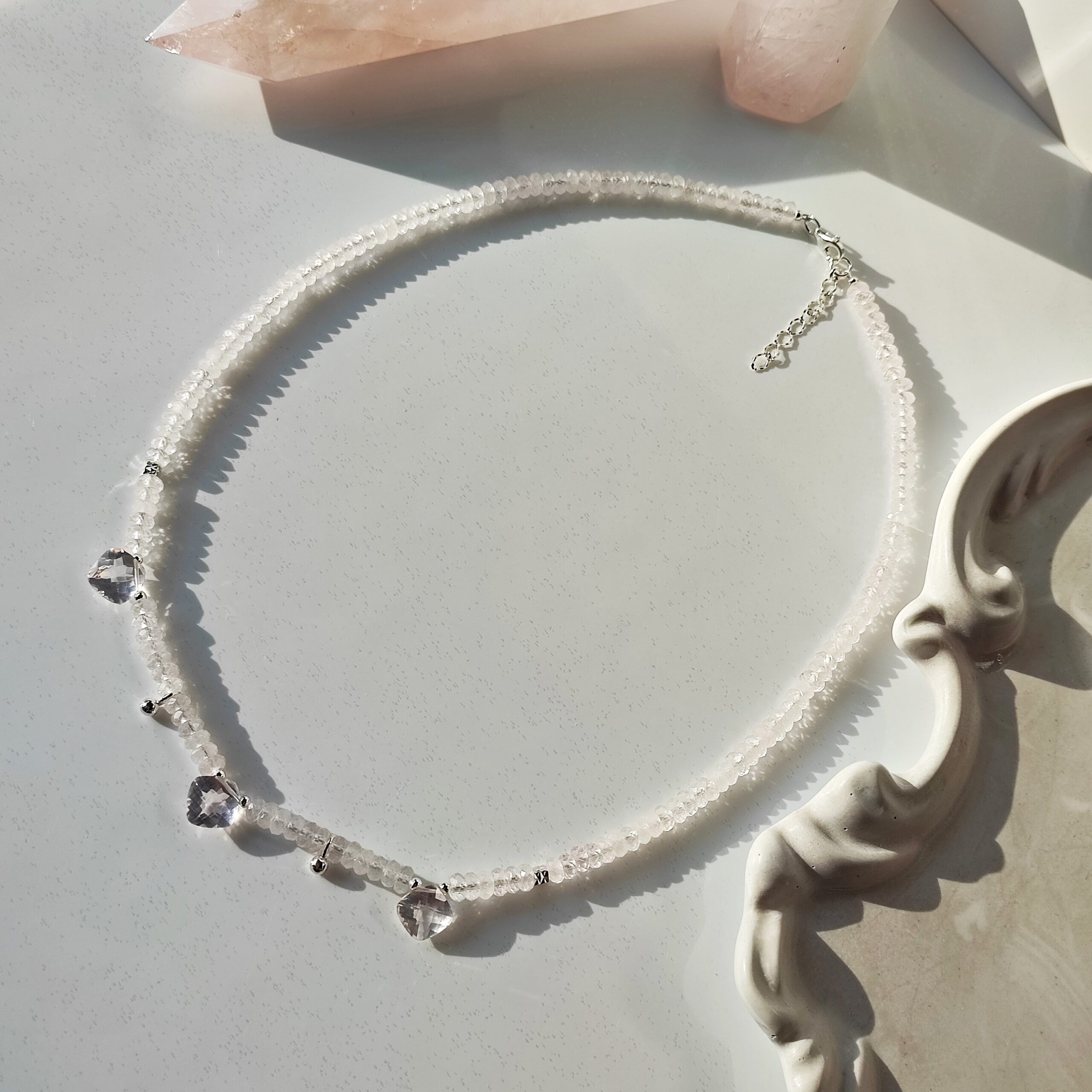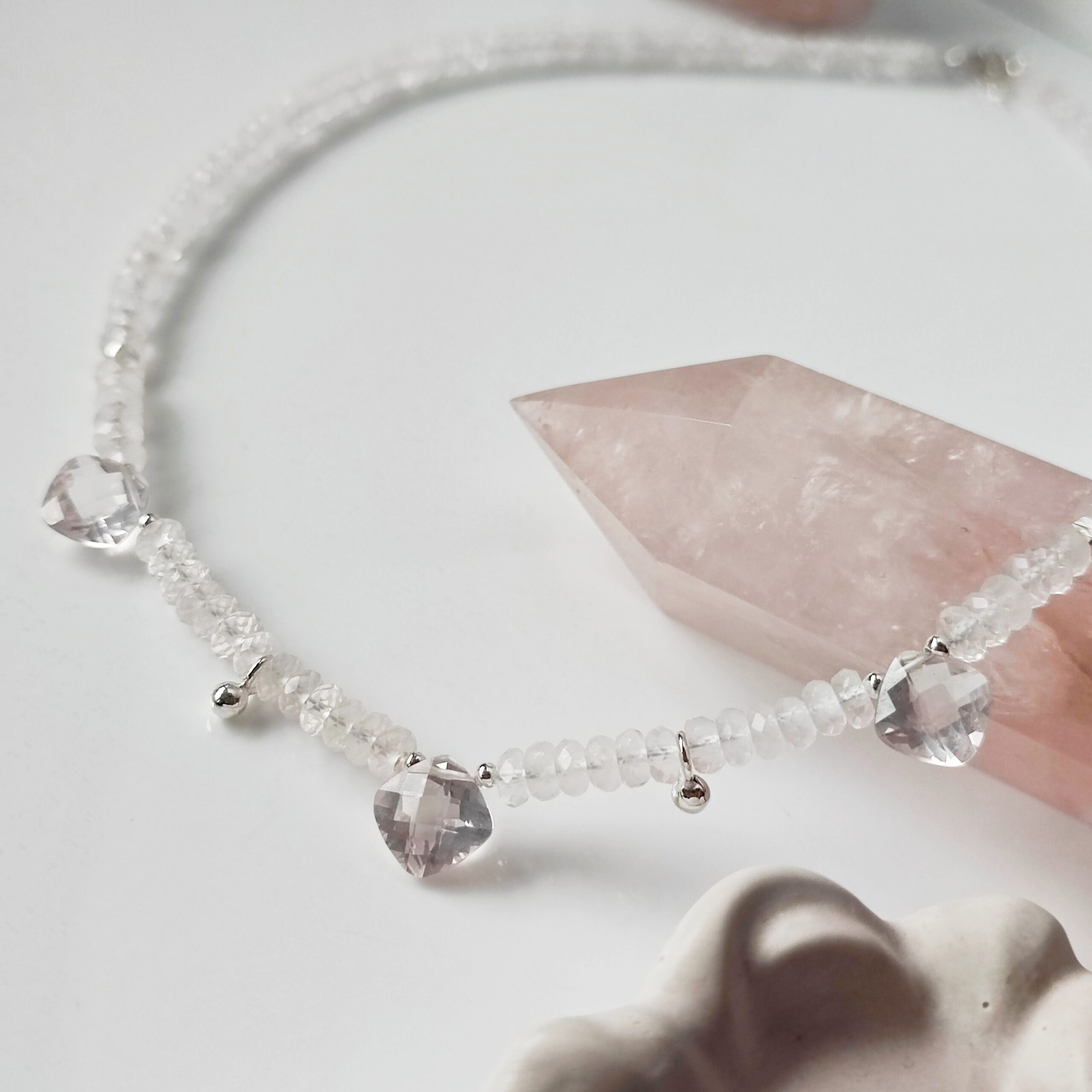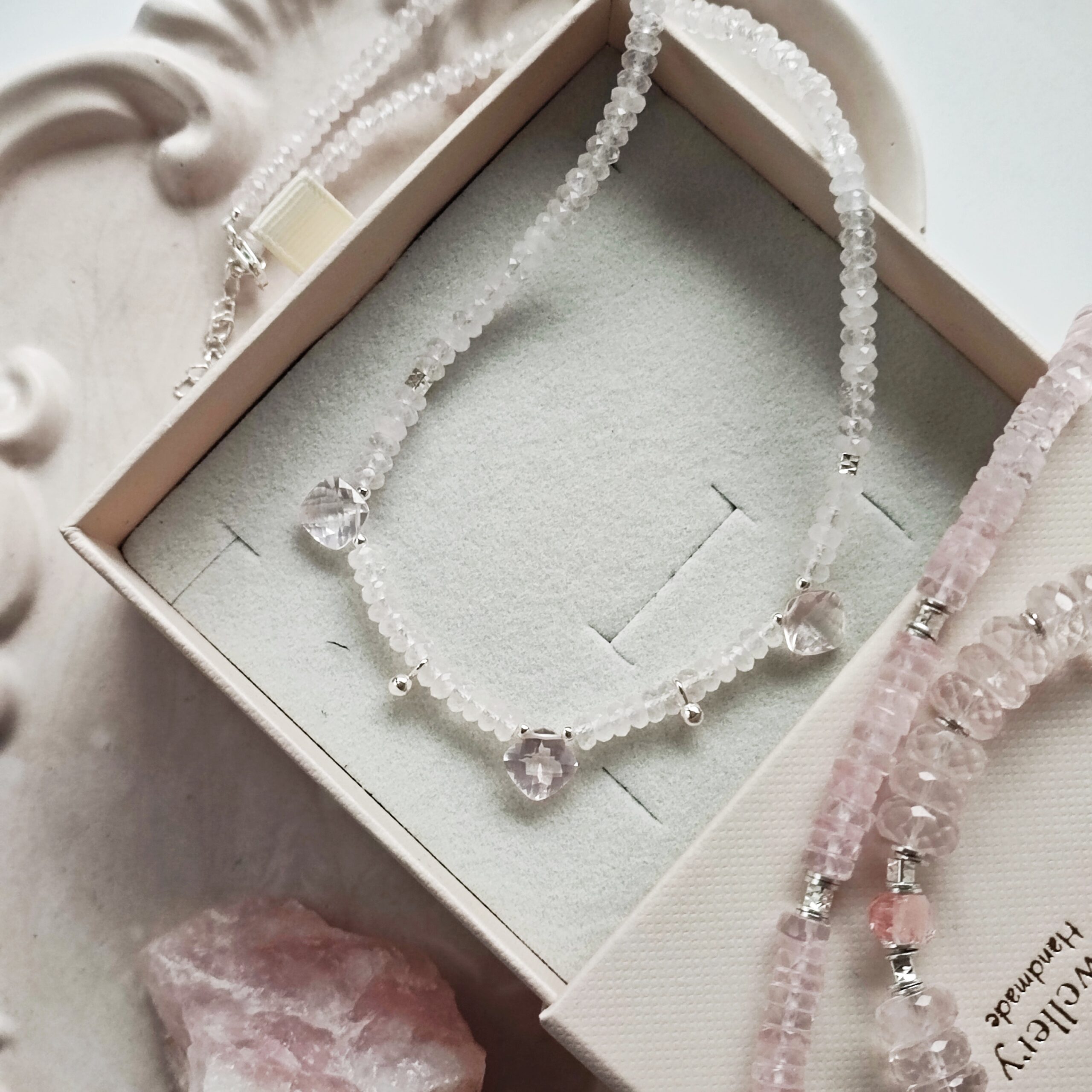 Ręcznie wykonany, wyjątkowy naszyjnik z naturalnego Kwarcu różowego zdobionego trzema klejnotami Kwarcu różowego w szlifie cushion (poduszka).