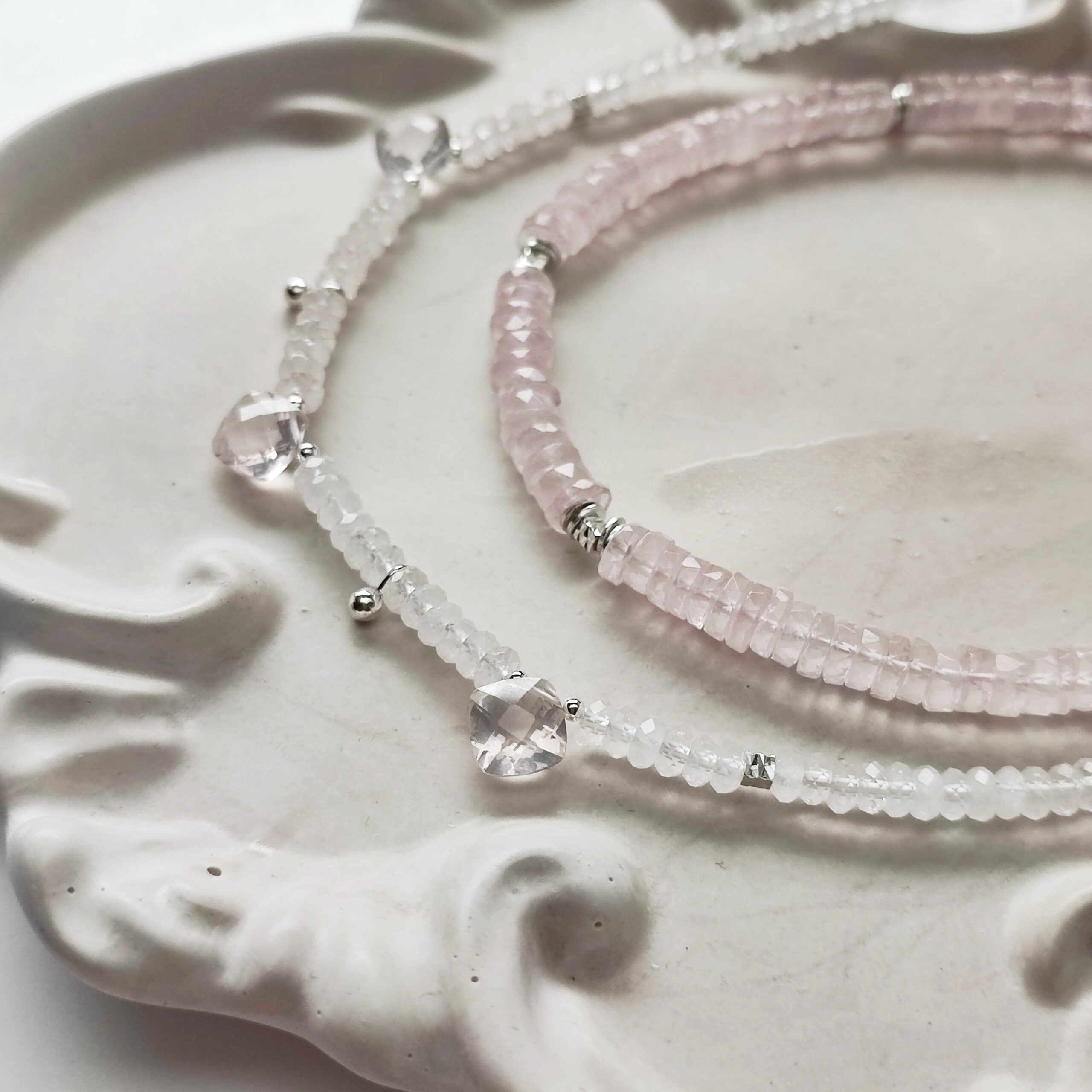 Kamienie w formie fasetowanych iskrzących oponek (3×4mm) o delikatnym odcieniu różu. Klejnoty Kwarcu różowego o idelnym szlifie zachwycają grą iskrzenia i przejrzystością.