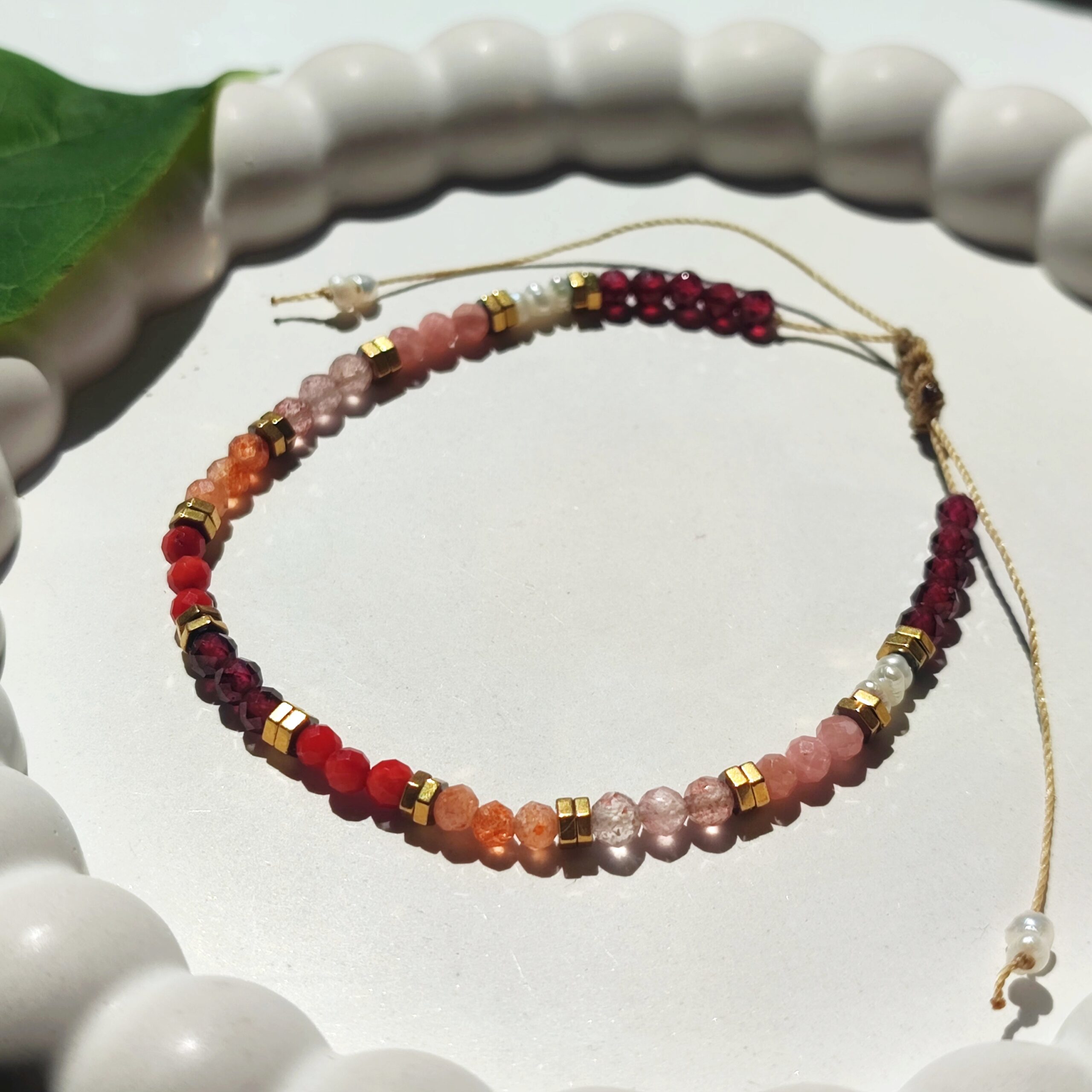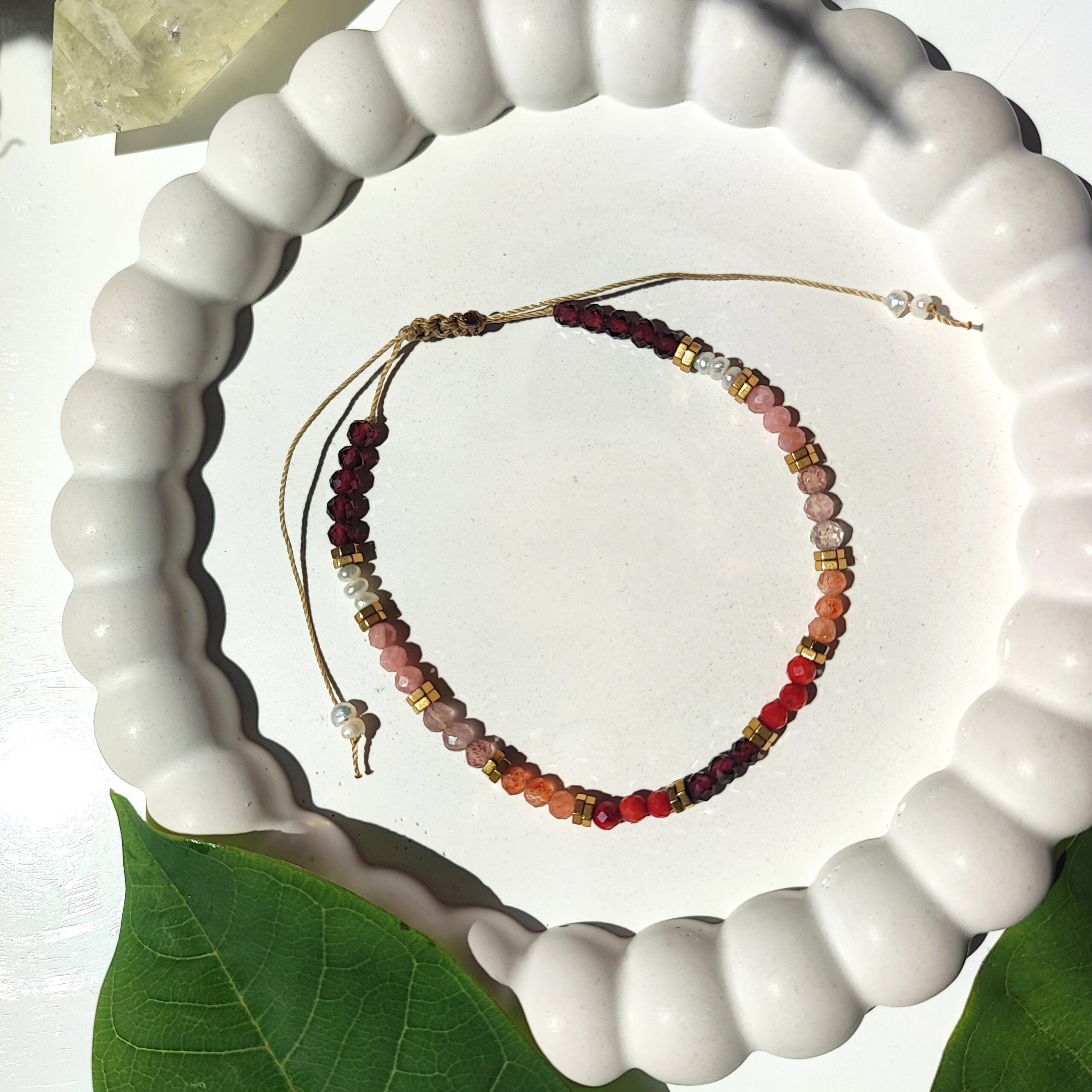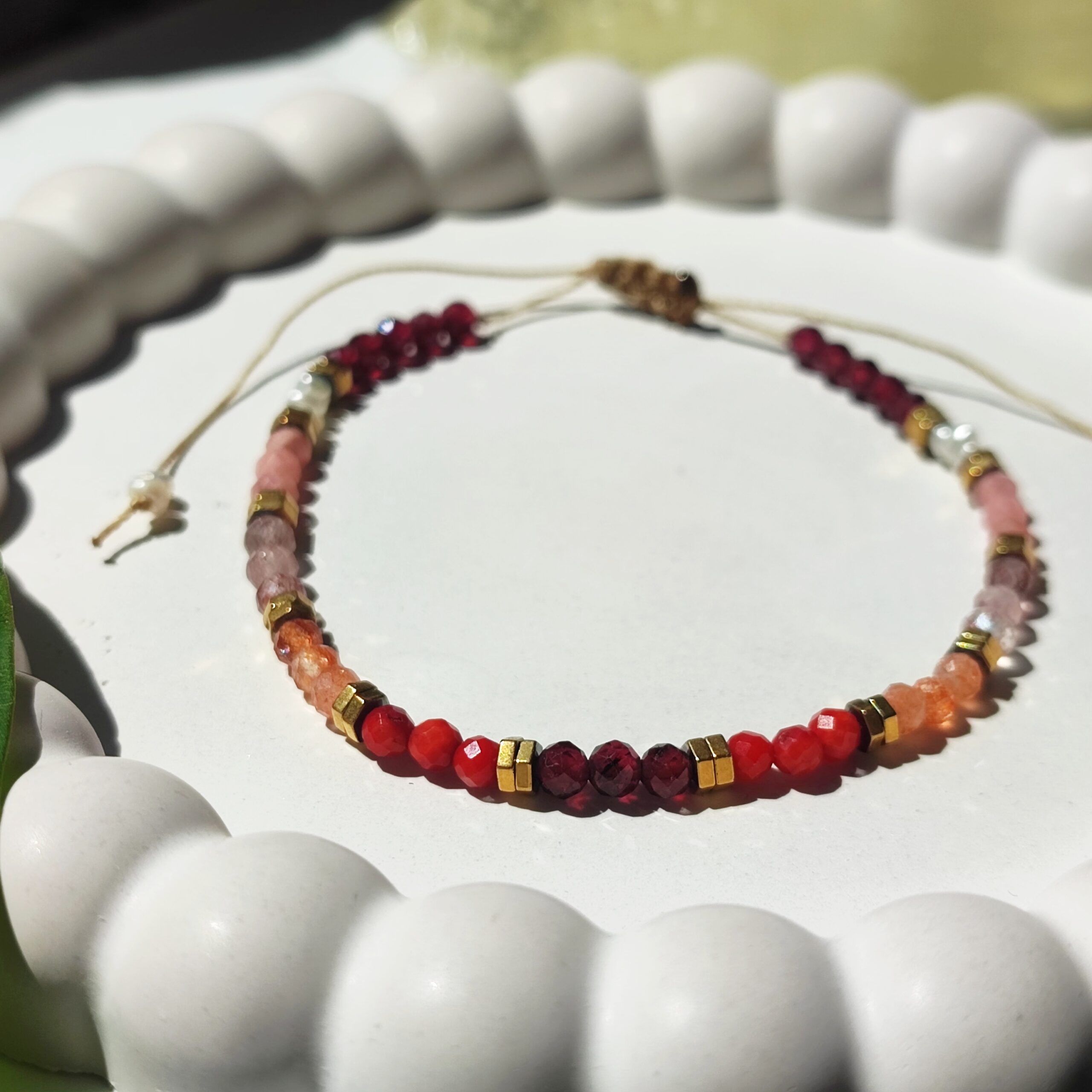 Ręcznie wykonana bransoletka inspirowana tym, co w naturze najpiękniejsze – energią, kolorem i subtelnością kobiecej mocy. Na wytrzymałym, beżowym sznureczku osadzono misterny układ naturalnych kamieni: fasetowane kuleczki granatu, czerwonego koralowca, kamienia słonecznego, kwarcu truskawkowego, rodochrozytu oraz nieregularne perły. Całość uzupełniają złote przekładki z hematytu – dodające całości elegancji i blasku.