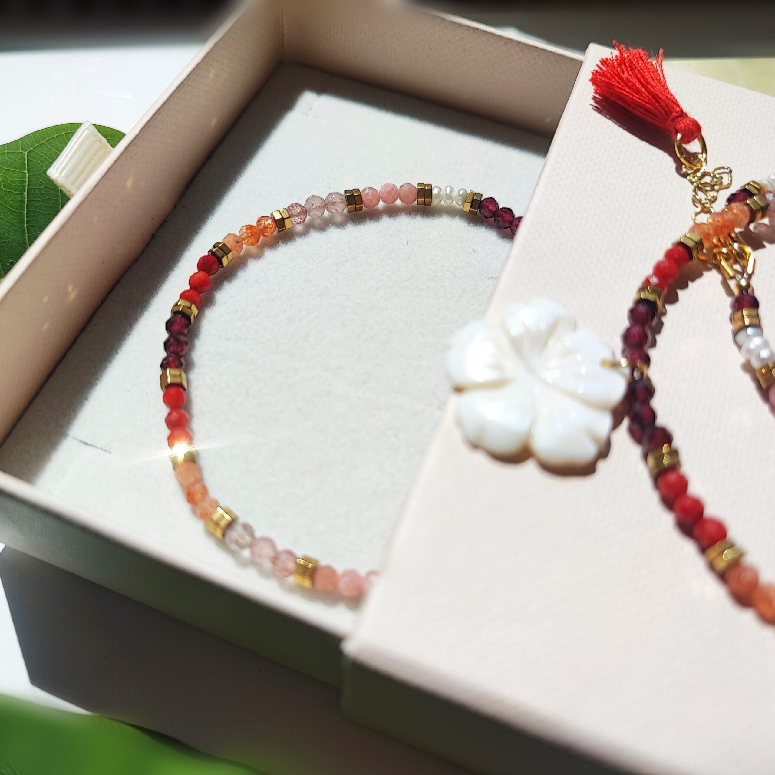 Bransoletka zapakowana jest w eleganckie, firmowe pudełeczko – gotowa na prezent lub jako uzupełnienie zestawu z naszyjnikiem „Hibiskus”.
