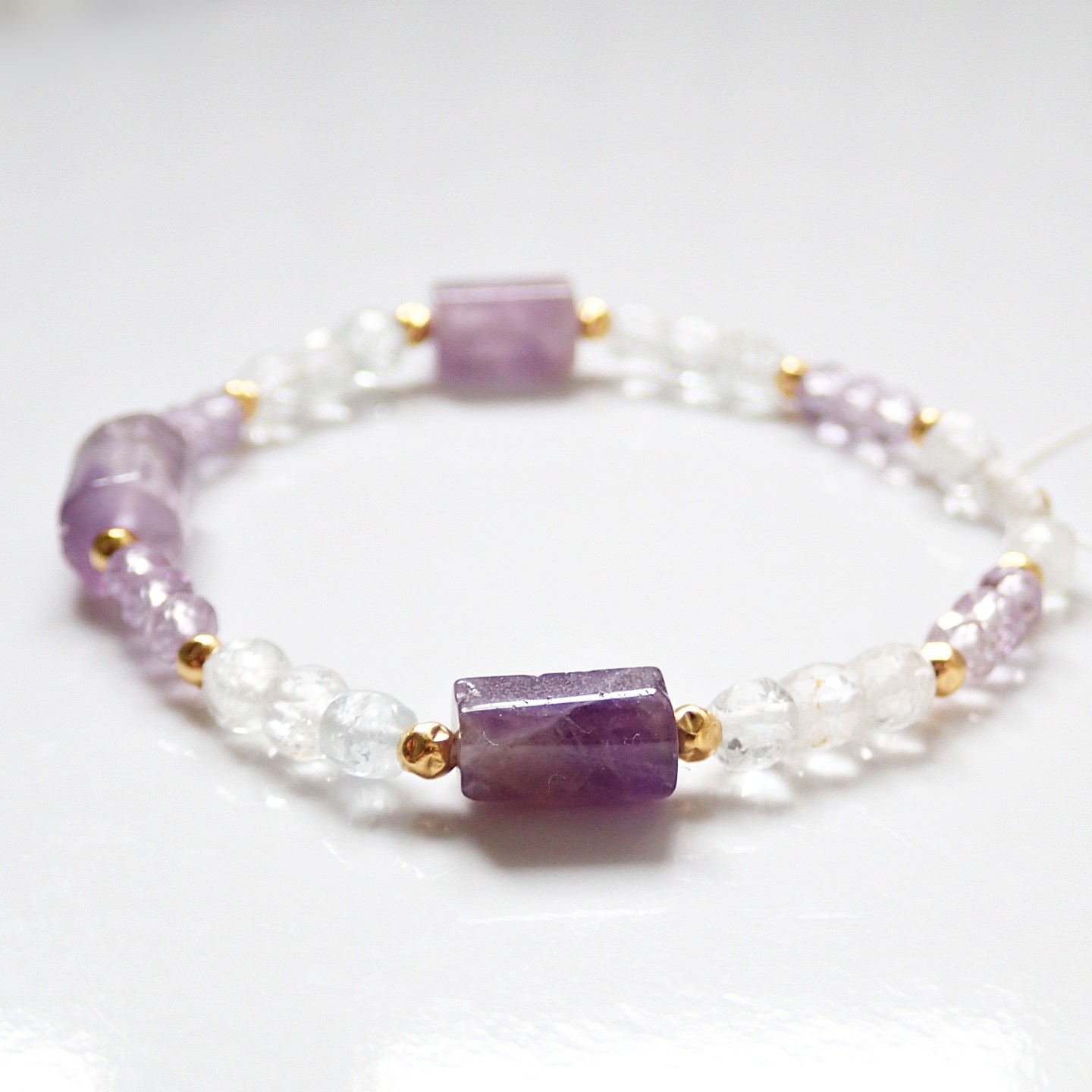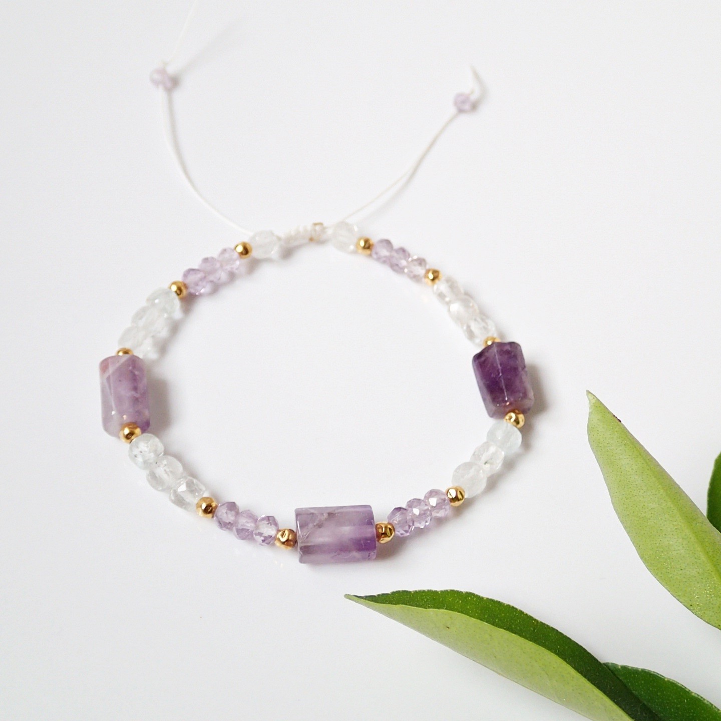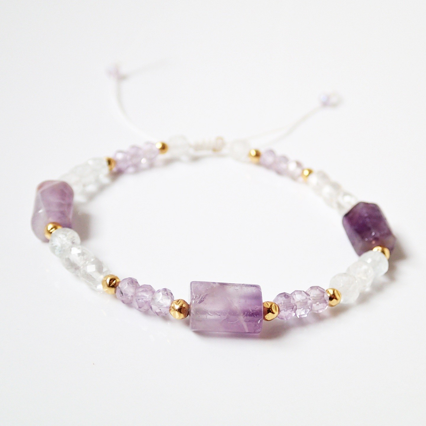 Niepowtarzalna, ręcznie wykonana bransoletka na białym sznureczku. Skomplonowana z trzech bryłek – Ametystu, oponek wysokiej klasy Ametrynu oraz kostek przejrzystego Topazu. Ozdobiona srebrnymi (925), pozłacanymi 24-karatowym złotem kuleczkami o młotkowanej fakturze. Bransoletka ma system przeciąganych sznureczków i łatwo dopasowuje się do nadgarstka. Przy odpowiednim świetle w Topazie obserwować można piękne inkluzje (białe i wielobarwne refleksy).