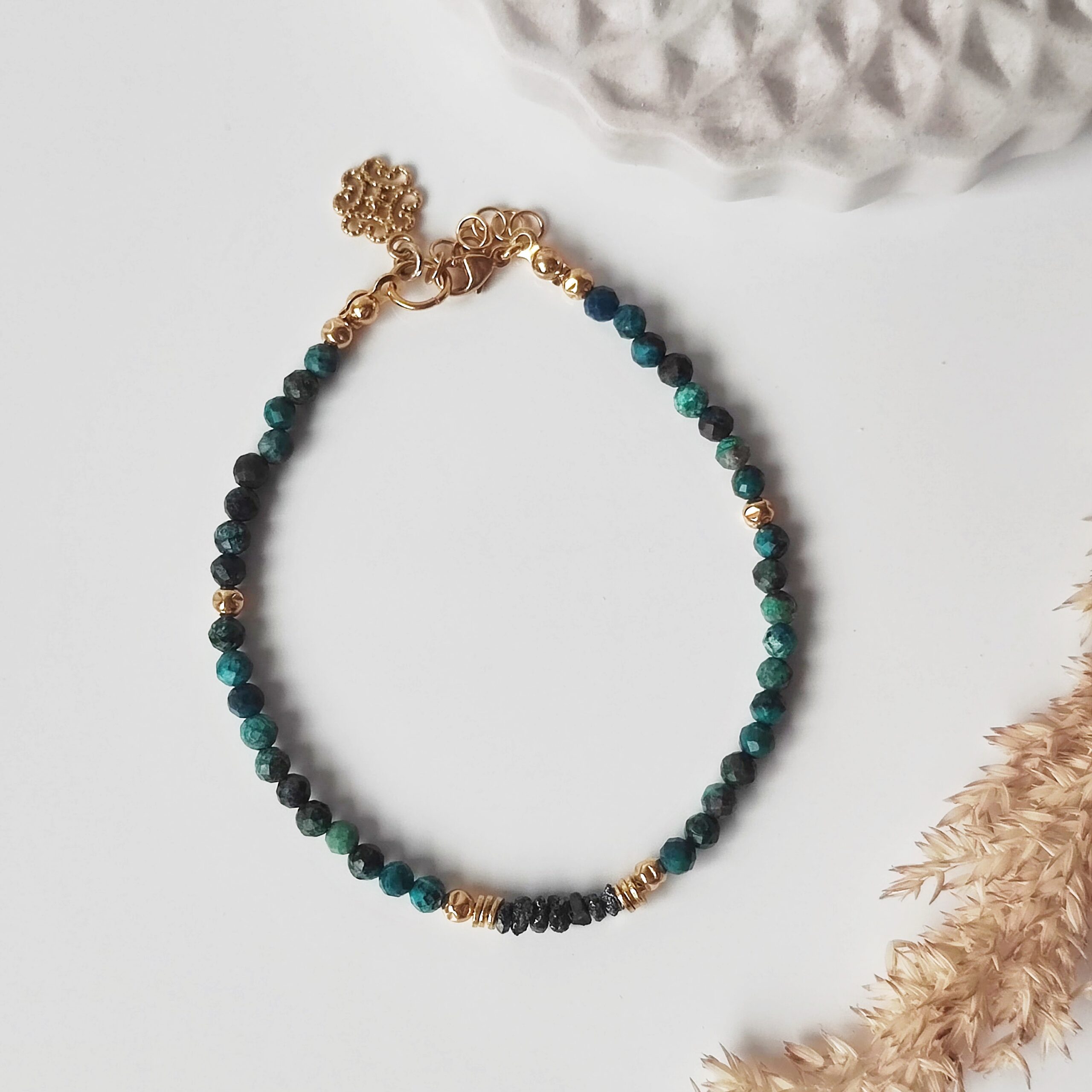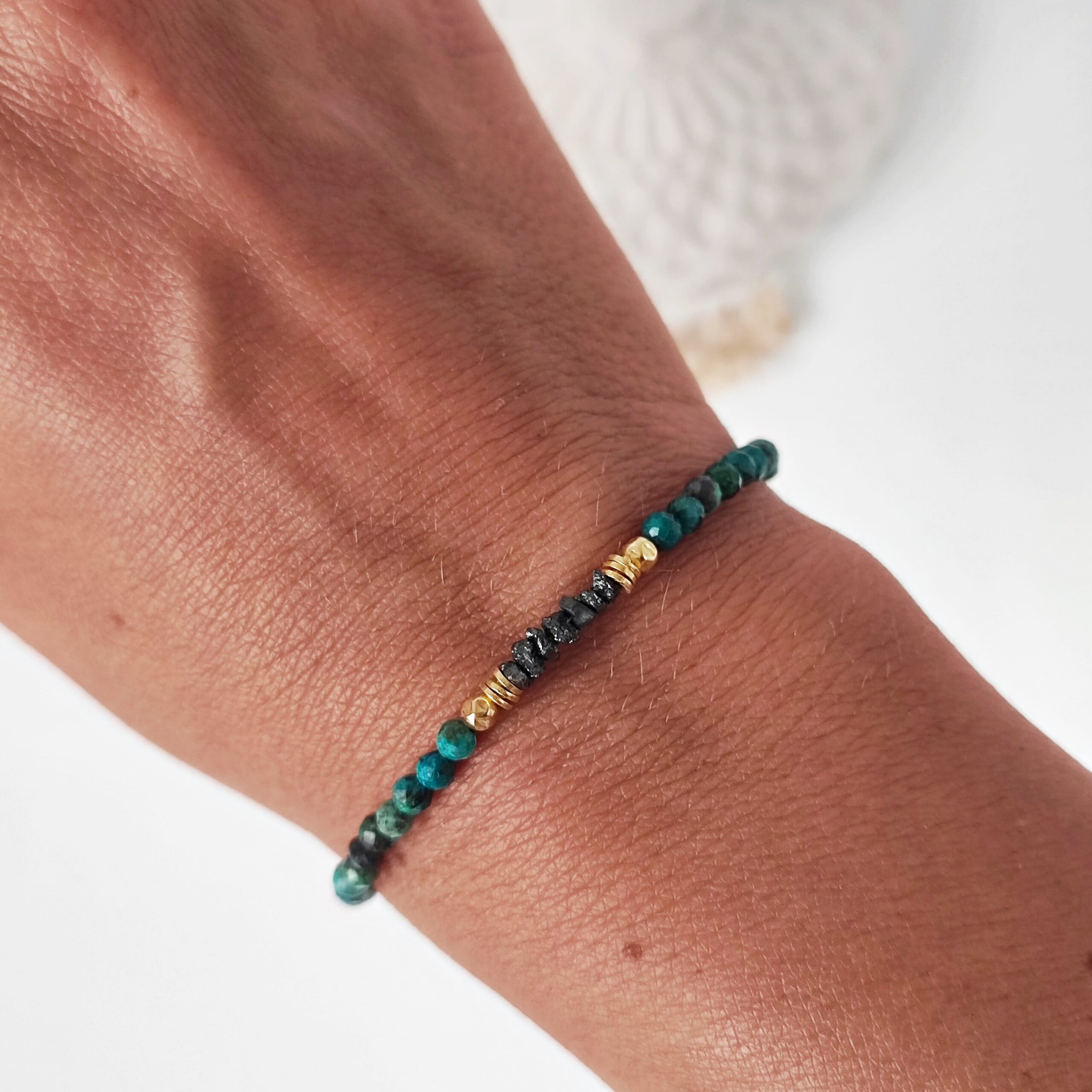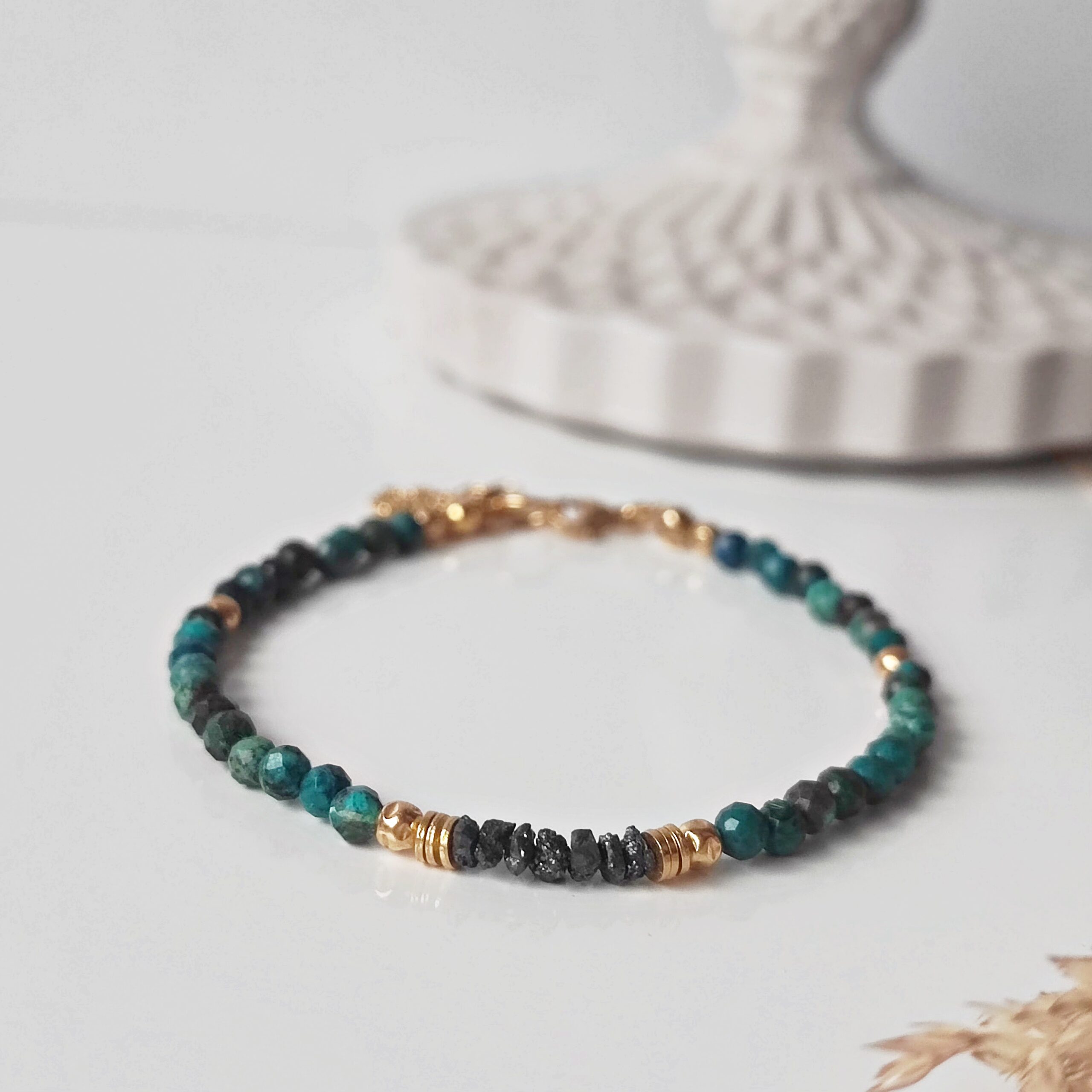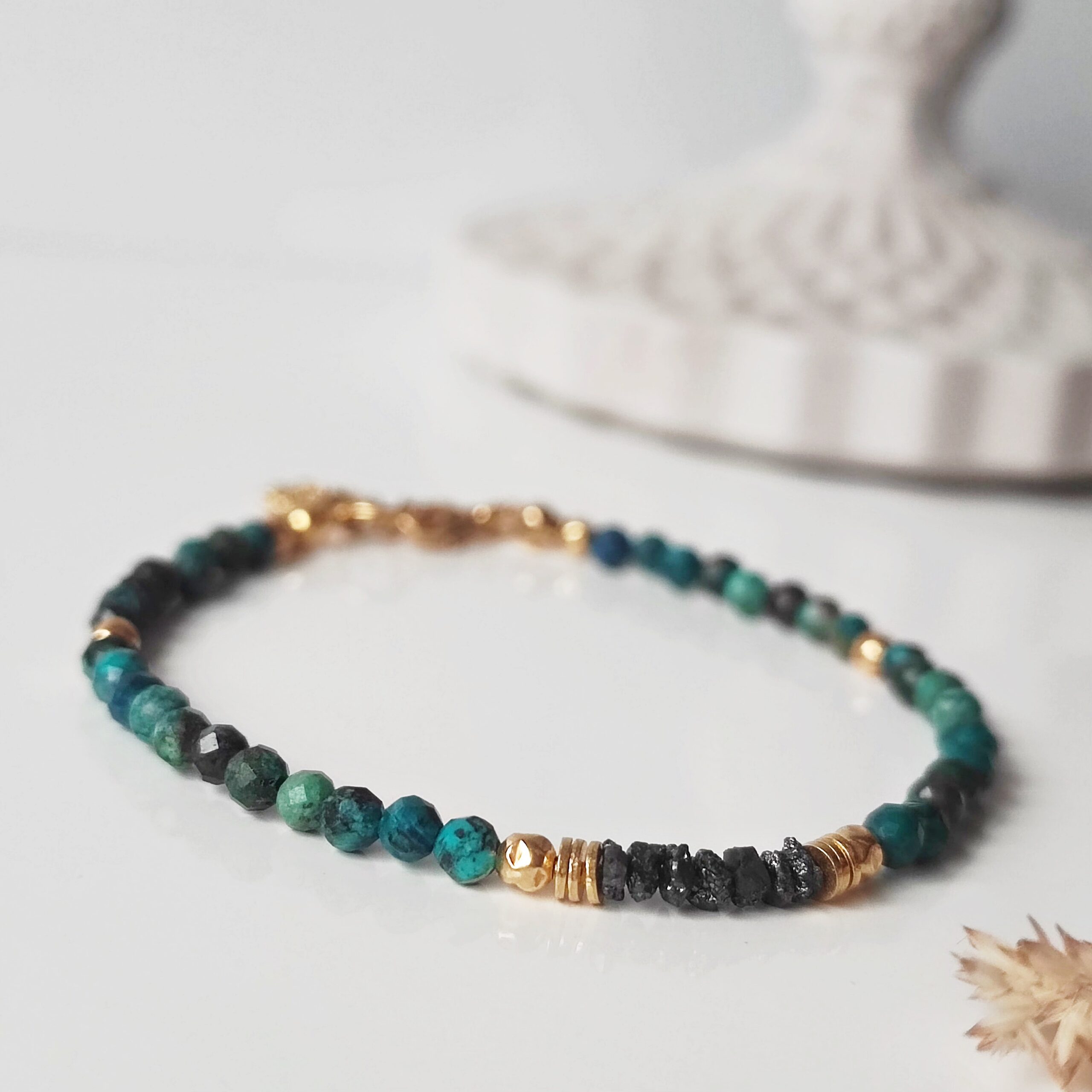 Ręcznie robiona, fantastyczna bransoletka z naturalnych kamieni: szlachetnego czarnego Diamentu Karbonado w surowej formie i nieregularnym kształcie oraz kuleczkach Chryzokoli. Wszystkie elementy ozdobne i zapięcia wykonane zostały z srebra najwyższej próby (925) złoconej 24-karatowym złotem.