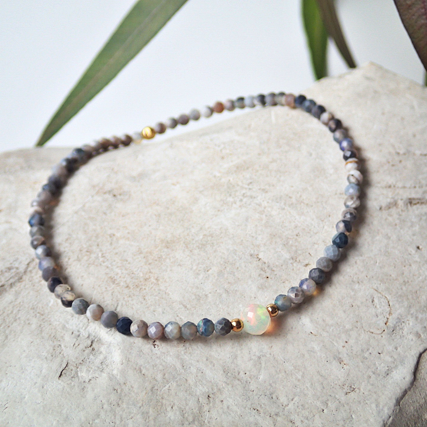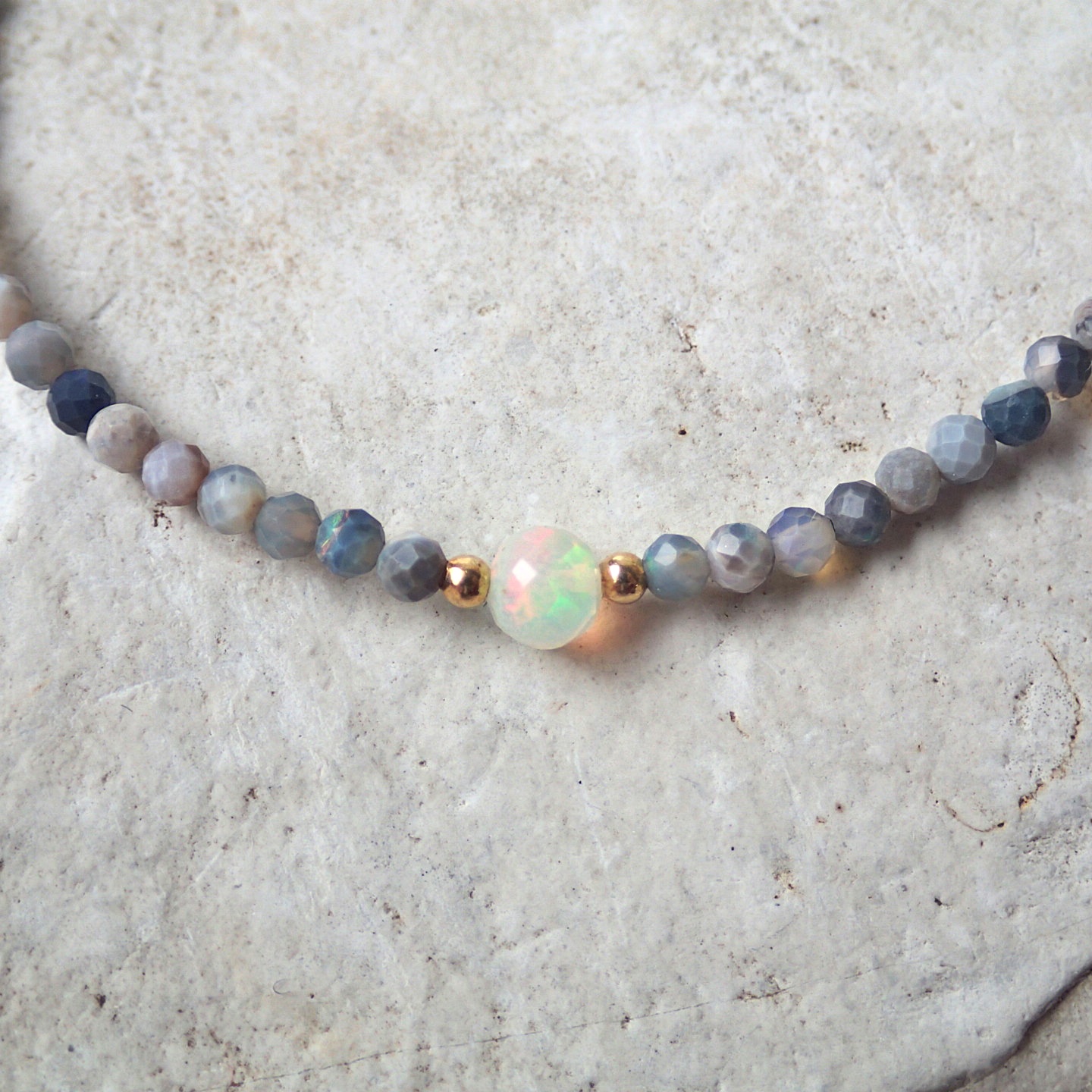 • Opal Welo szlachetnyetiopski (mozaikowe refleksy w świetle w kolorach: zielony, żółty, pomarańczowy ) – kulka ok. 5mm