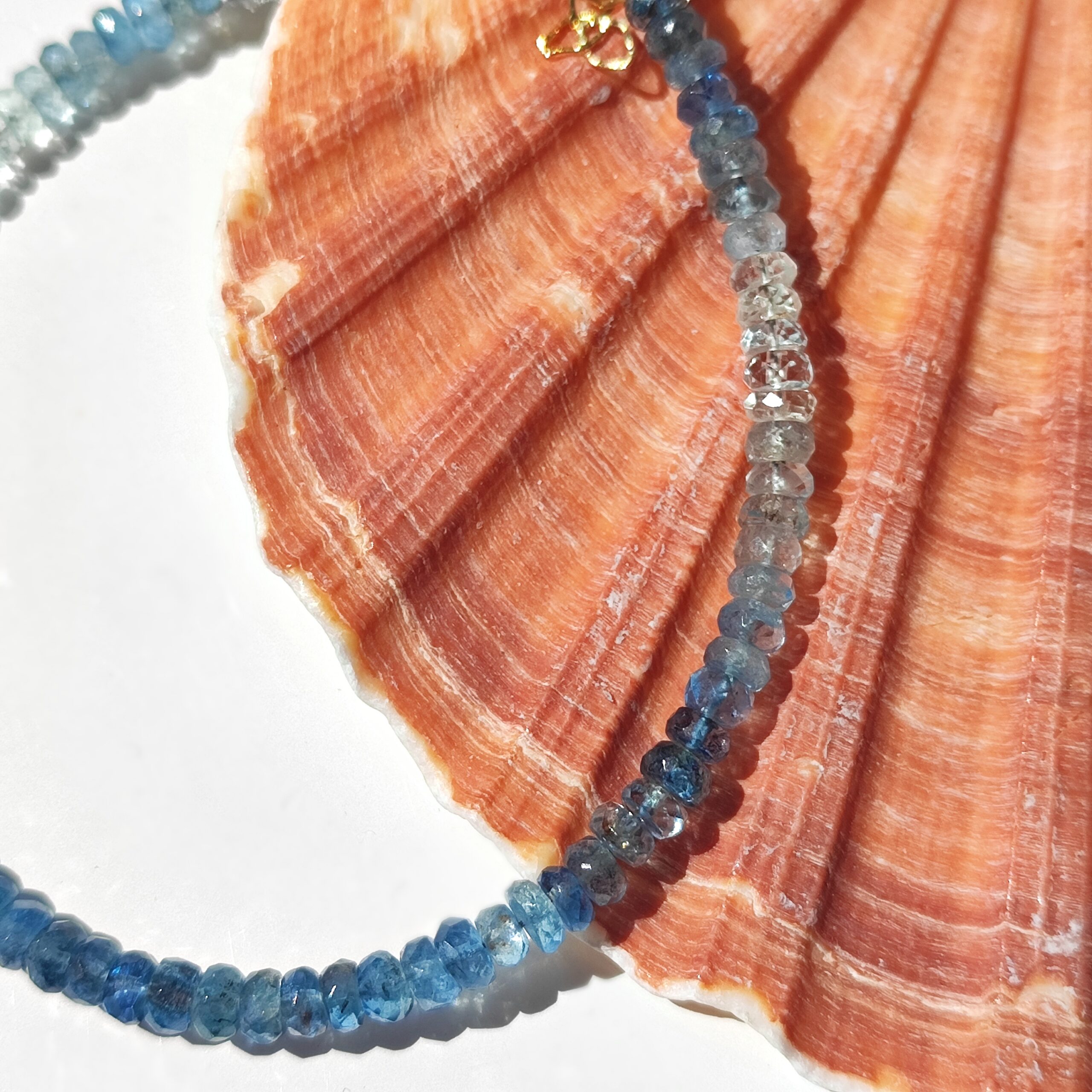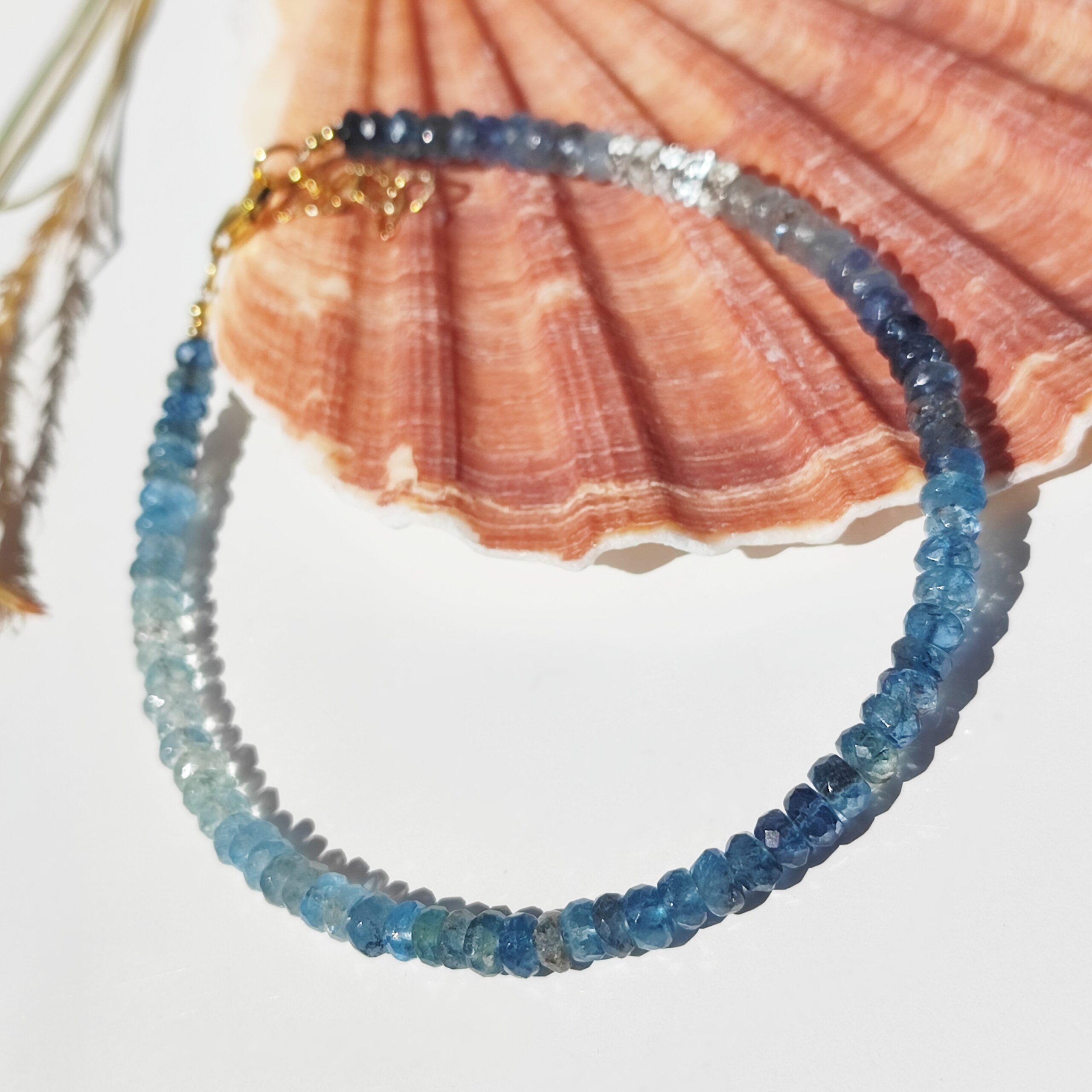 Pełna naturalnej lekkości, ręczniewykonanabransoletka z rzadkiego, naturalnego Akwamarynu mszystego klasy klejnotu. Fasetowane oponki o wymiarach ok. 4×3mm tworzą subtelną kompozycję odcieni – od mlecznobiałych i przezroczystych po delikatne błękity, niebieskości i chłodne szarości. Całość jest chłodna, eteryczna, niemal lodowa.