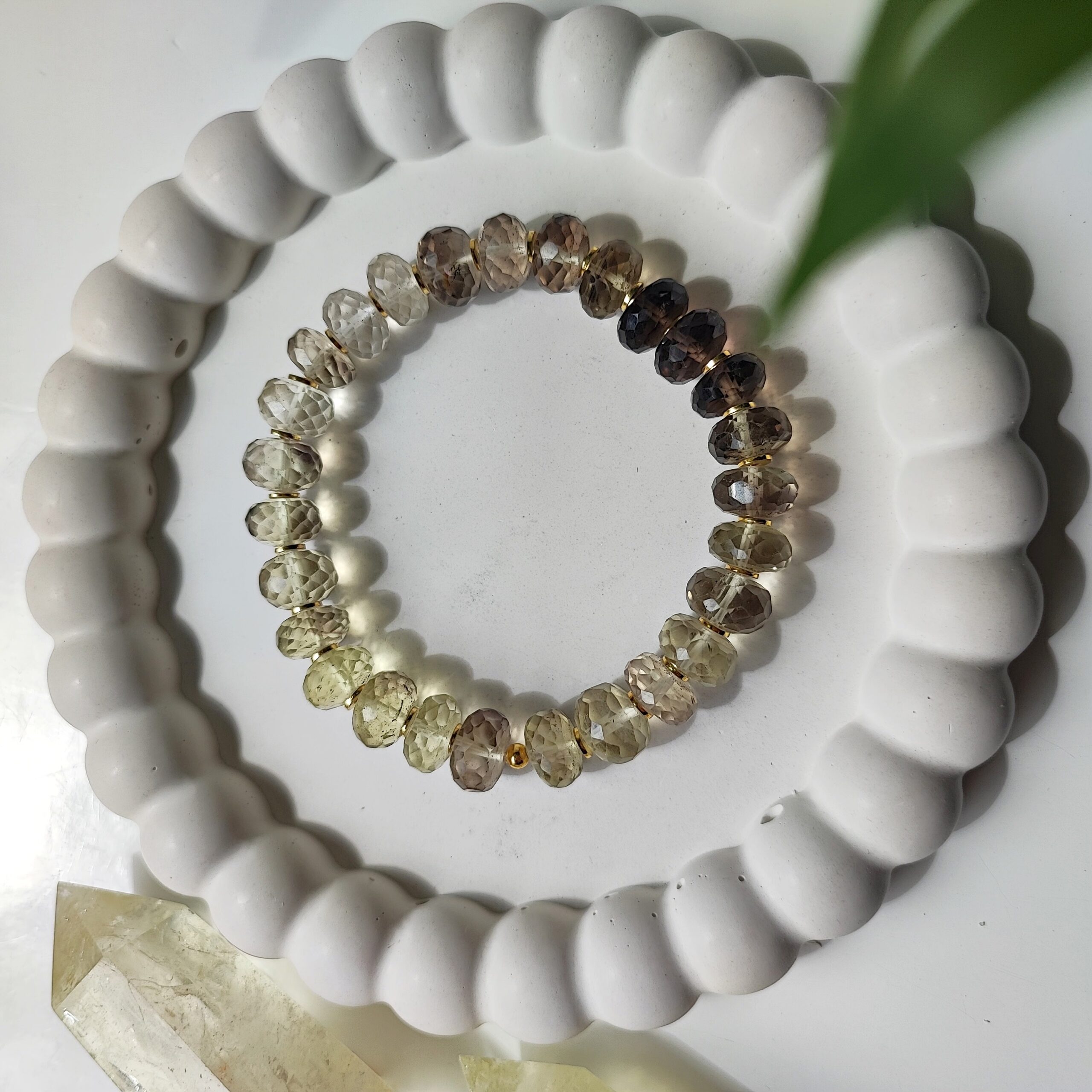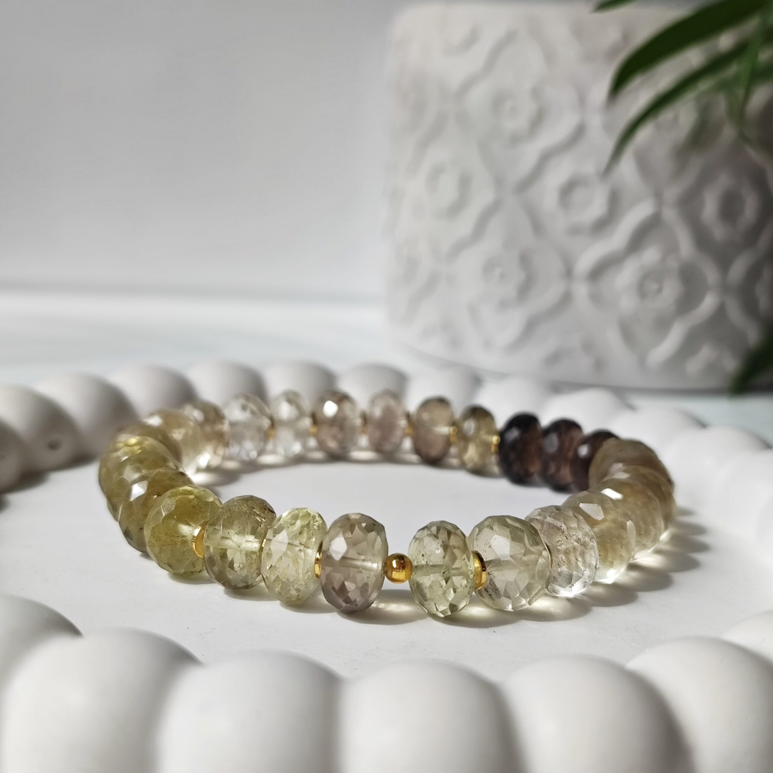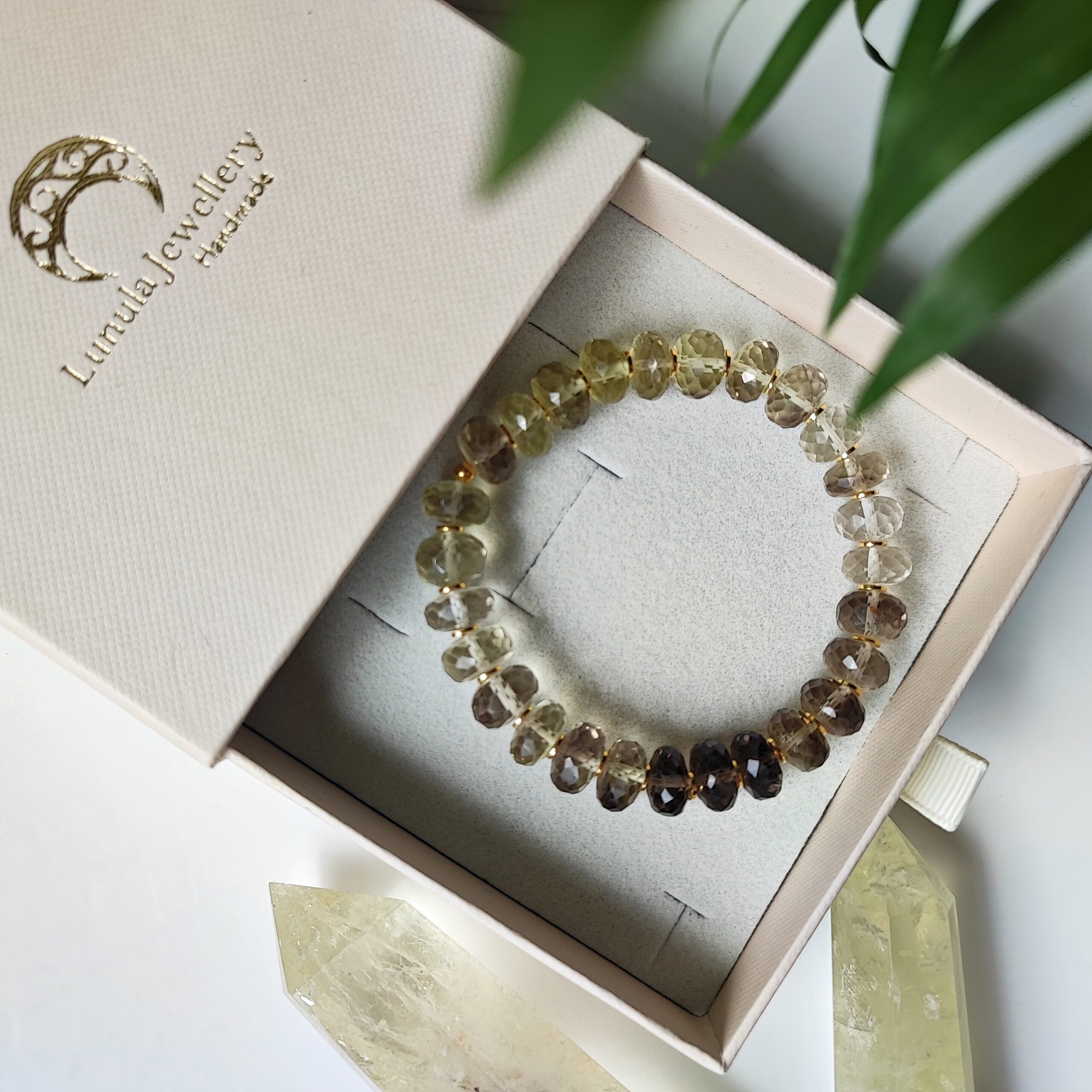 Bransoletka zachwyca subtelną grą barw – od jasnych, słonecznych tonów aż po głębokie, cytrynowe odcienie, na brązowo-szarych kończąc. Użyty Kwarc Cytrynowy w fasetowanym szlifie (oponki 10×6 mm) pięknie odbija światło, nadając całości elegancki, szlachetny charakter.