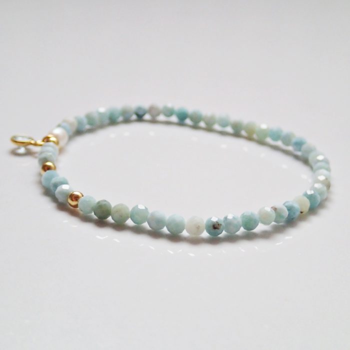 Wyjątkowa, elegancka bransoletka, ręcznie wykonana z naturalnego, rzadkiego kamienia – Larimaru, jednej Perły słodkowodnej i naturalnego Topazu pozłacanym okuciu. Ozdobiona srebrnymi (próba 925), pozłacanymi koralikami.