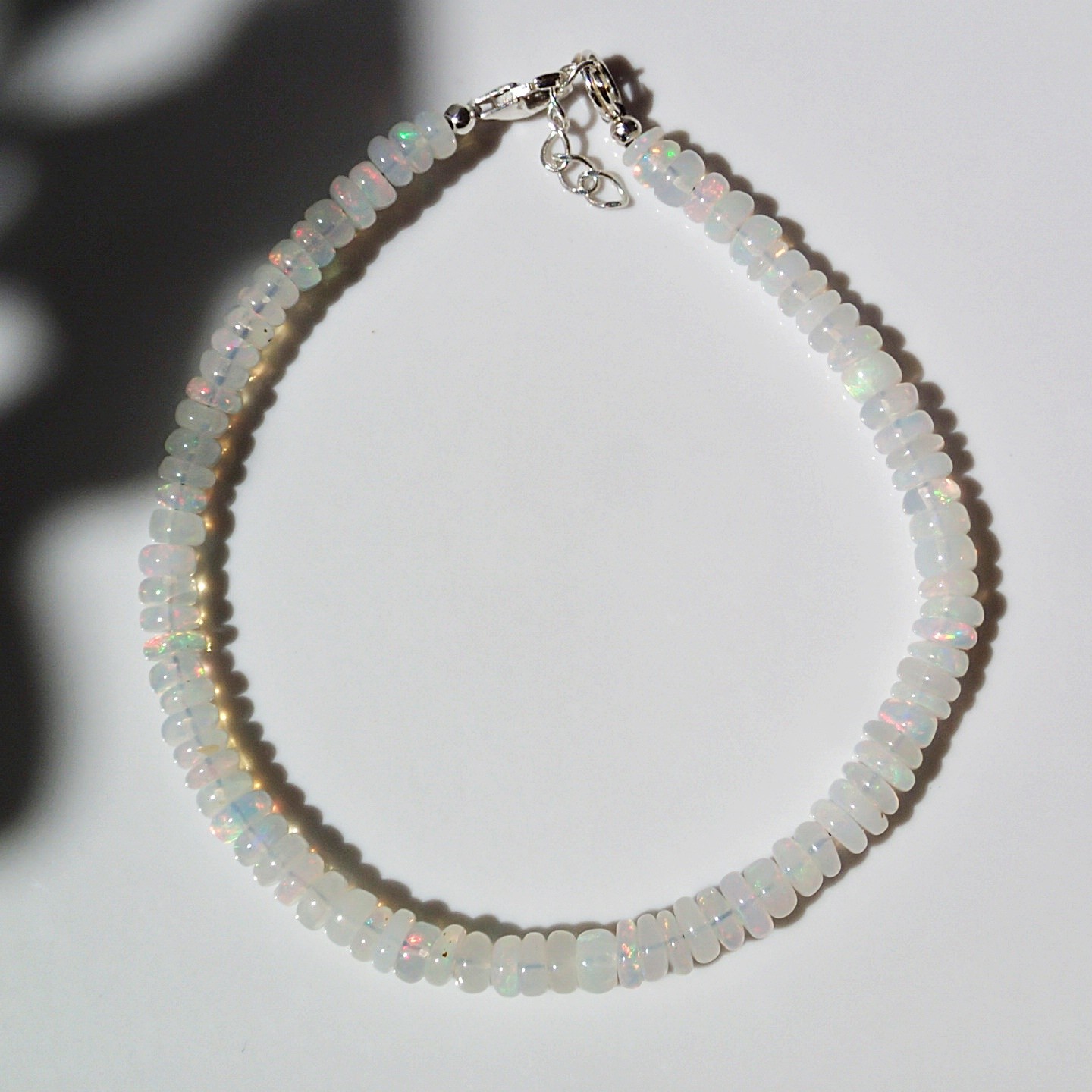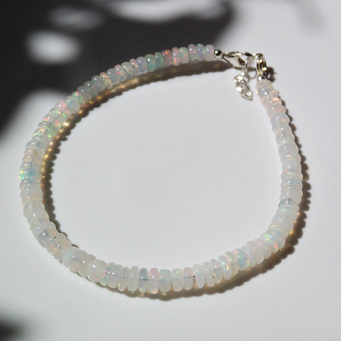 Ręcznie wykonana bransoletka z etiopskiego Opalu Welo o białej barwie i wielobarwnym iskrzeniu. Elementy zapięcia całkowicie wykonane z najwyższej próby srebra.