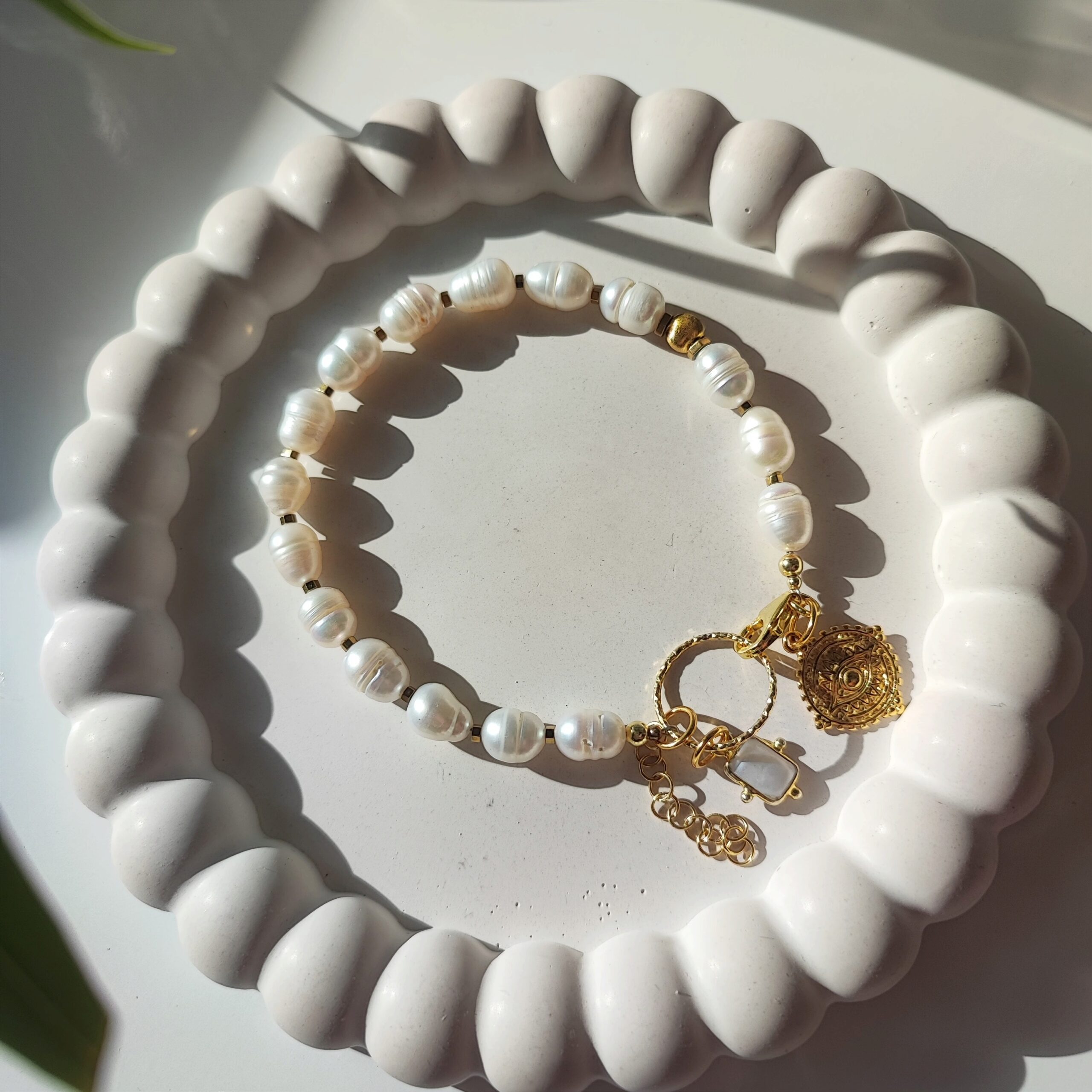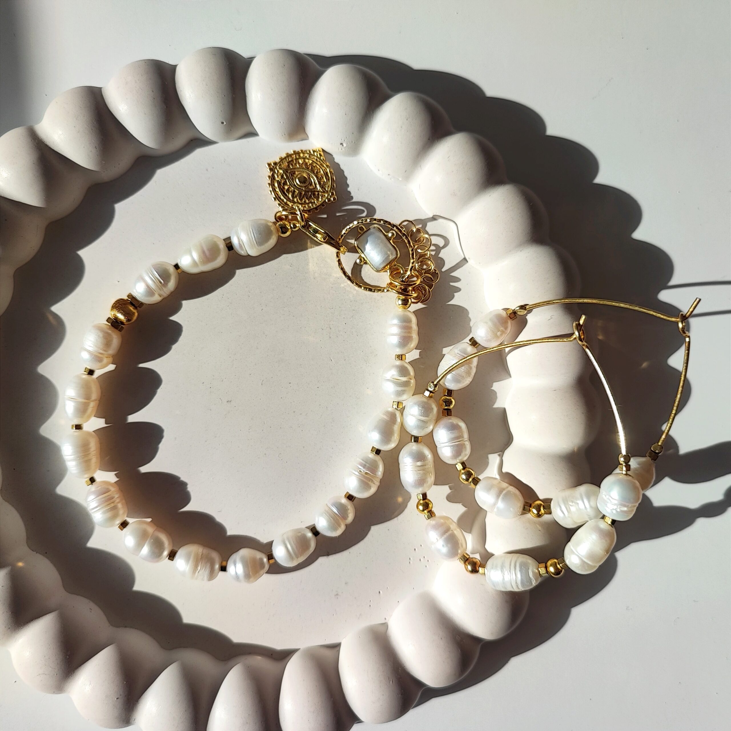 ✨ Połączenie złoconego srebra, złotego hematytu i pereł dla subtelnego kontrastu