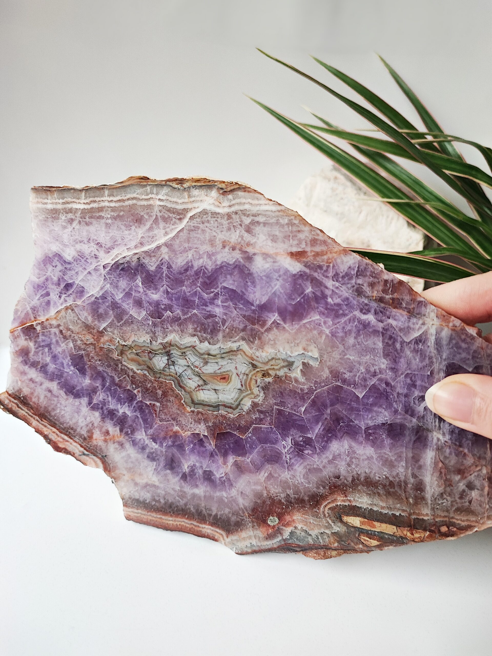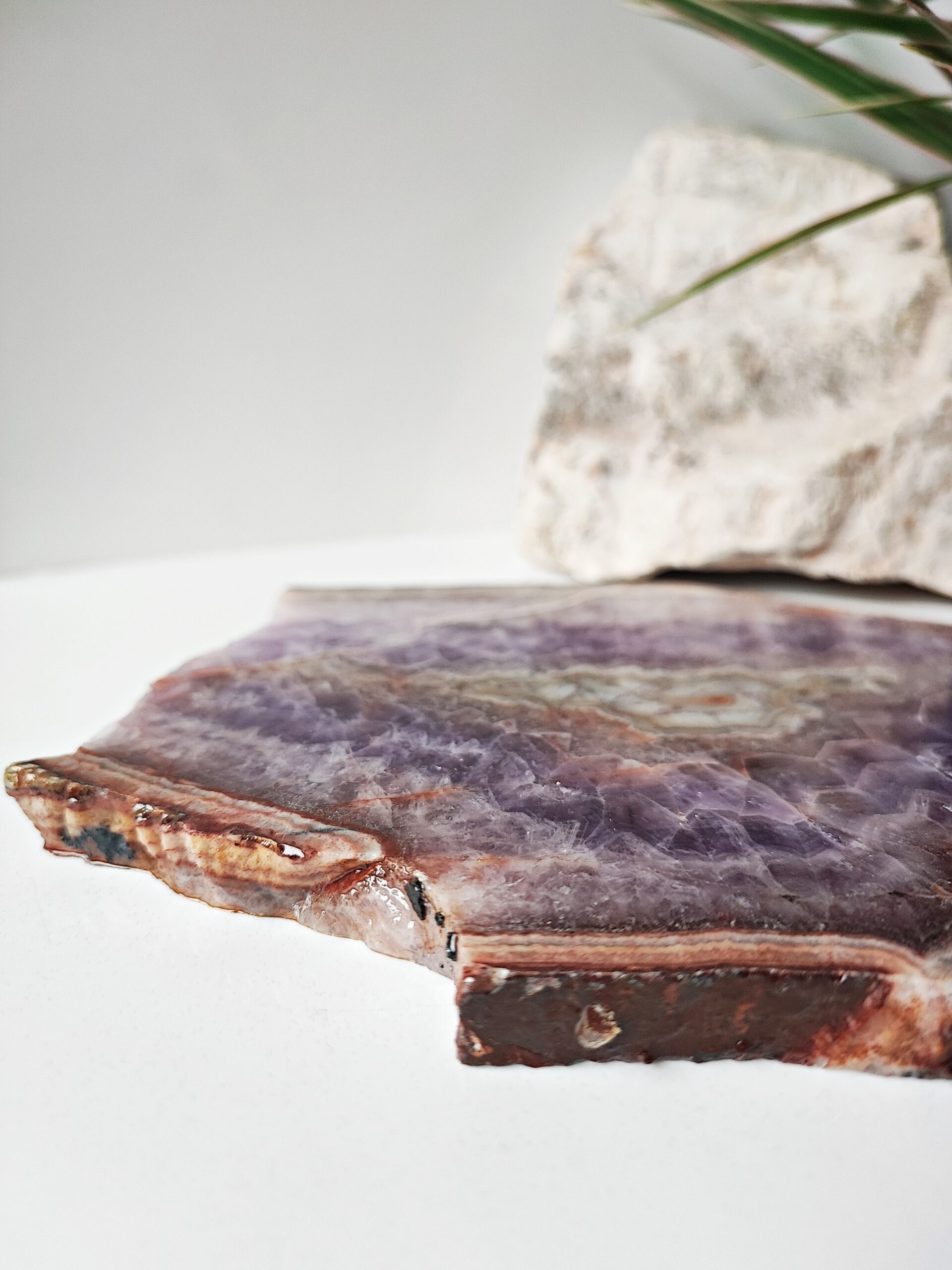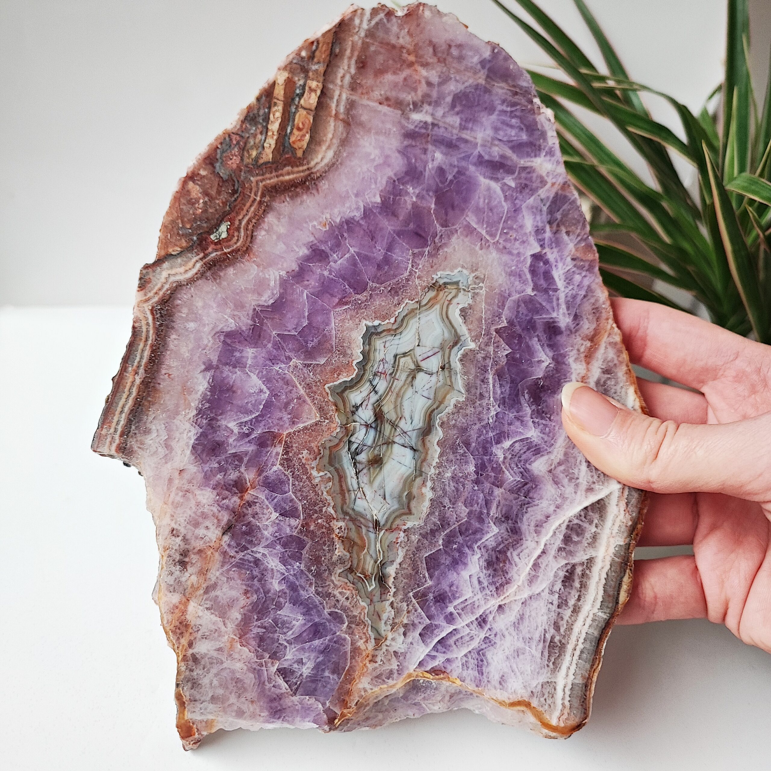 Wyjątkowy, naturalny plaster Ametystu z widocznym pasmem Agatu w centrum. Duży, efektowny egzemplarz o wymiarach około 24×14cm i wadze 500g.
