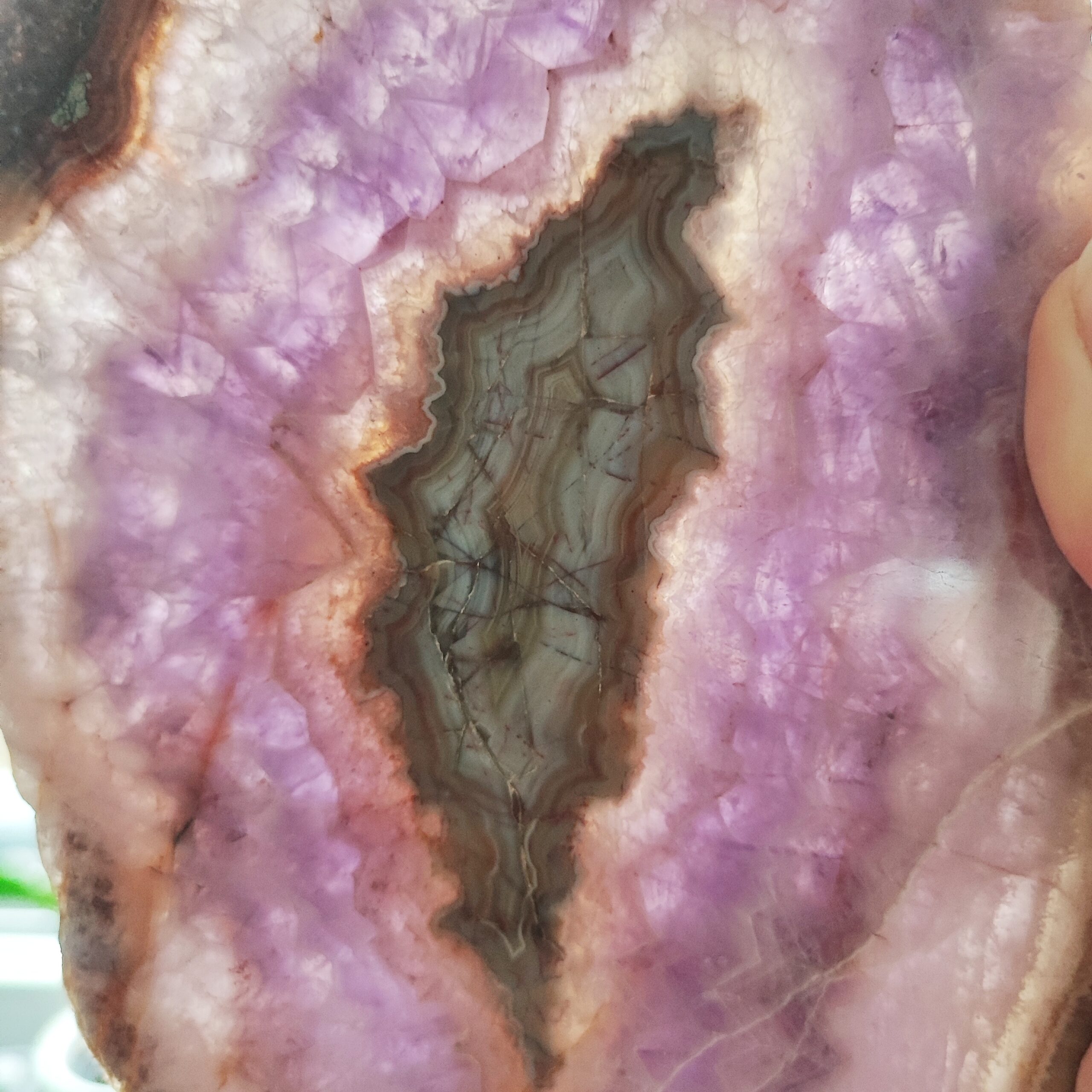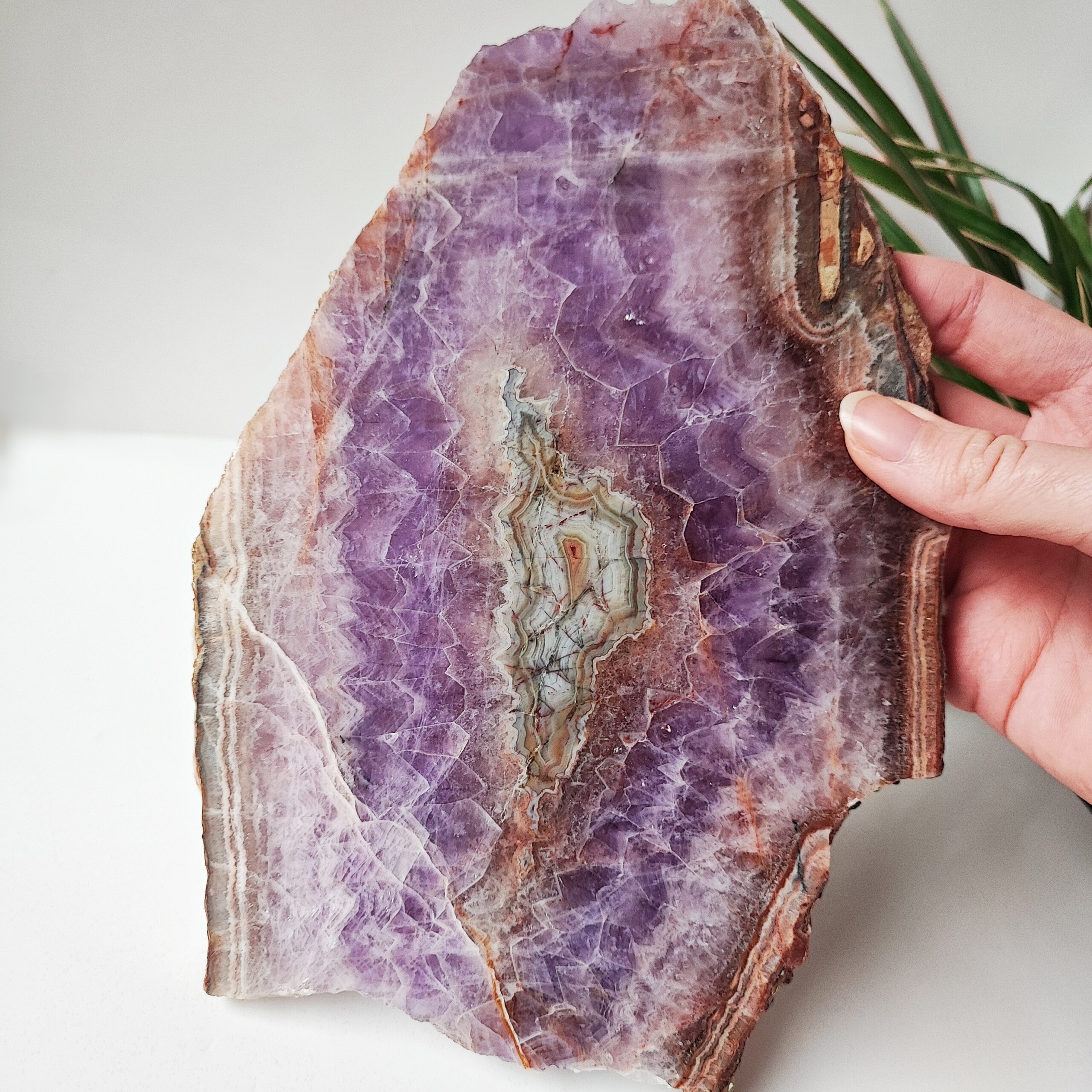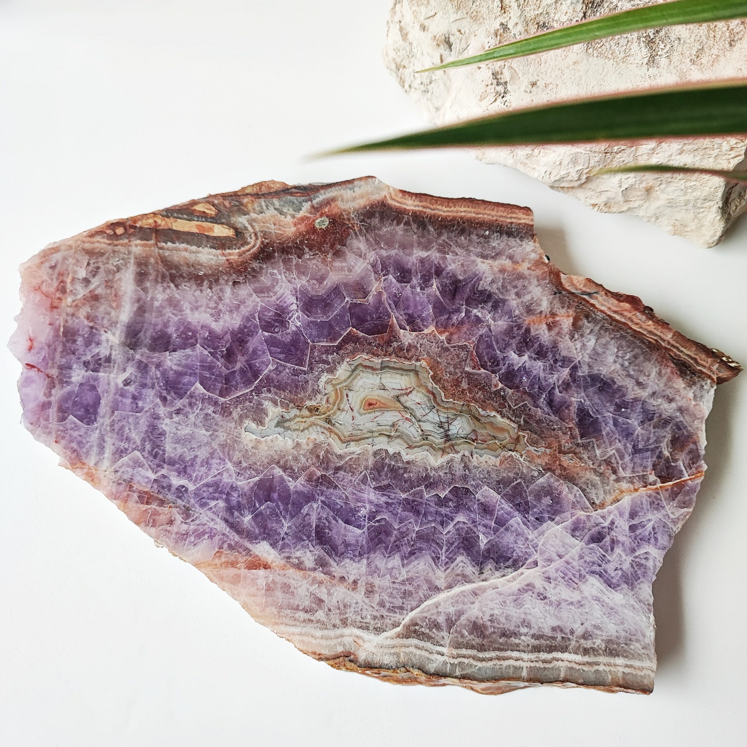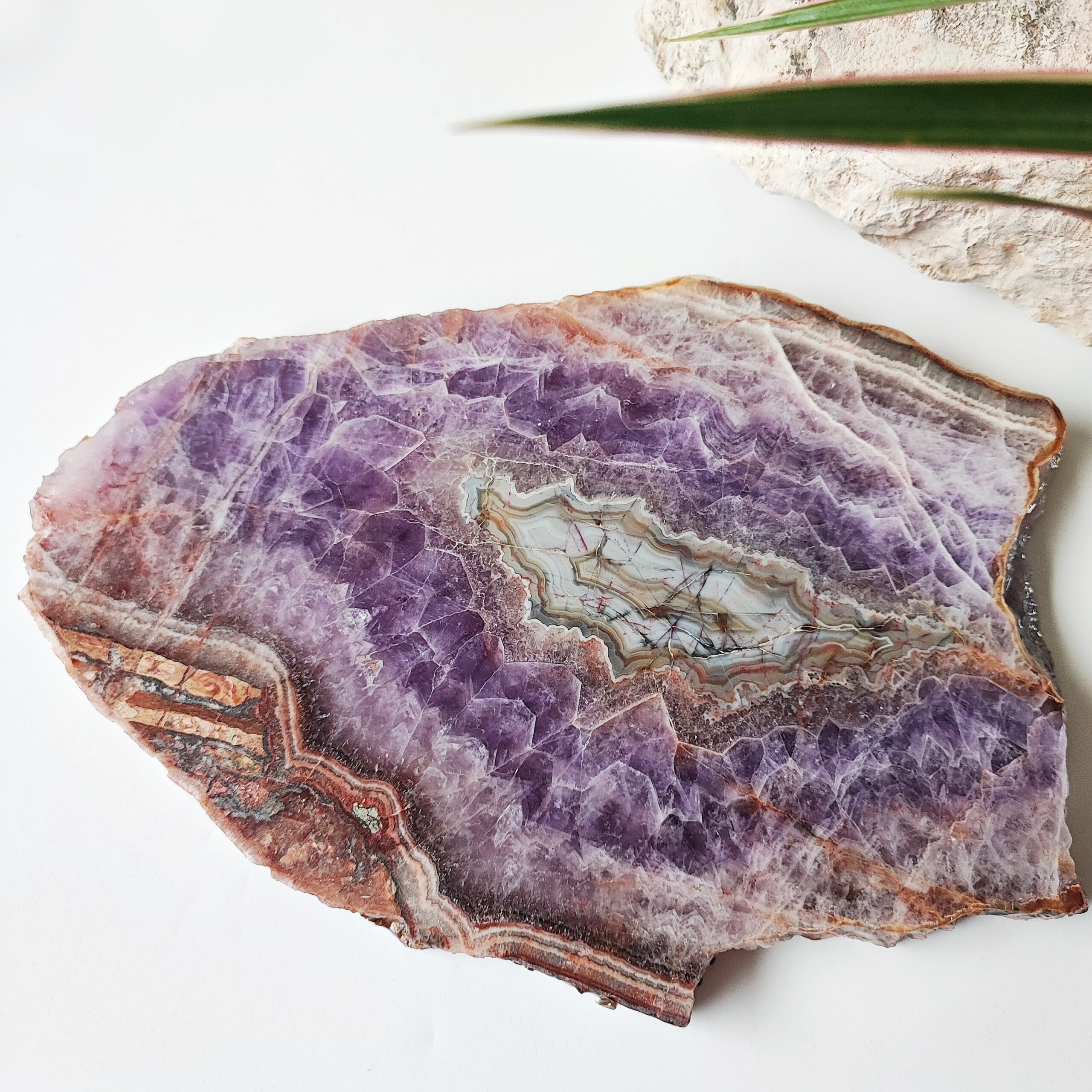Wyjątkowy, naturalny plaster Ametystu z widocznym pasmem Agatu w centrum. Duży, efektowny egzemplarz o wymiarach około 24×14cm i wadze 500g.
