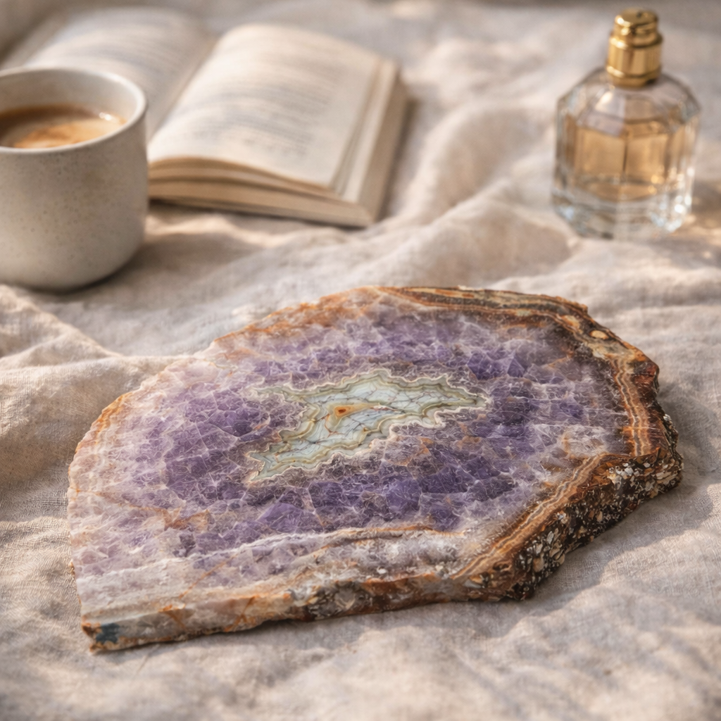 Kamień jest polerowany dwustronnie, dzięki czemu wydobyta została głębia fioletu, struktura kryształów oraz kontrastowe warstwy agatu. Naturalne użylenia i mikropęknięcia są częścią jego autentycznej struktury i świadczą o naturalnym pochodzeniu minerału.