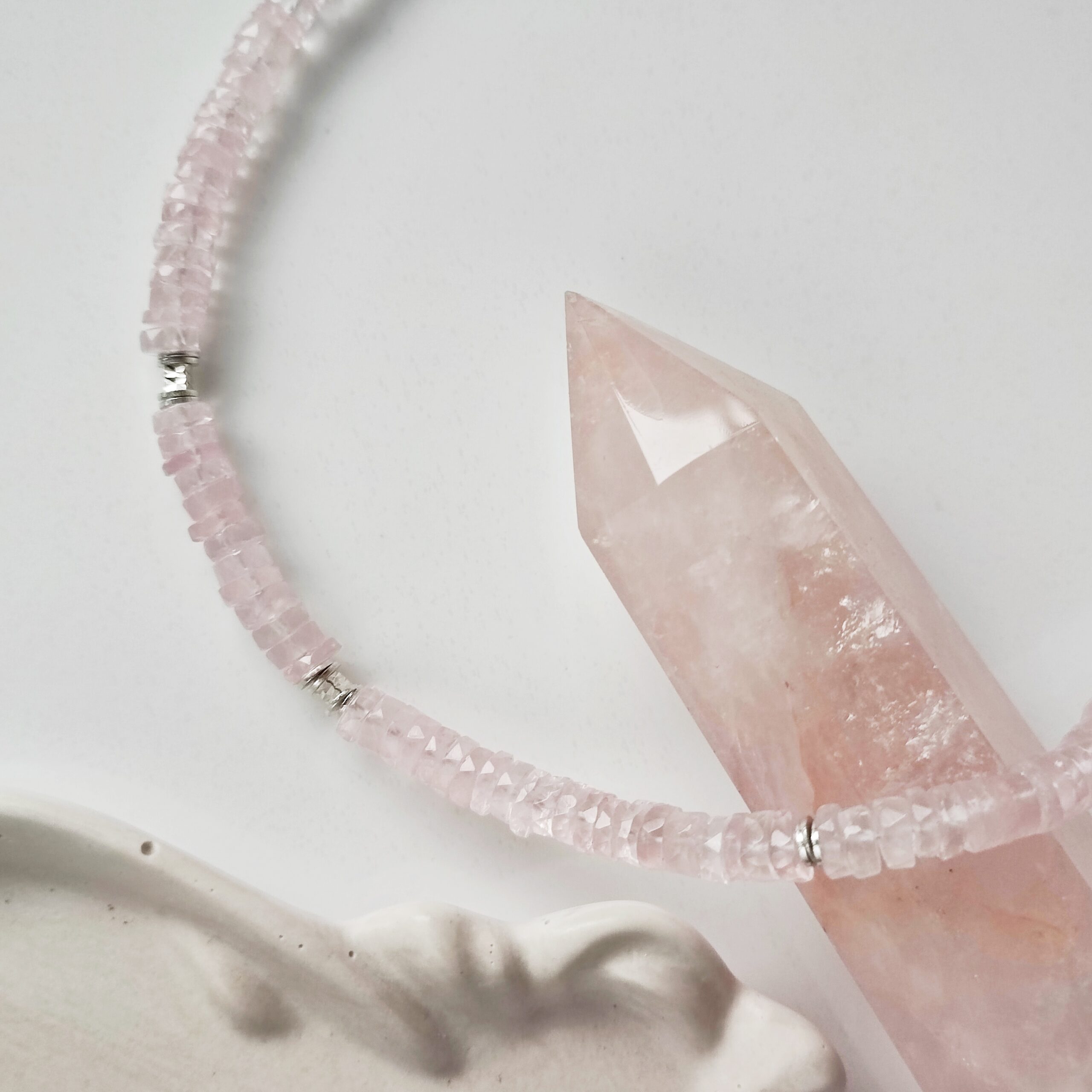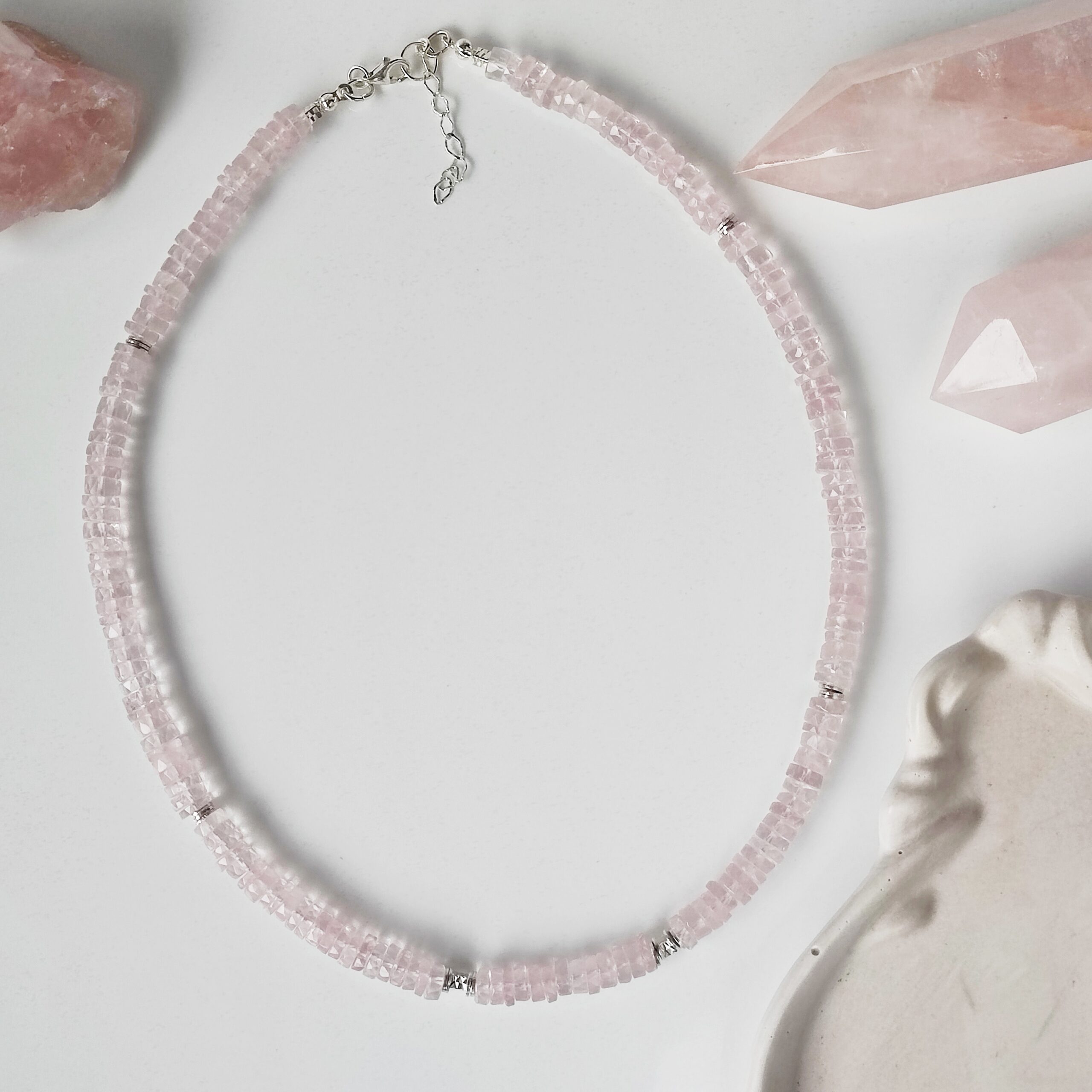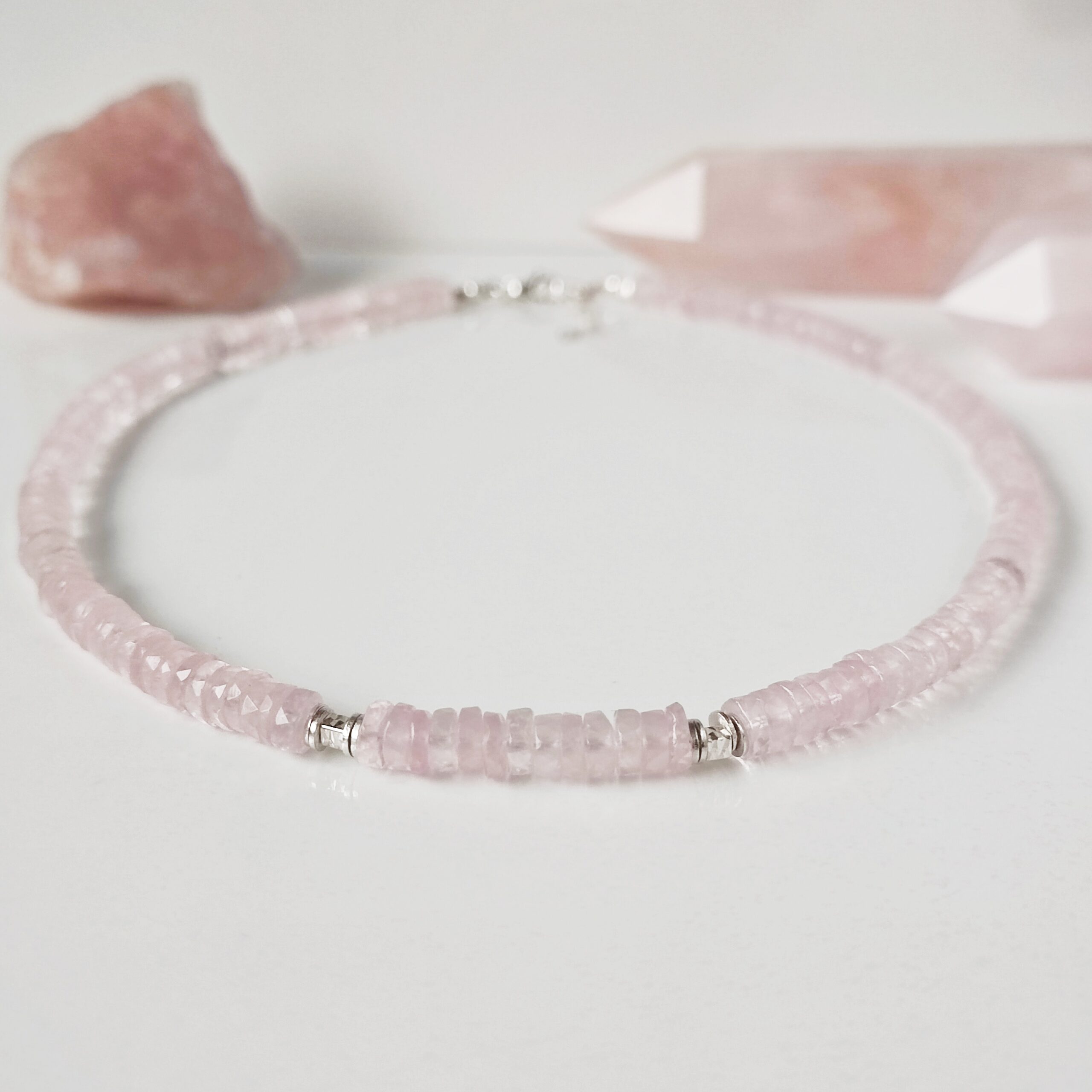 Oferta dotyczy naszyjnika z talarków kwarcu różowego. W galerii pojawiają się również: naszyjnik z oponek Kwarcu różowego zdobiony kwarcem w szlifie poduszkowym i bransoletka z oponek Kwarcu różowego i Morganitu klasy klejnotu oraz obelisk Kwarcu różowego.