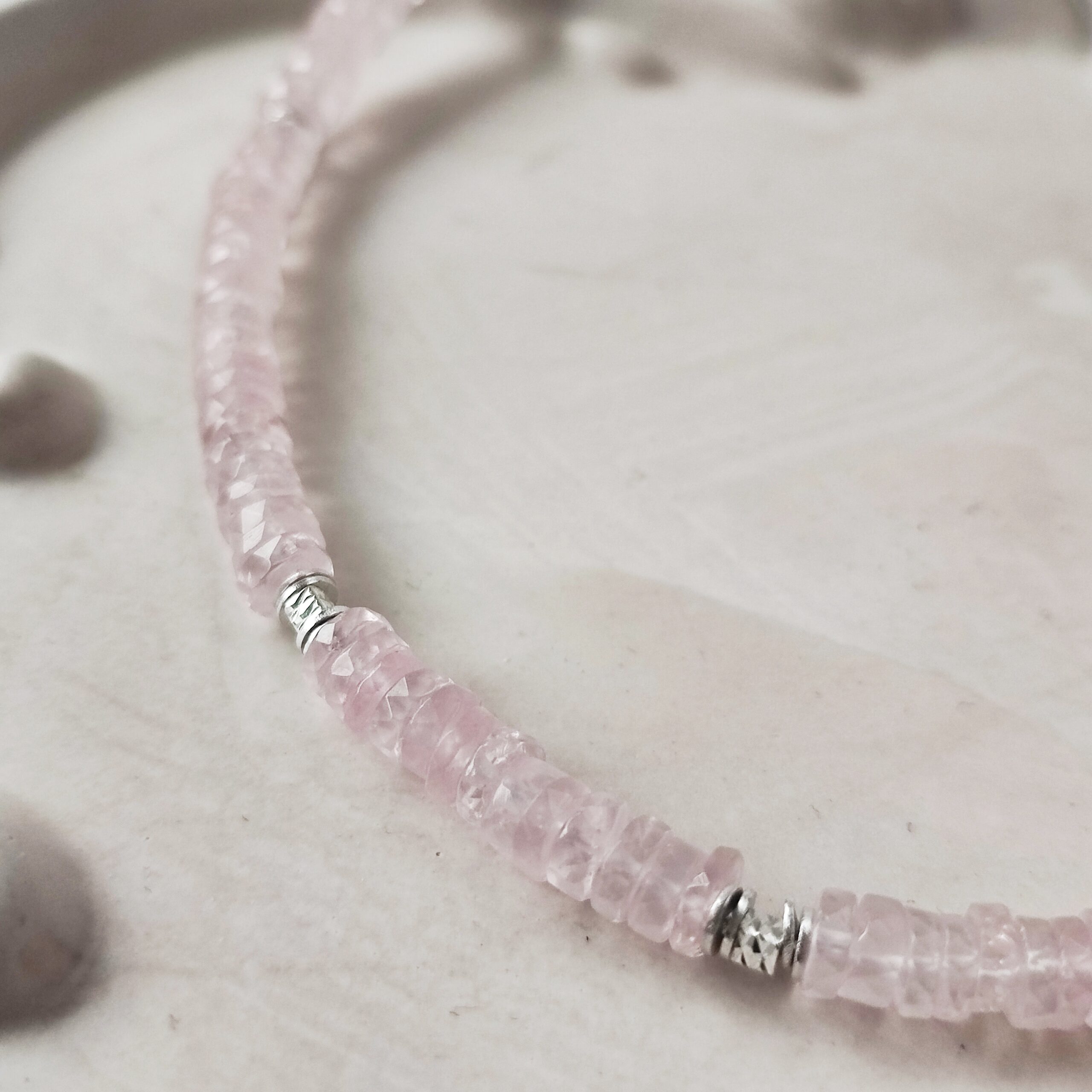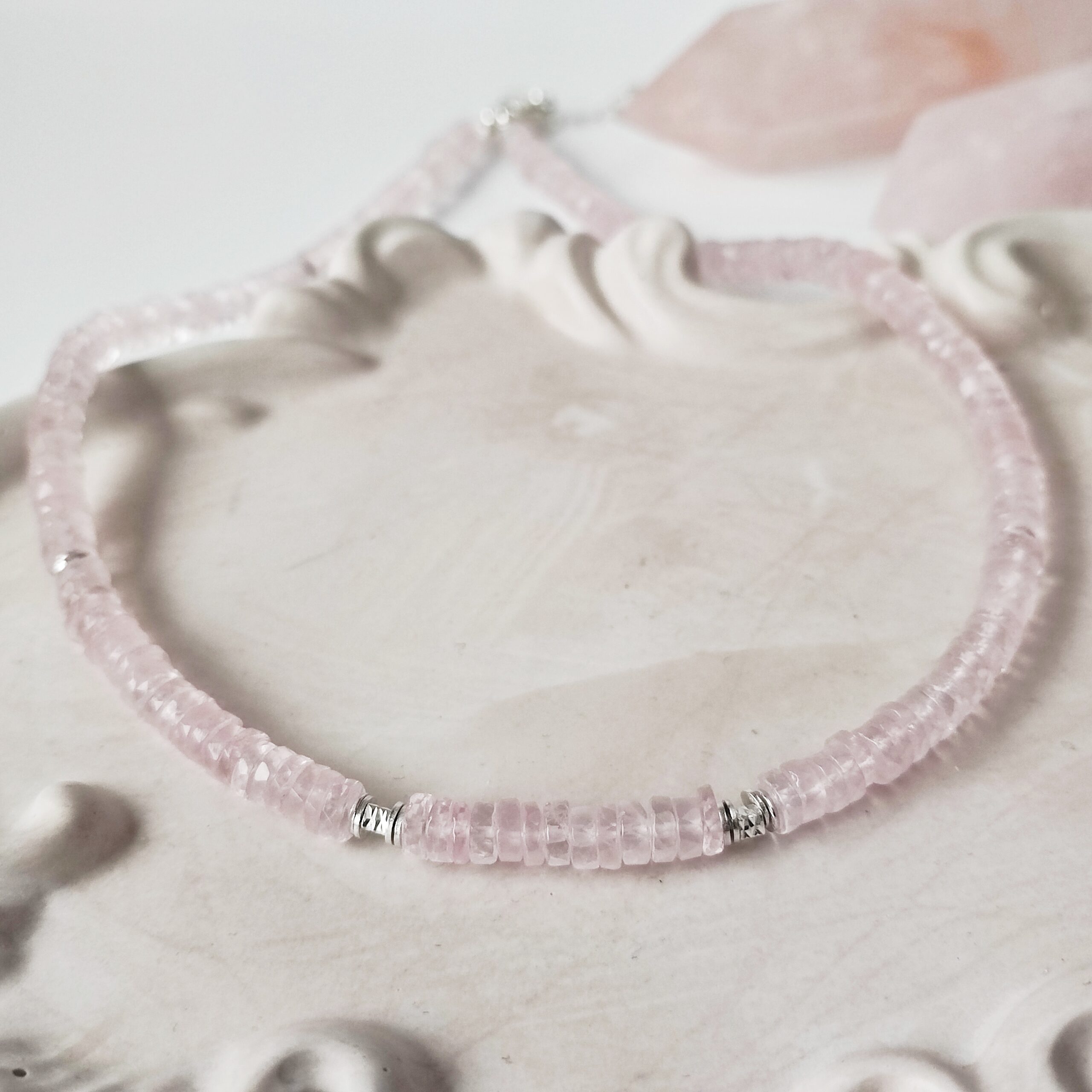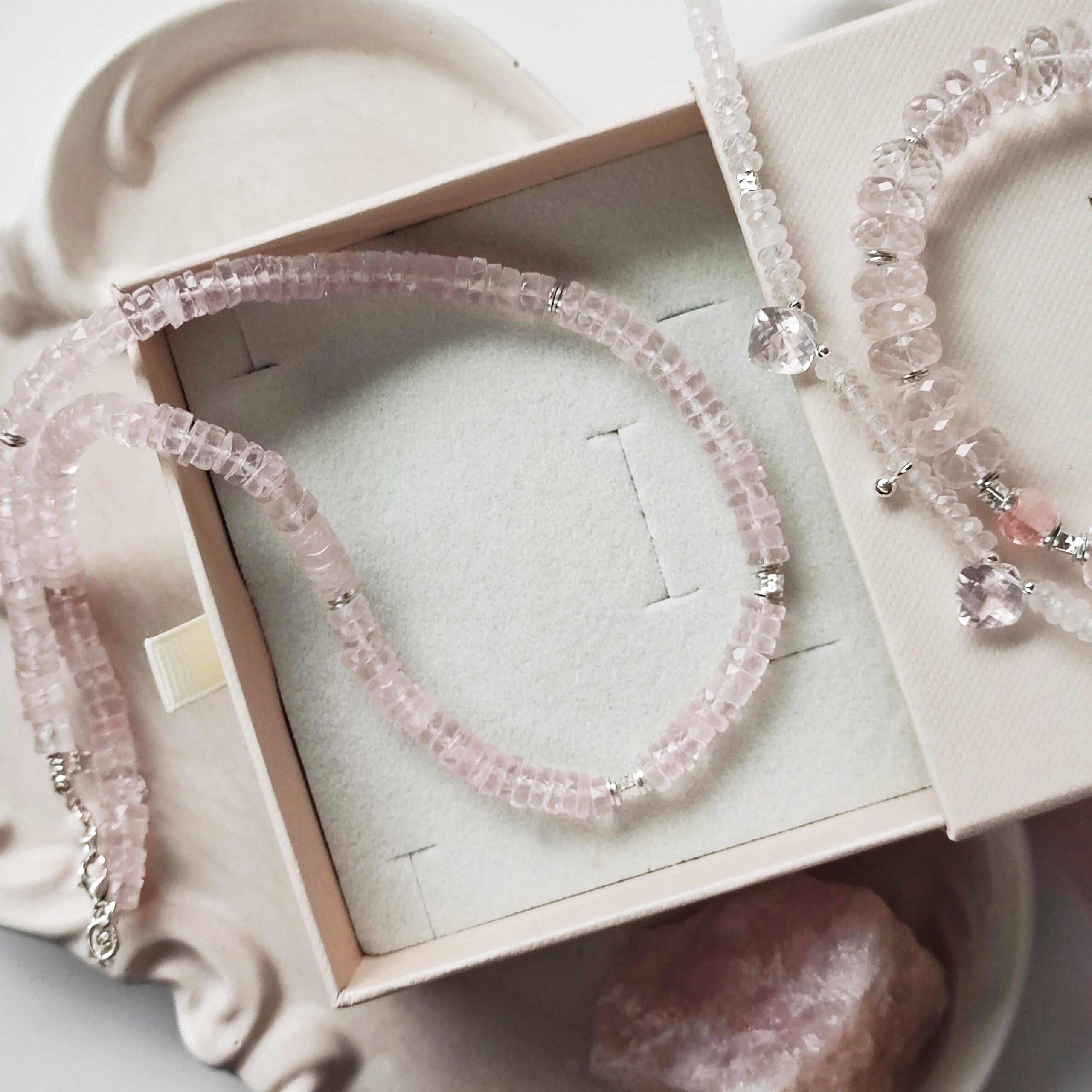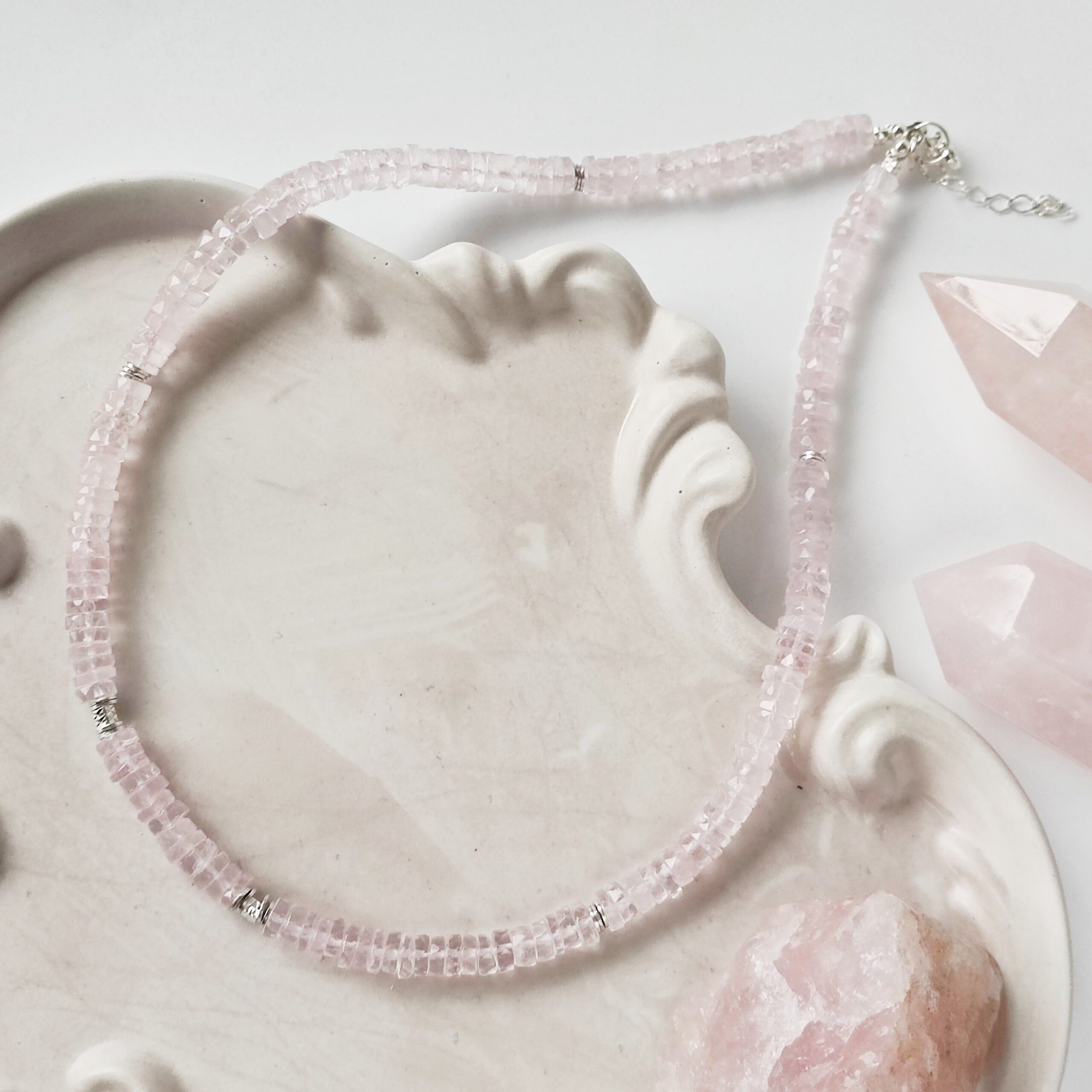 Oferta dotyczy naszyjnika z talarków kwarcu różowego. W galerii pojawiają się również: naszyjnik z oponek Kwarcu różowego zdobiony kwarcem w szlifie poduszkowym i bransoletka z oponek Kwarcu różowego i Morganitu klasy klejnotu oraz obelisk Kwarcu różowego.