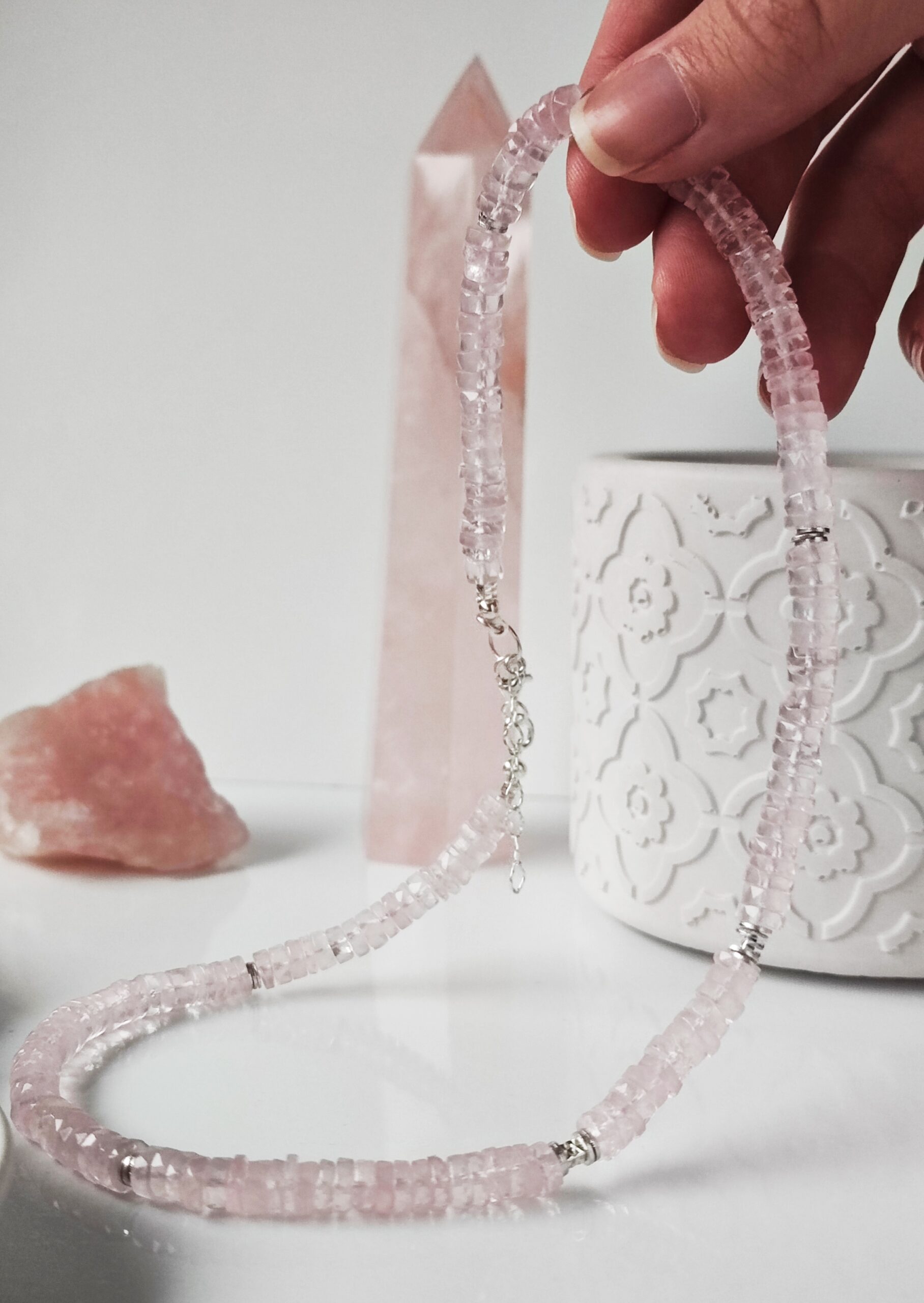 Ręcznie wykonany, lukusowy naszyjnik z wysokiej klasy, naturalnego Kwarcu różowego z Madagaskaru o pięknej, wyrazistej barwie i wyjątkowej przejrzystości.
