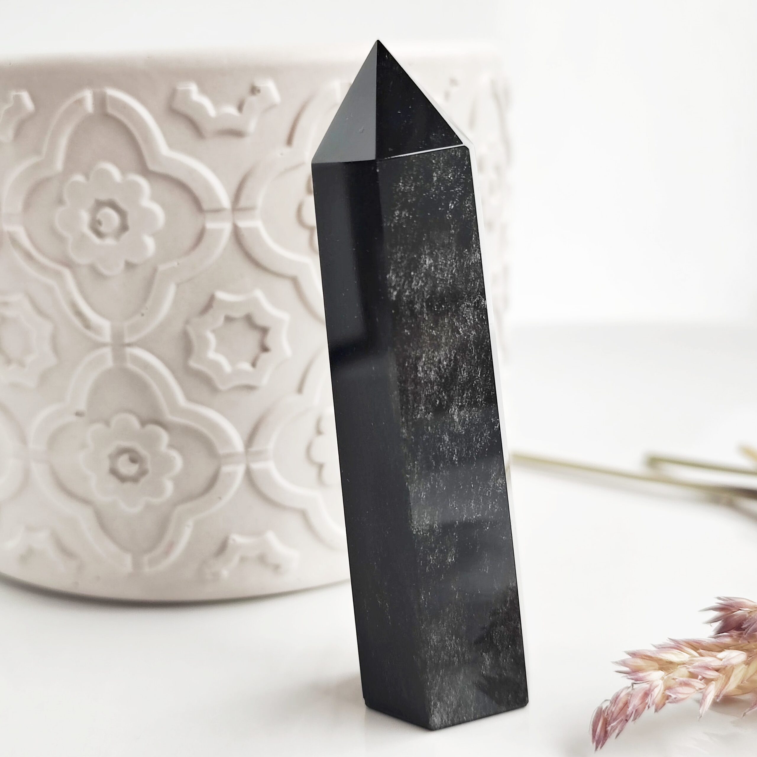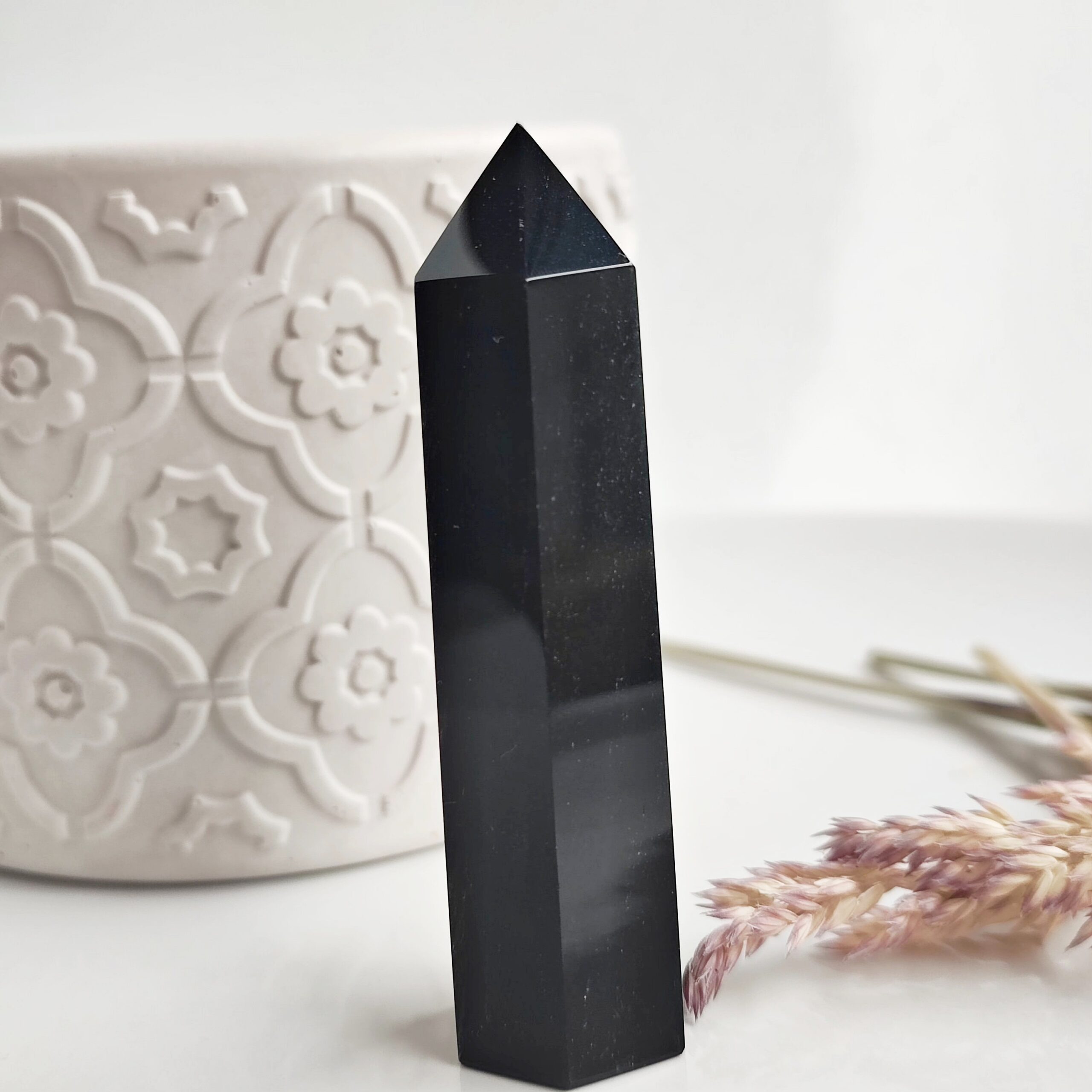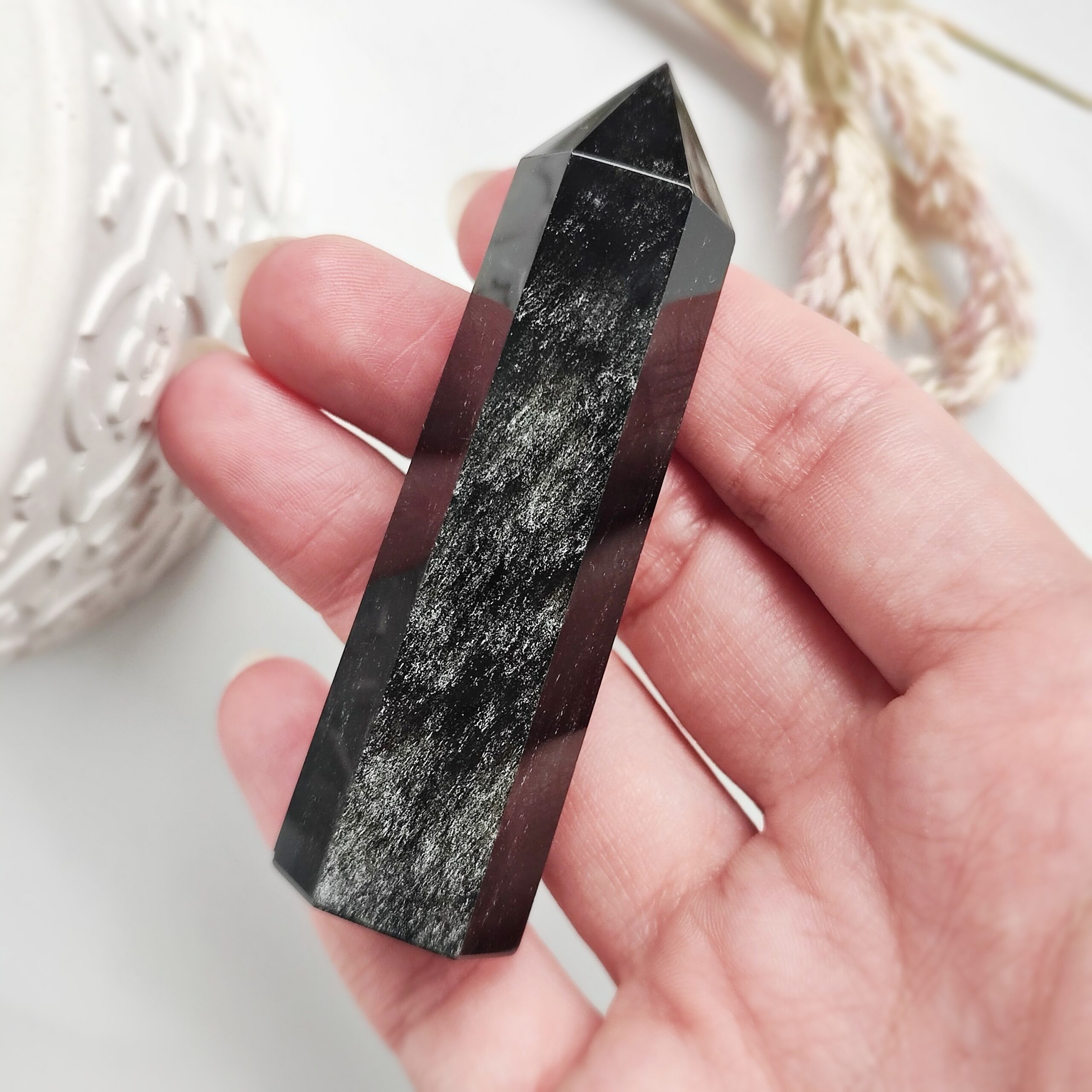 Elegancki obelisk wykonany z naturalnego Hipersthenu – rzadkiego minerału o charakterystycznym, metalicznym połysku. Dwie z jego ścian iskrzą subtelnym, srebrzystym blaskiem, który zmienia się w zależności od kąta padania światła, tworząc efekt głębi i tajemniczości. Doskonały jako ozdoba wnętrza, narzędzie medytacyjne lub element kolekcji minerałów.