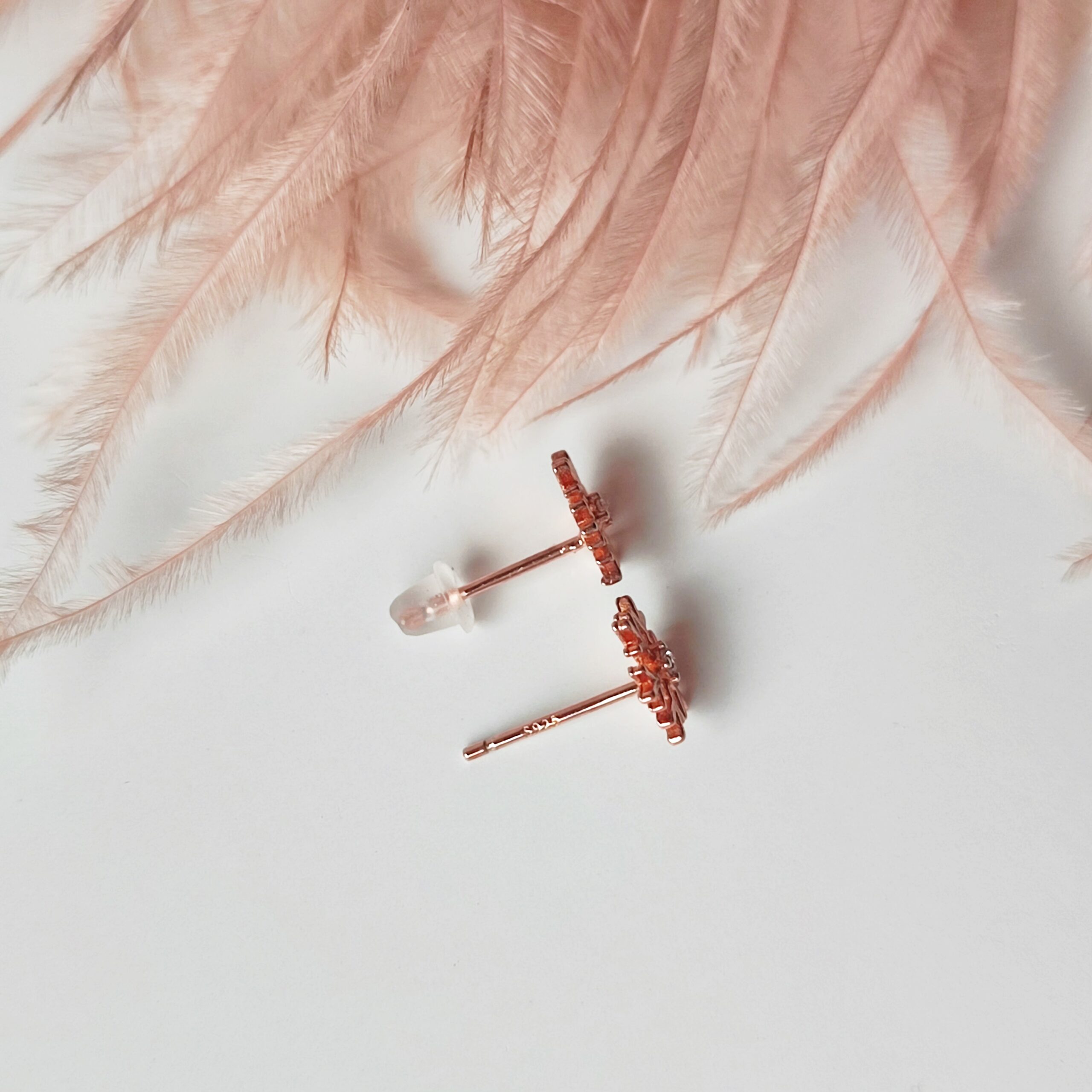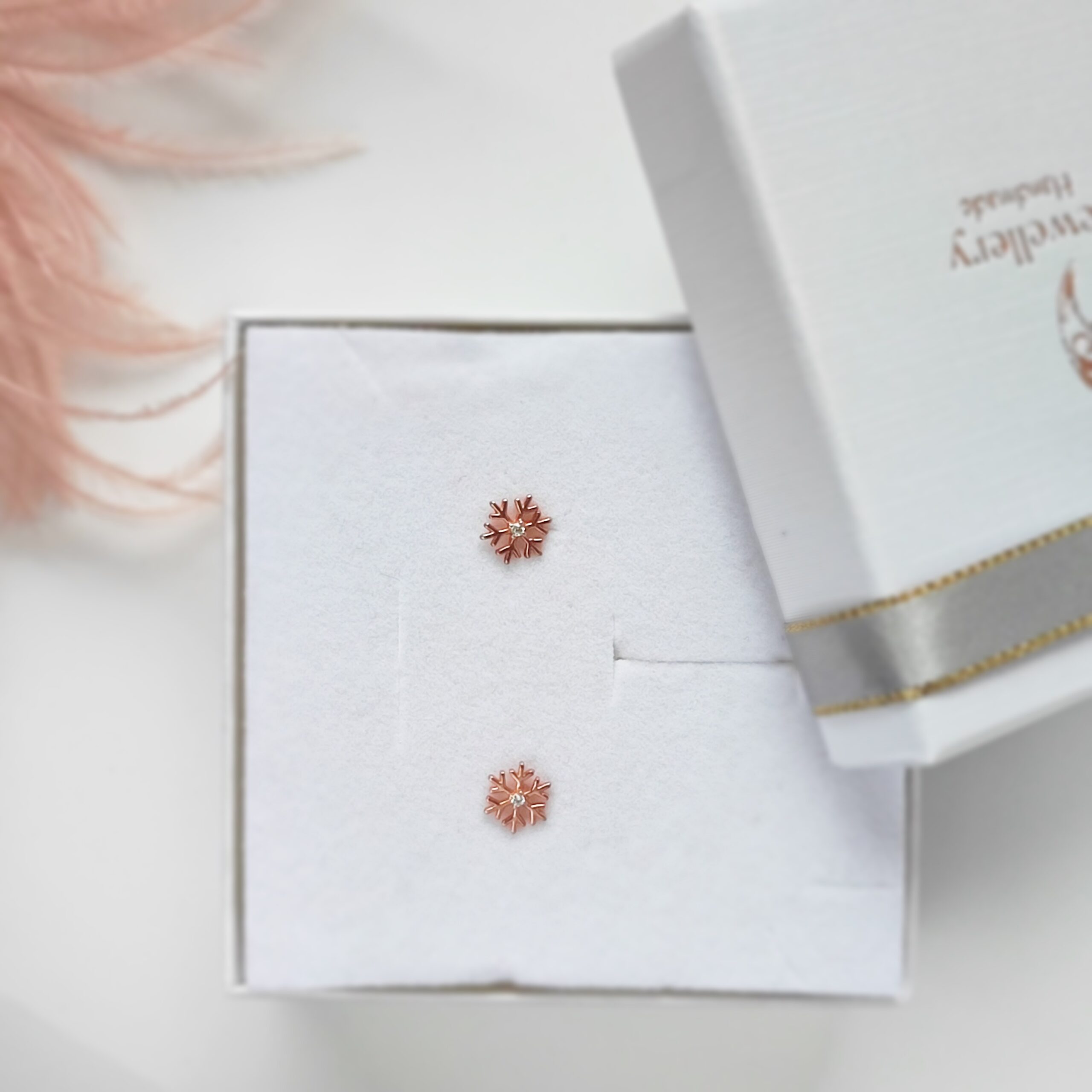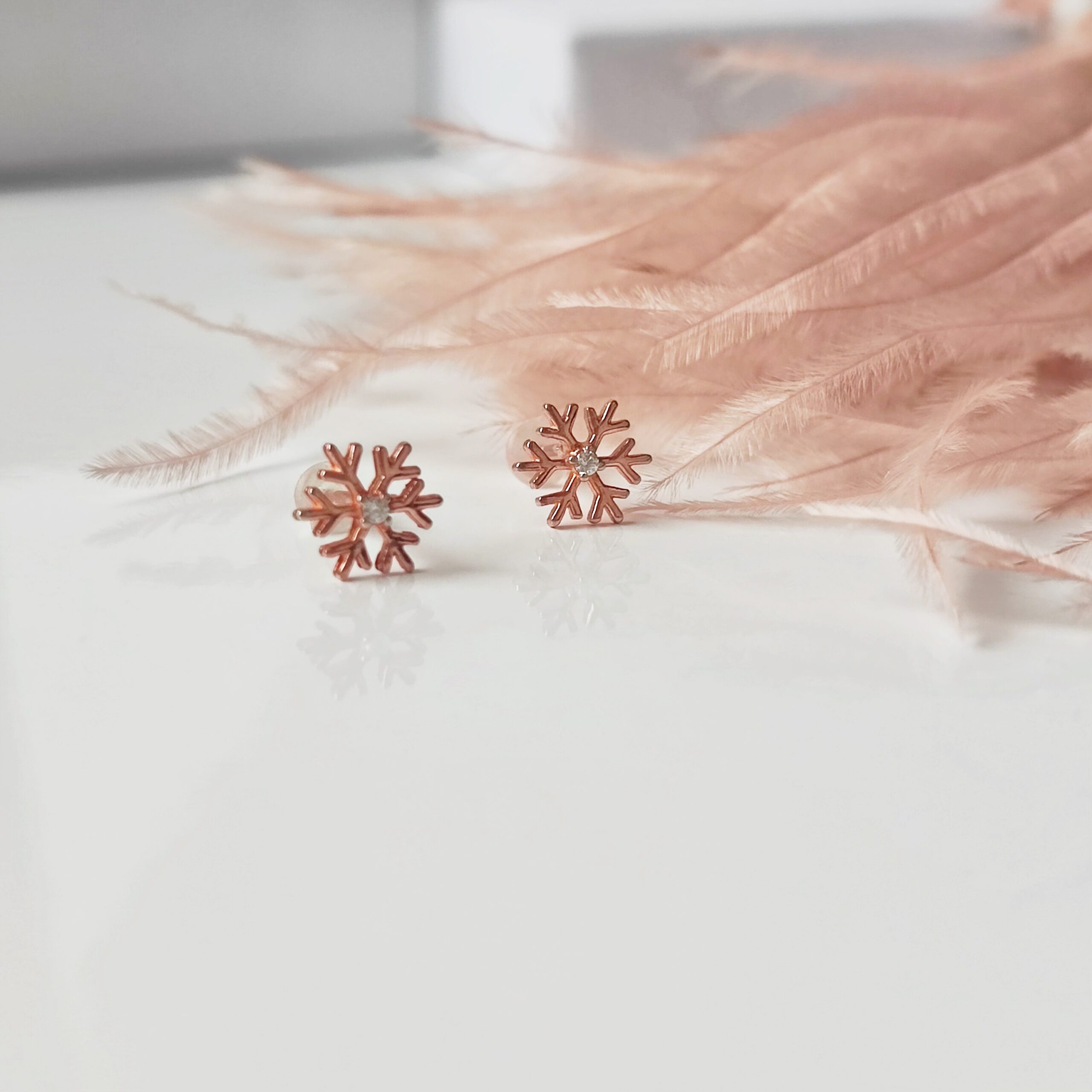 Urocze kolczyki w kształcie płatków śniegu wykonane z srebra pr.925 złoconego różowym złotem, zdobione białymi cyrkoniami. W zestawie z silikonowymi zatyczkami.