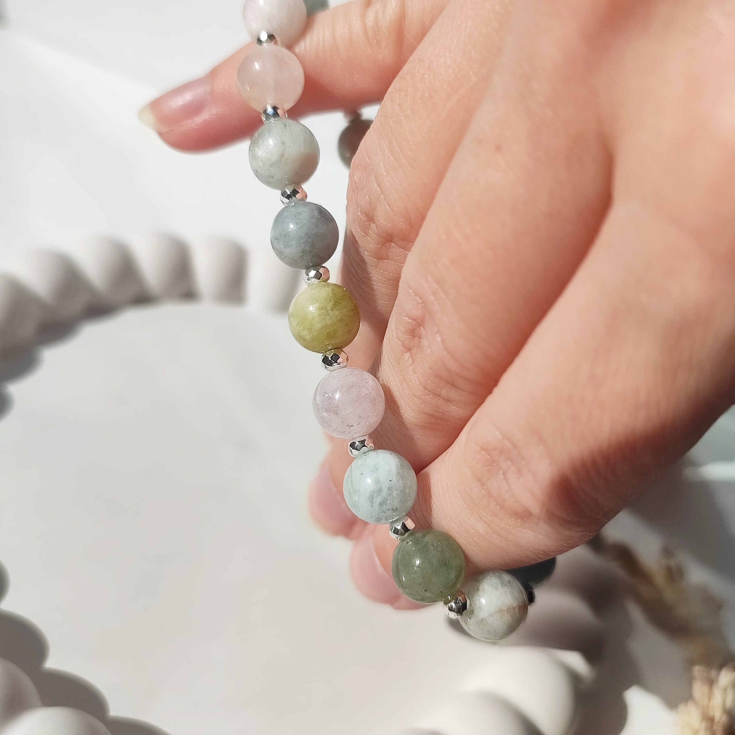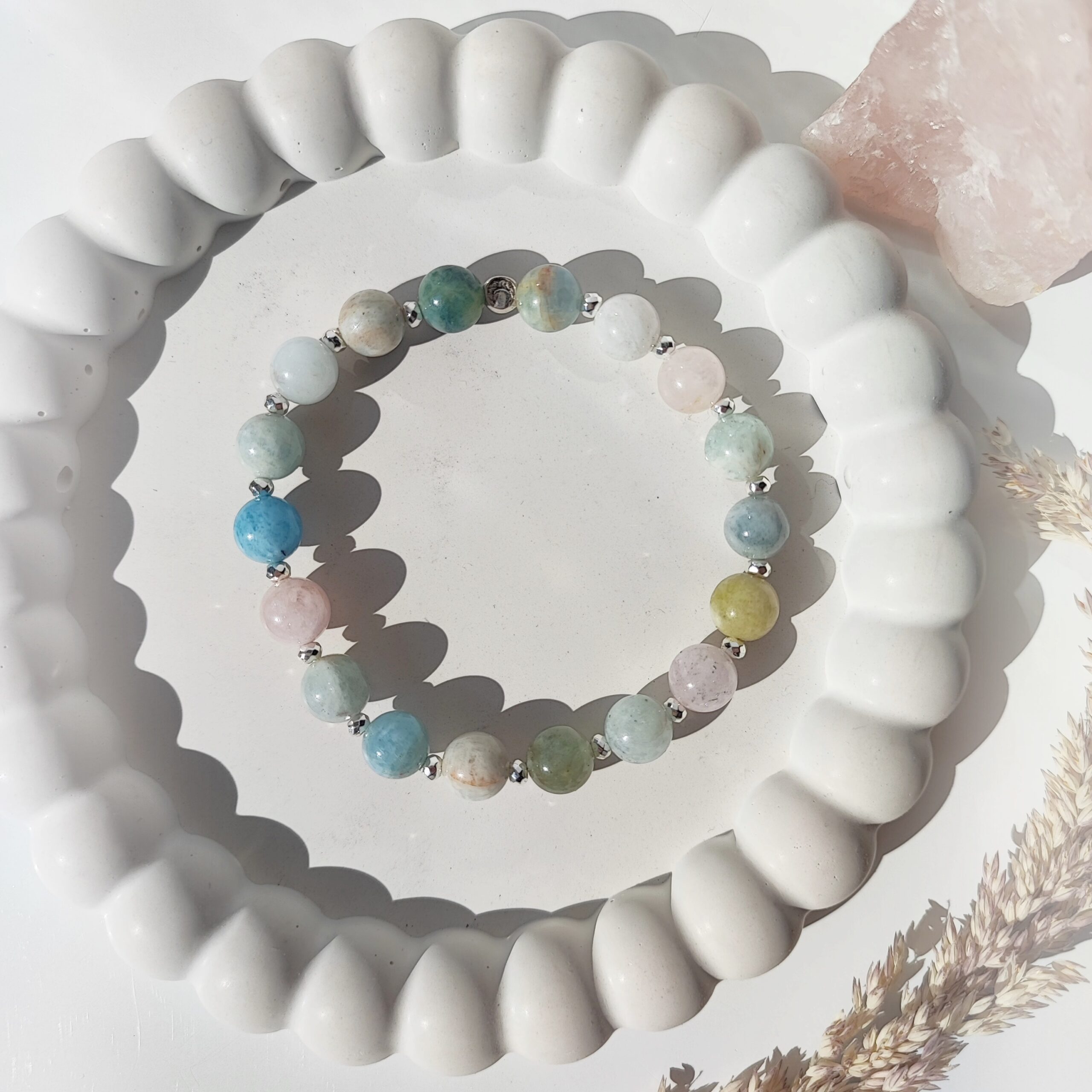 Zachwycająca, ręcznie wykonana bransoletka na elastycznej gumce jubilerskiej, łącząca delikatne Beryle (8 mm, gładkie kule) z fasetowanymi oponkami Hematytu (3×2 mm) w srebrnym odcieniu. Całość dopełnia firmowy srebrny (925) koralik z logo, podkreślający unikatowy charakter biżuterii.