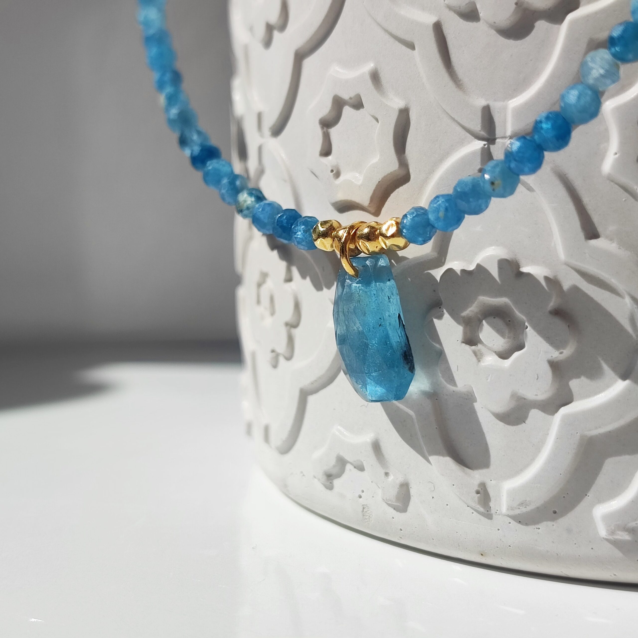 Kianity w tym naszyjniku są naturalnego koloru paraiba. Zdjęcia nie oddają do końca realnego koloru, w rzeczywistości jest on w odcieniu niebieskiej-morskiej zieleni (zwany paraiba).