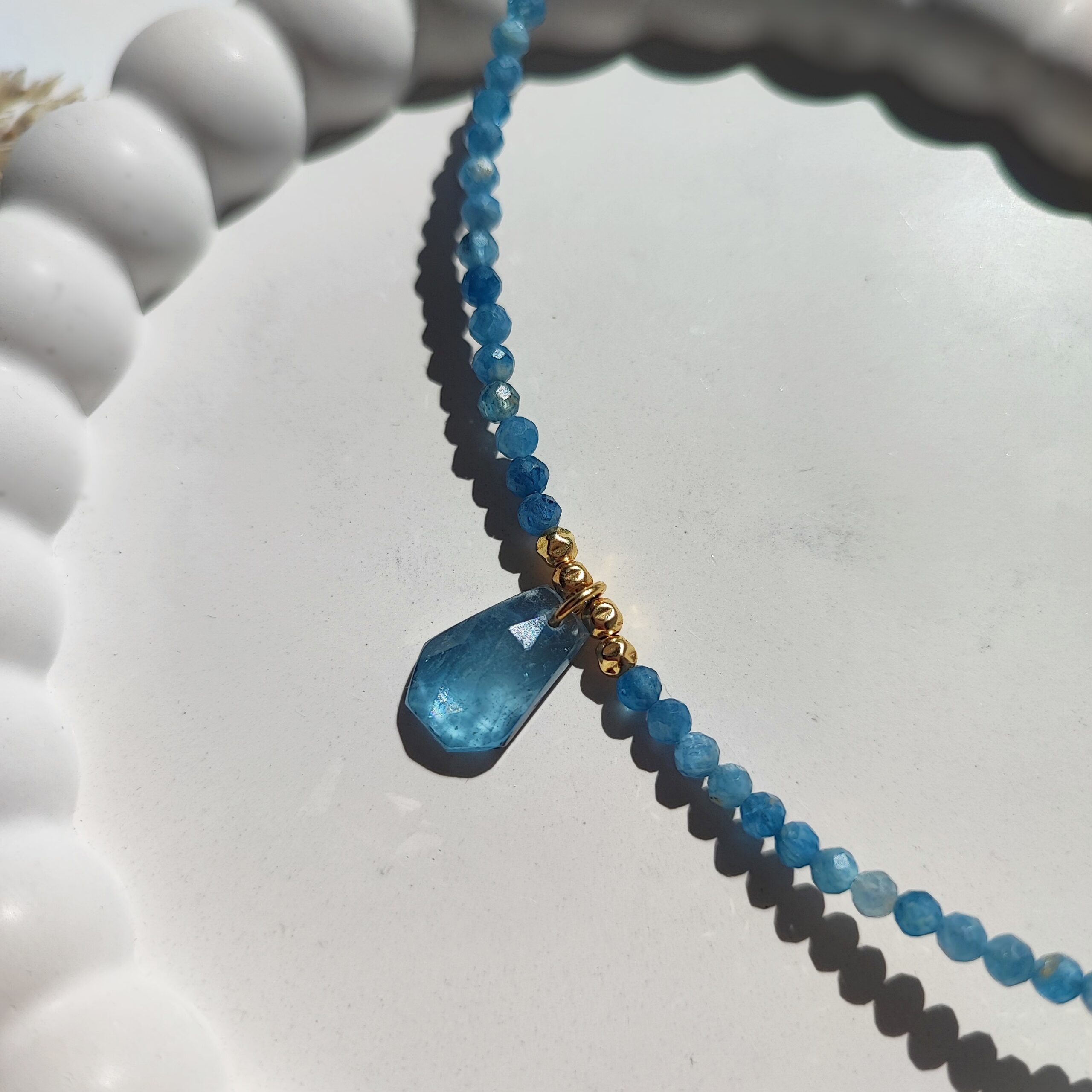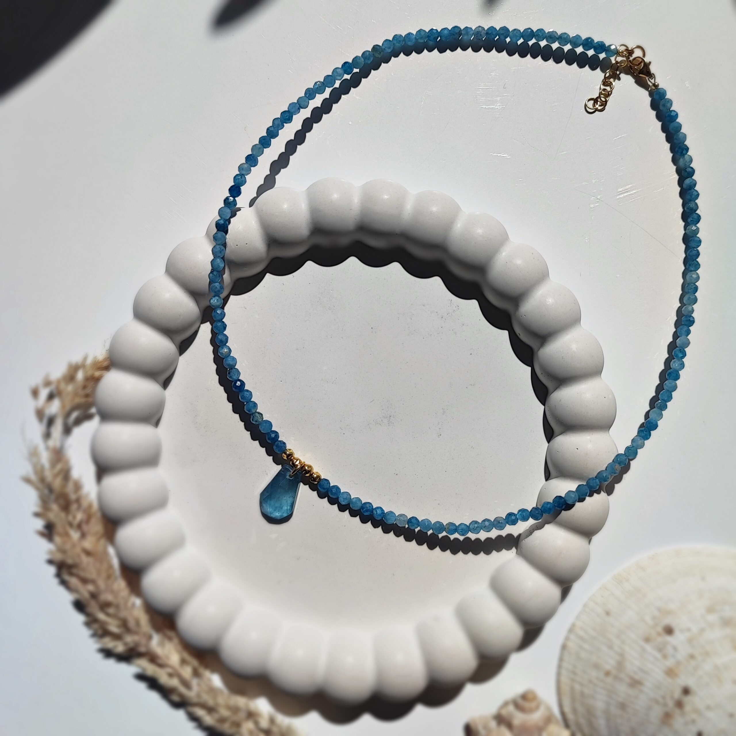Składa się z fasetowanych kuleczek o średnicy 3mm oraz centralnej zawieszki z kianitu w efektownym trapezowym szlifie (18×10×4mm). Kamień jest przejrzysty, z pięknym wewnętrznym błyskiem i brylancją, którą podkreśla staranny szlif.