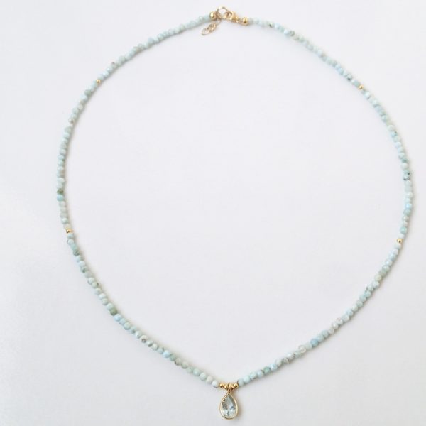 Wyjątkowy, elegancki naszyjnik, ręcznie wykonana z naturalnego, drobniutkiego, rzadkiego kamieniaLarimaru i naturalnego Topazu pozłacanym okuciu. Ozdobiona srebrnymi (próba 925), pozłacanymi koralikami.