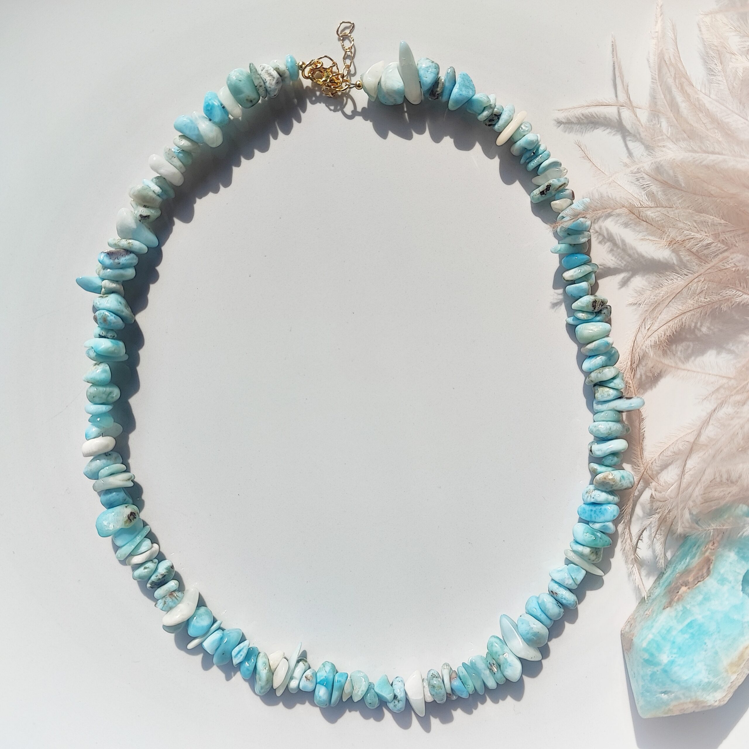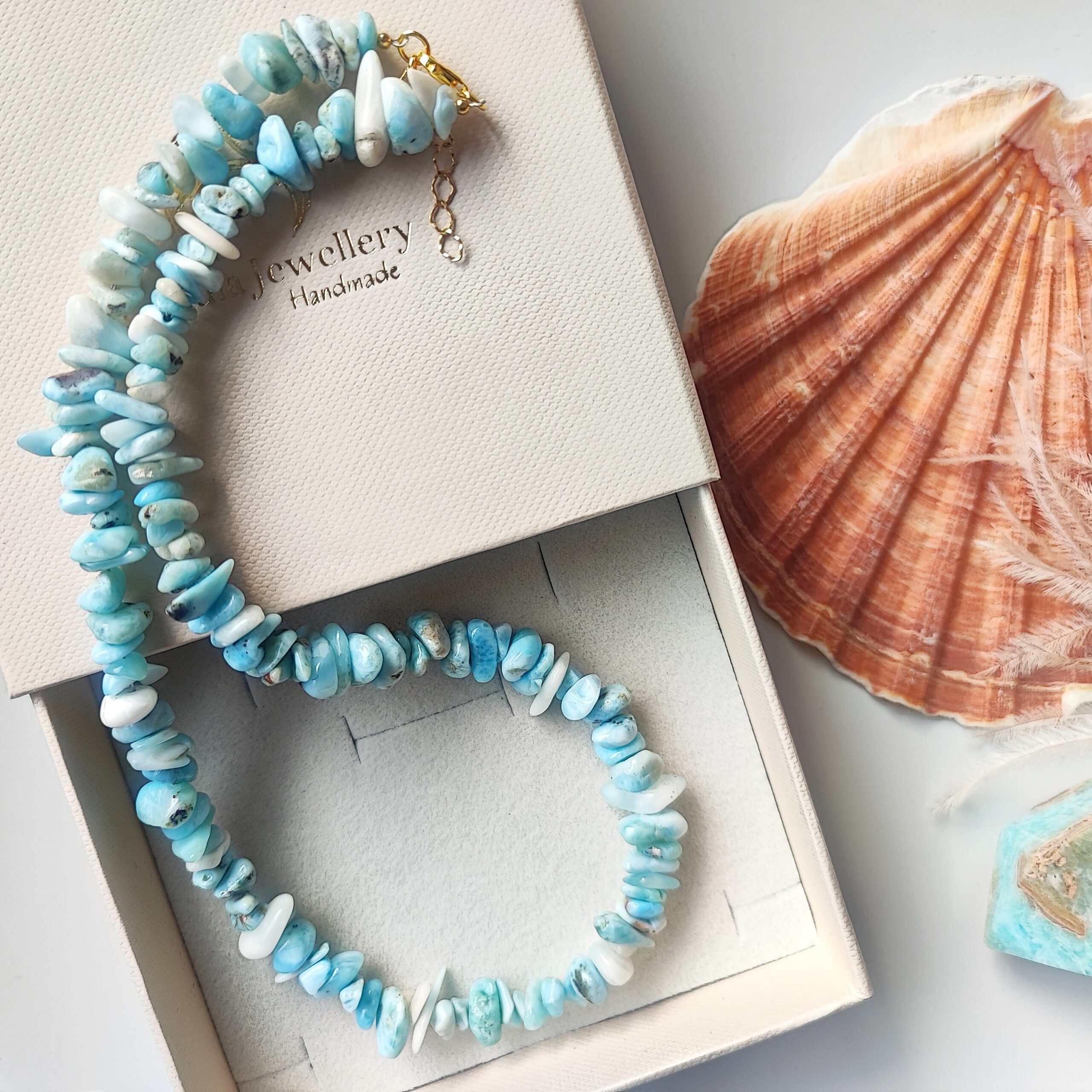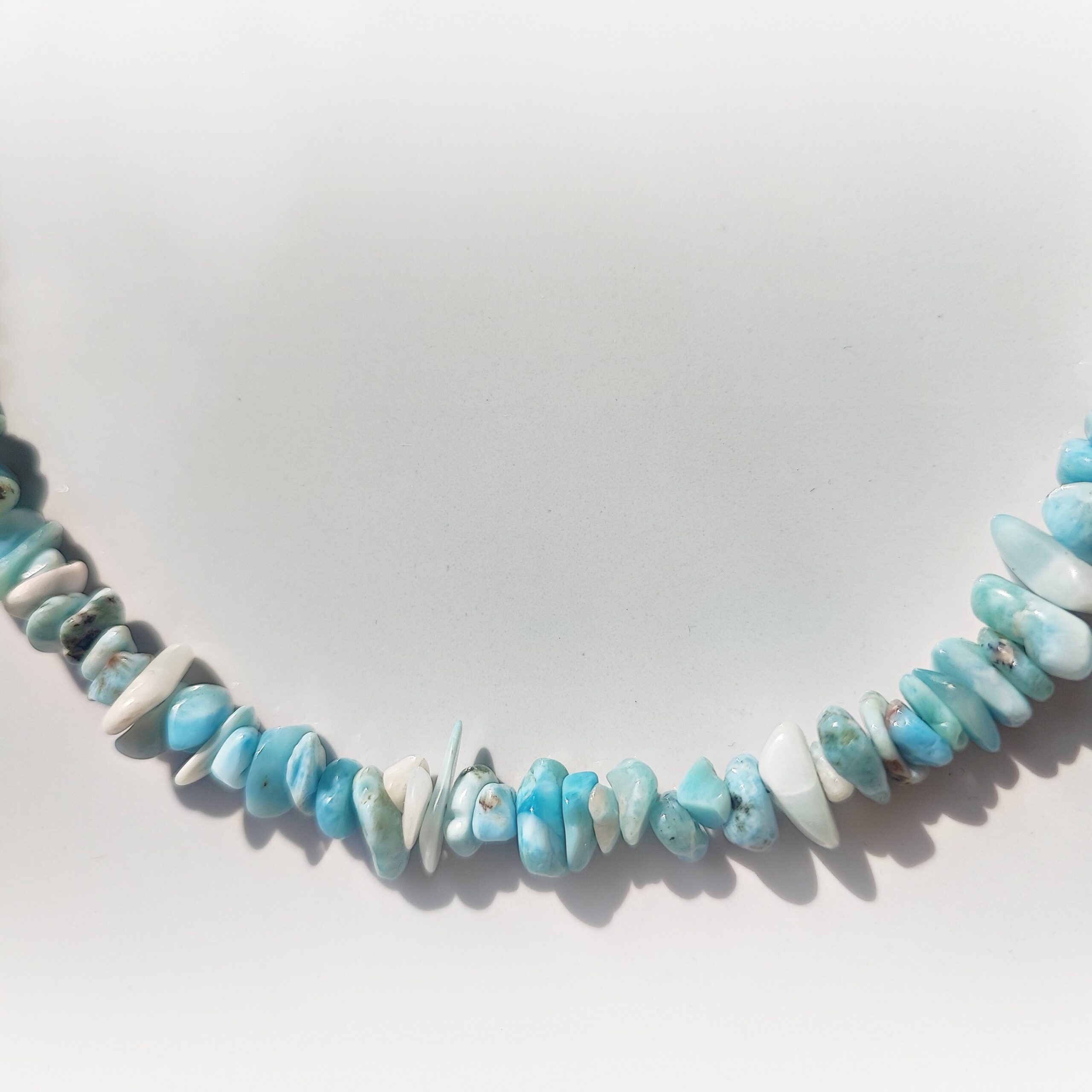 Pełen organicznego uroku choker wykonany z nieregularnych kamieni naturalnego Larimaru – rzadkiego minerału z Karaibów, zwanego „kamieniem oceanu”. Każdy fragment ma unikalny kształt i odcień – od błękitów przez biel, aż po delikatne szarości i turkusy.