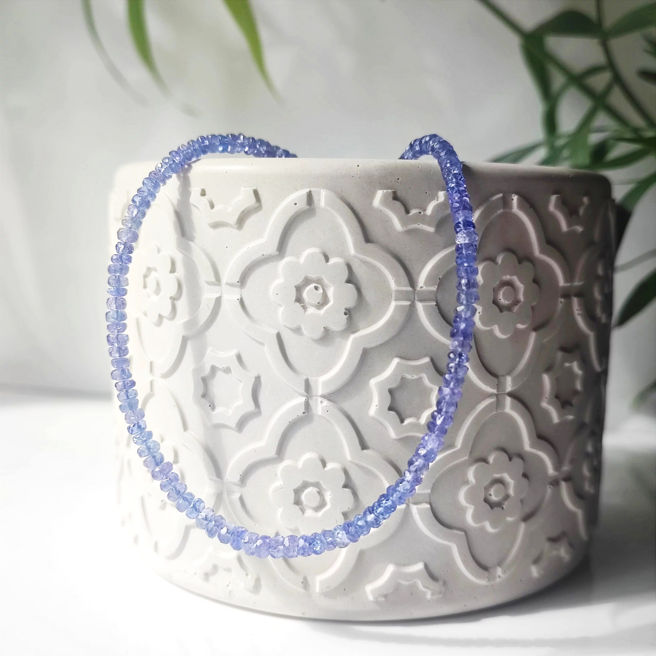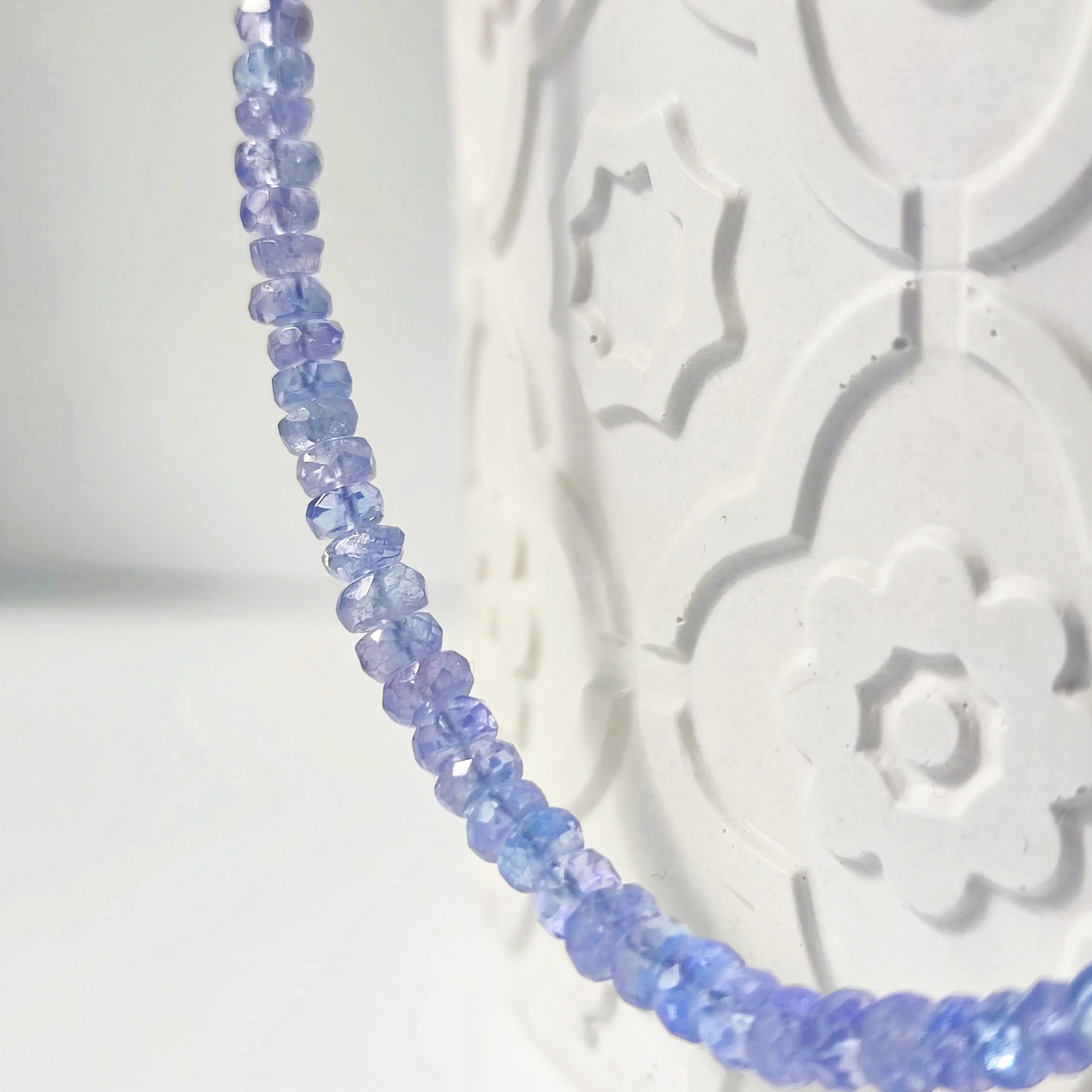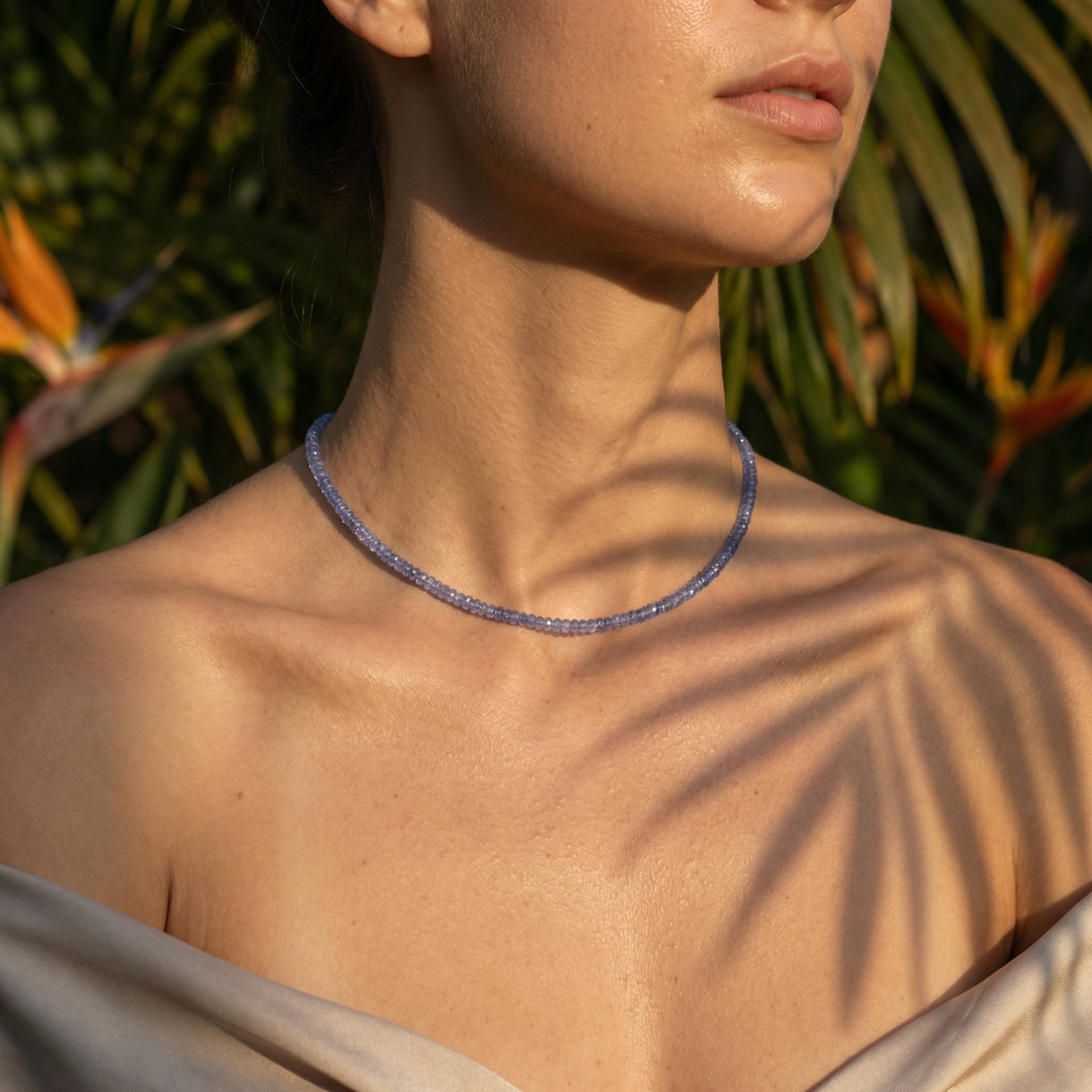 Ekskluzywny naszyjnik choker z Tanzanitu klasy klejnotu (premium). Ręcznie wykonany z najwyższej jakości naturalnego Tanzanitu o spektakularnym fioletowo-niebieskim odcieniu, który zmienia się w zależności od światła i kąta patrzenia. Starannie fasetowane oponki (ok. 3x2mm), lekko stopniowane – największe w centrum, delikatnie malejące ku końcom – tworzą zjawiskowy efekt świetlny na skórze.