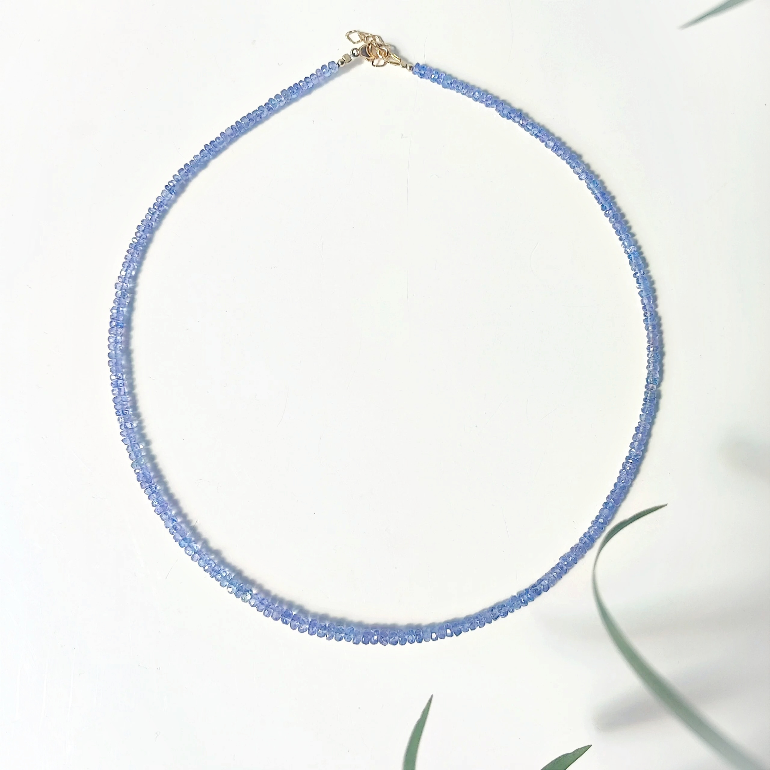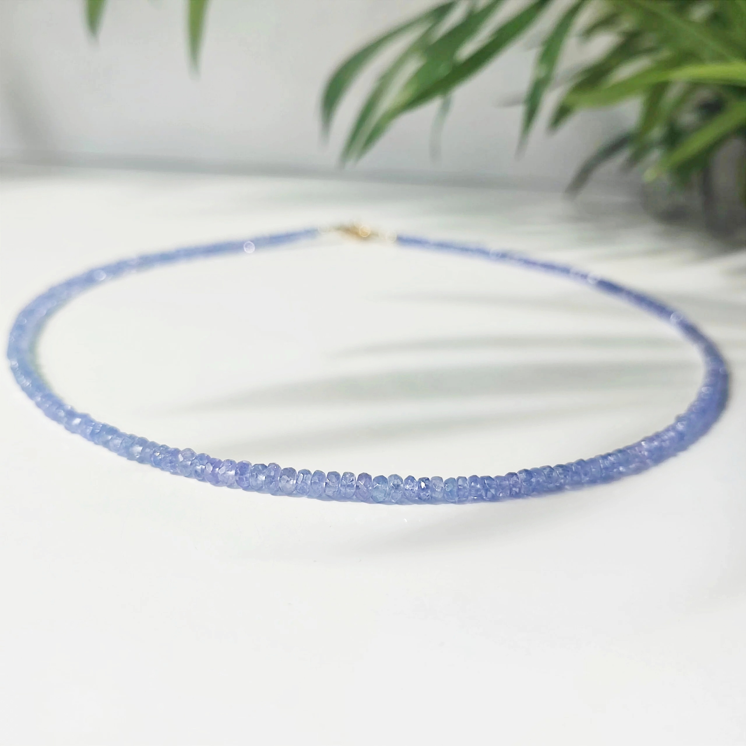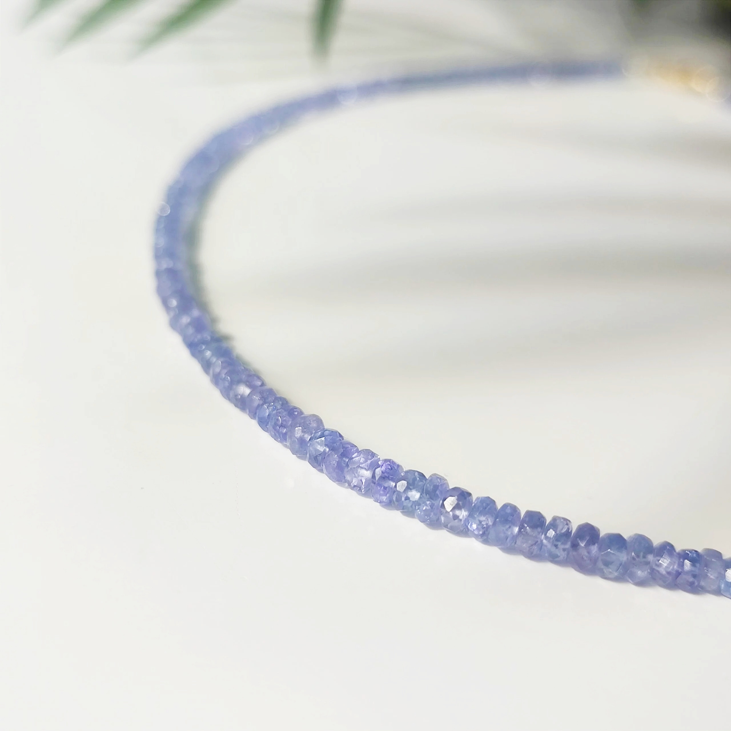 Ekskluzywny naszyjnik choker z Tanzanitu klasy klejnotu (premium). Ręcznie wykonany z najwyższej jakości naturalnego Tanzanitu o spektakularnym fioletowo-niebieskim odcieniu, który zmienia się w zależności od światła i kąta patrzenia. Starannie fasetowane oponki (ok. 3x2mm), lekko stopniowane – największe w centrum, delikatnie malejące ku końcom – tworzą zjawiskowy efekt świetlny na skórze.