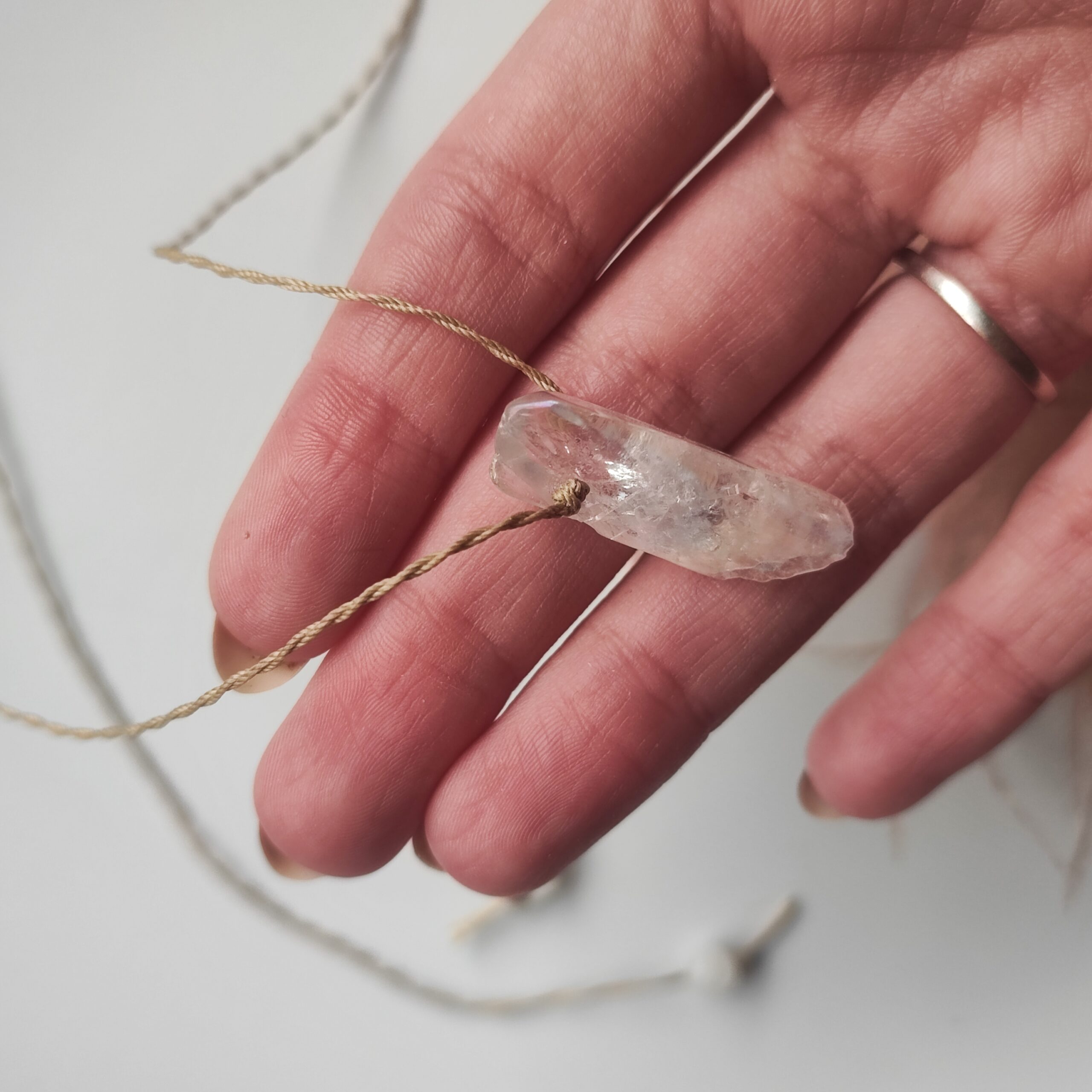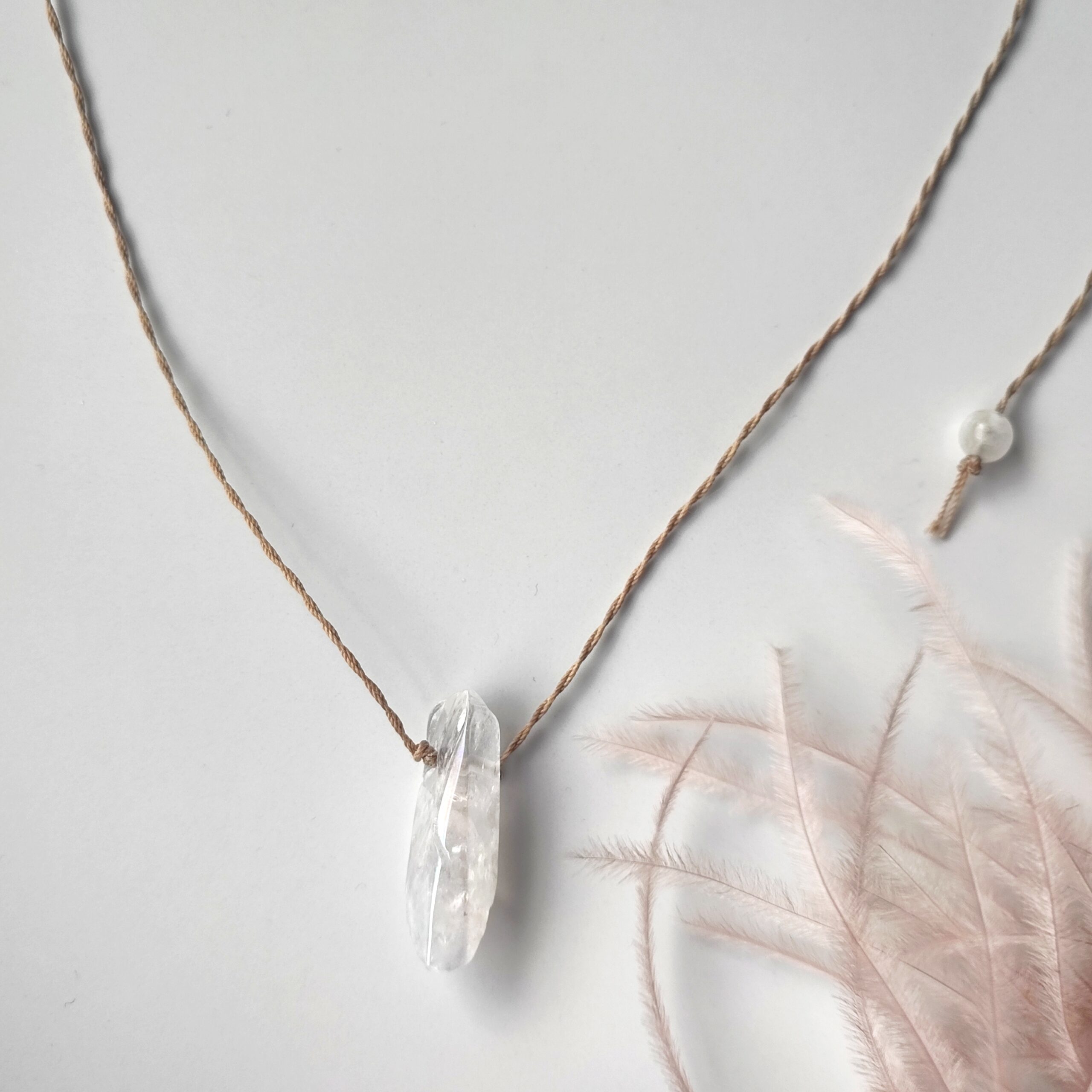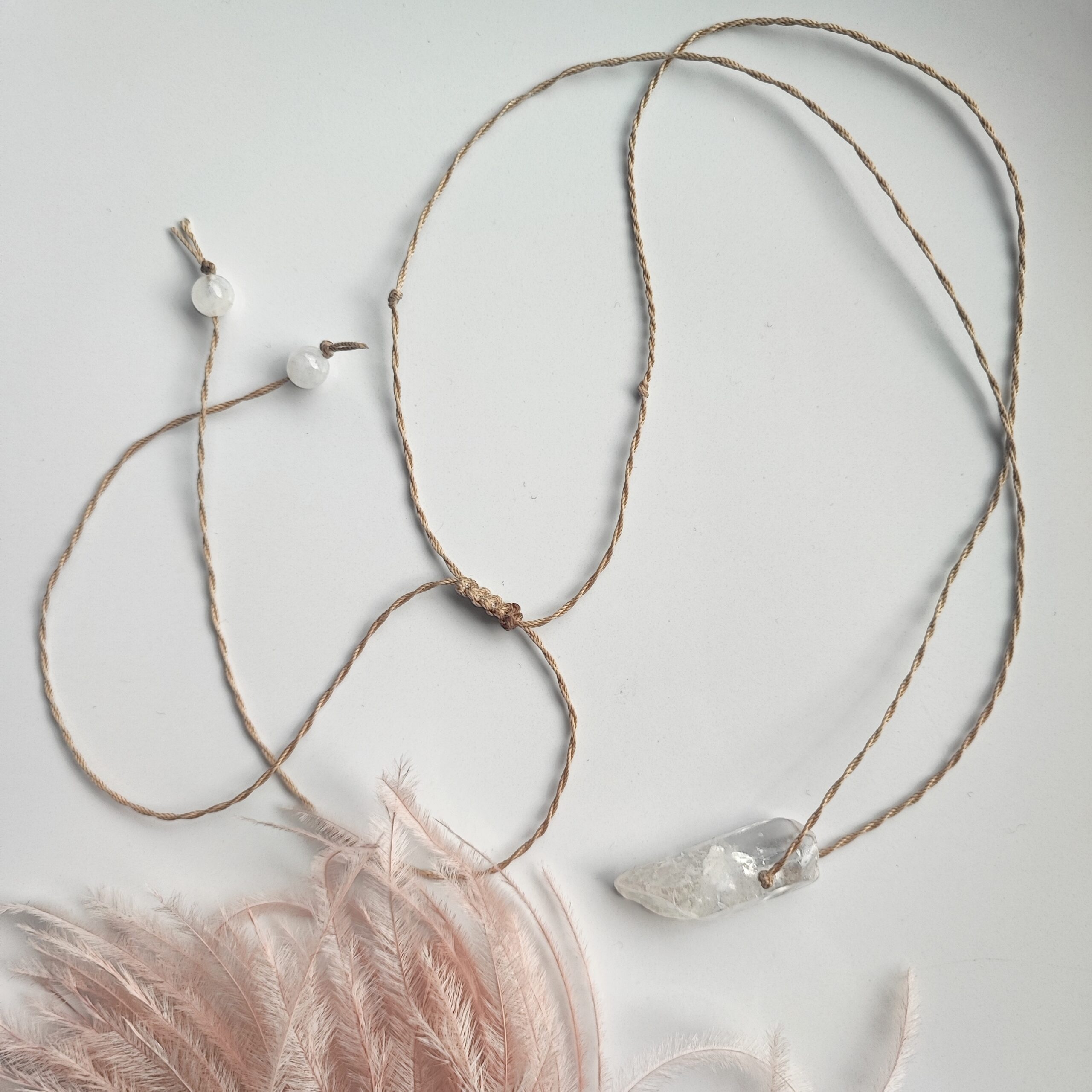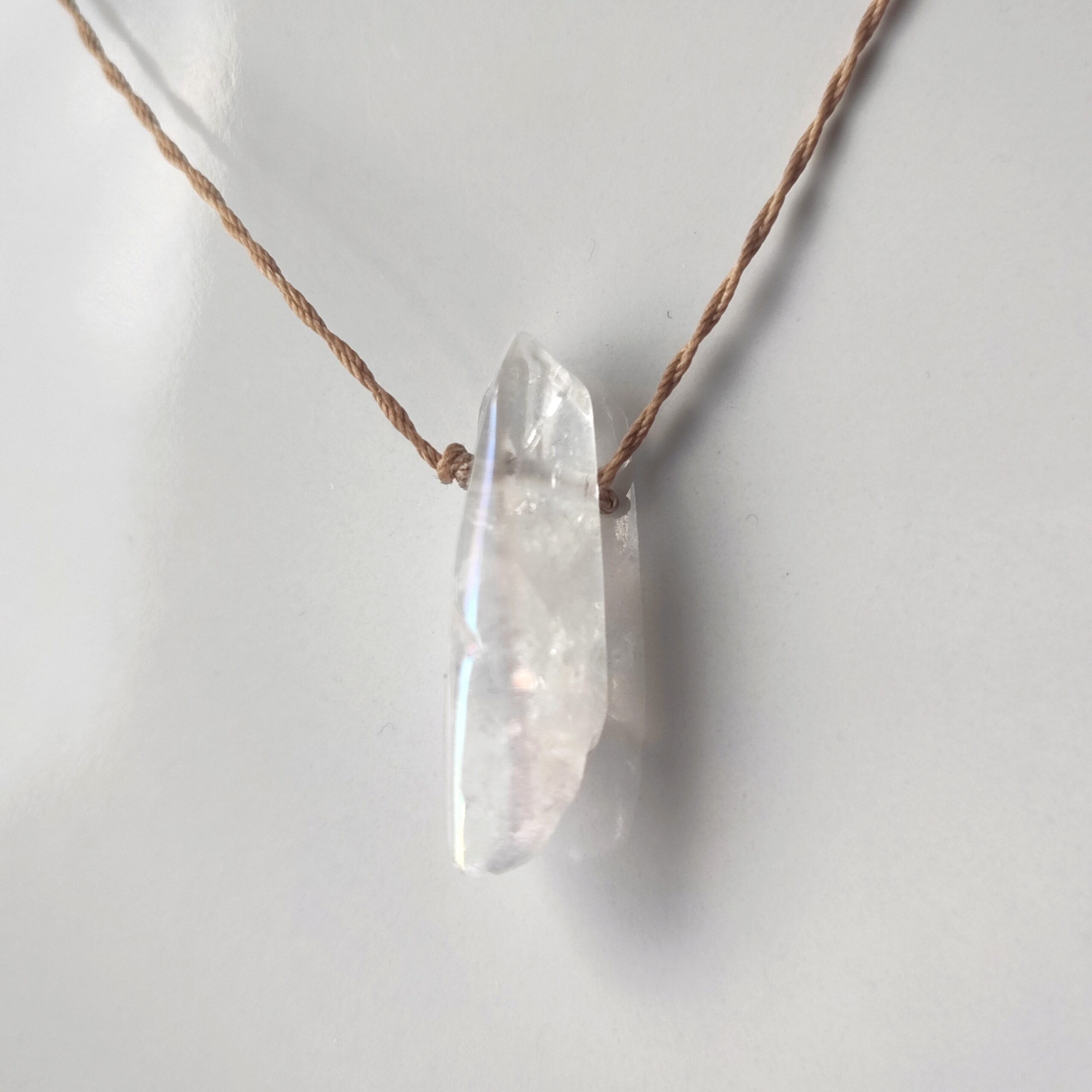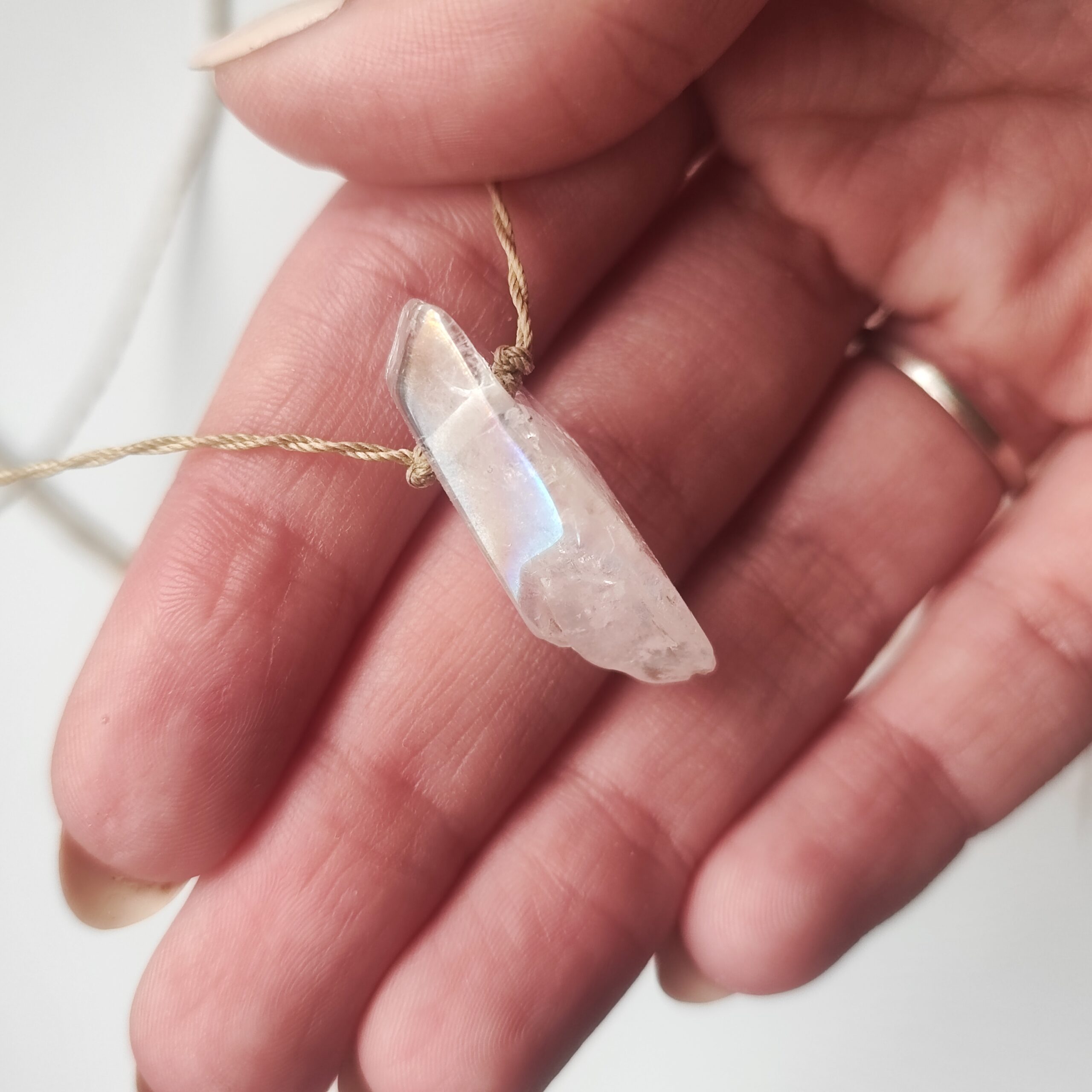 Ręcznie wykonany naszyjnik na wytrzymałym, beżowym sznureczku, którego centrum zdobi nieregularny słupek Kwarcu Aura – kamienia o wyjątkowym, opalizującym blasku.