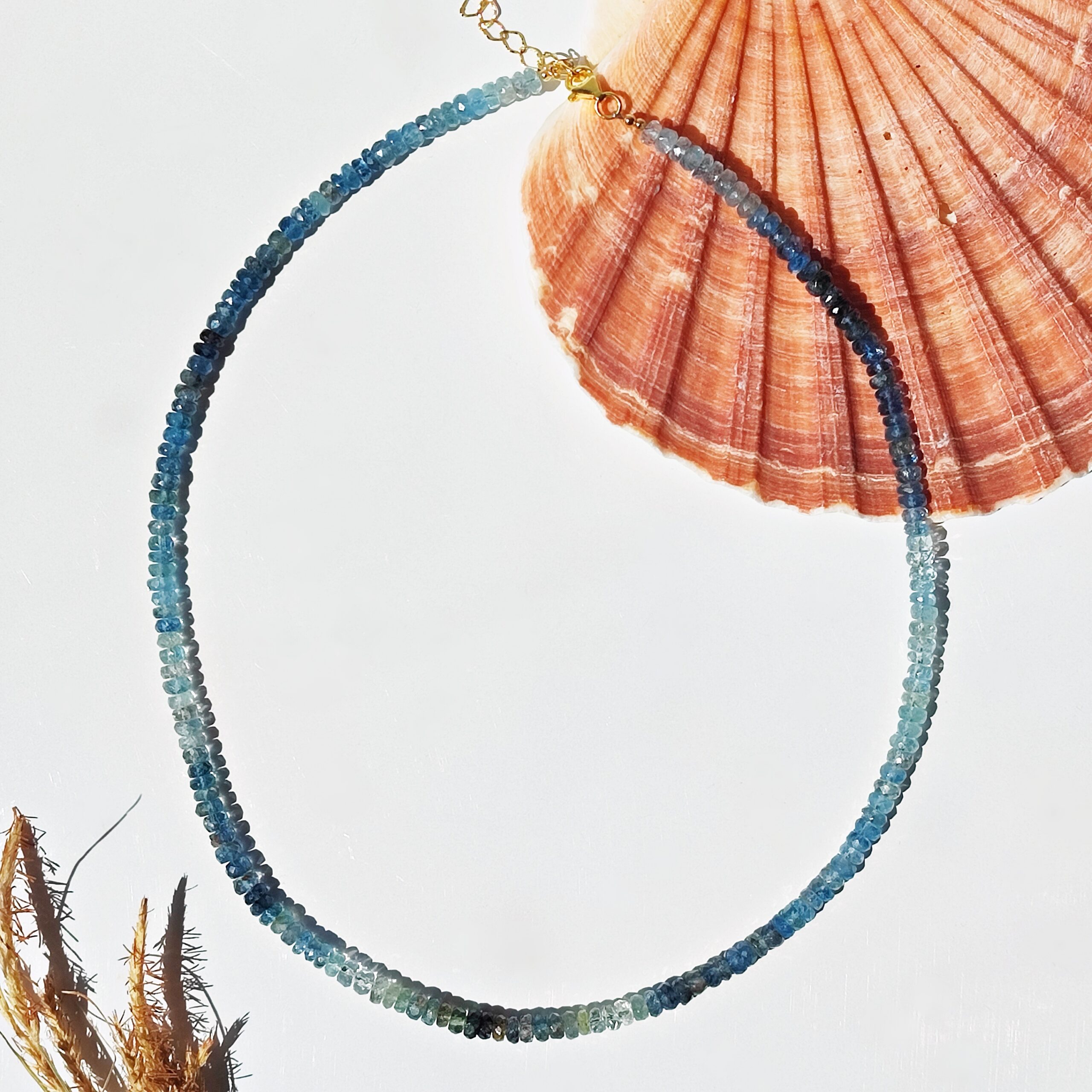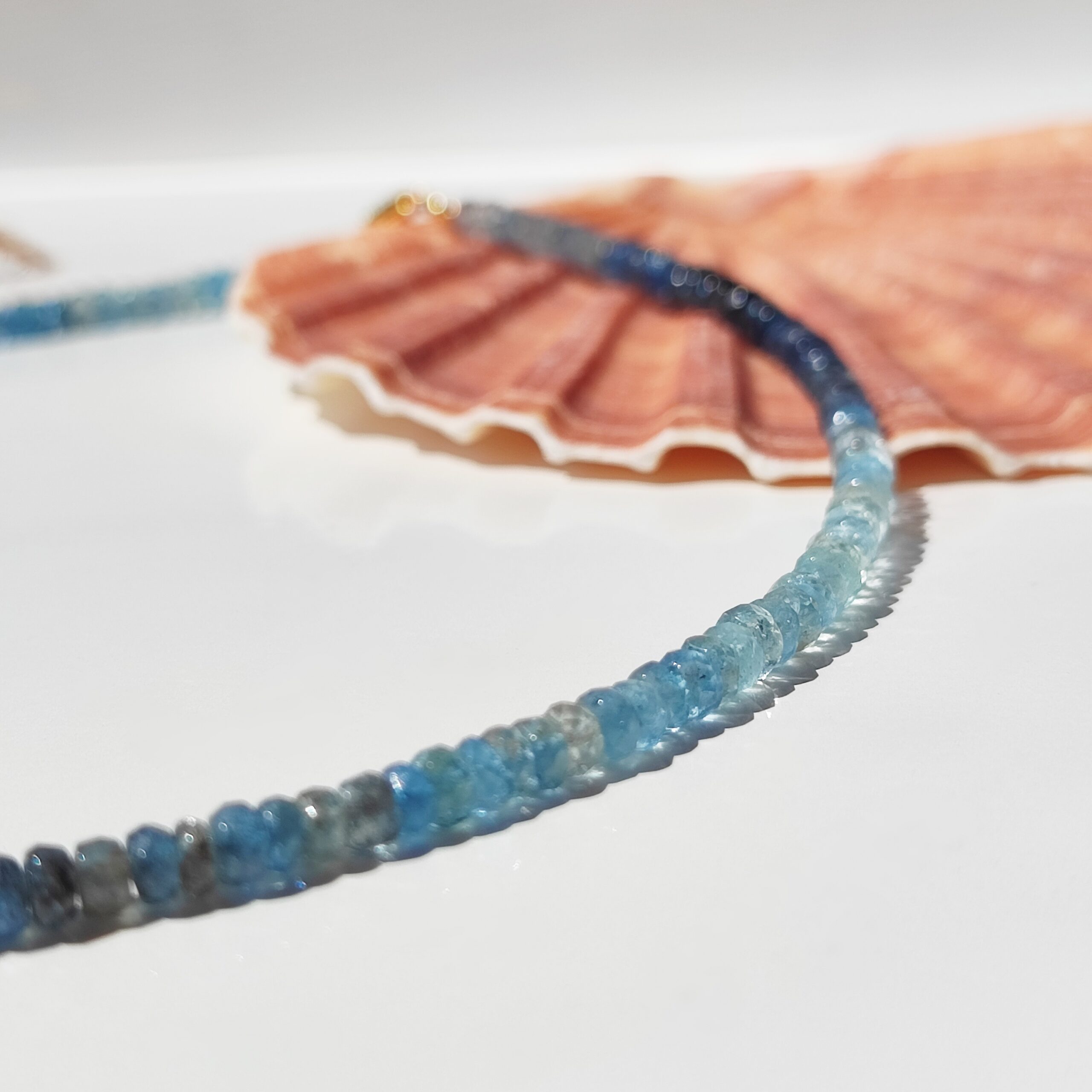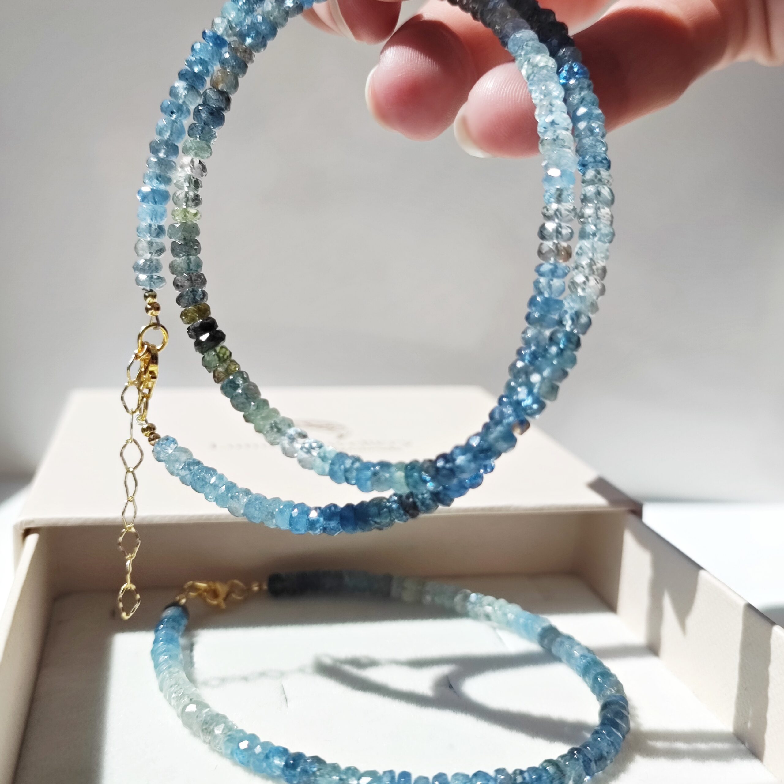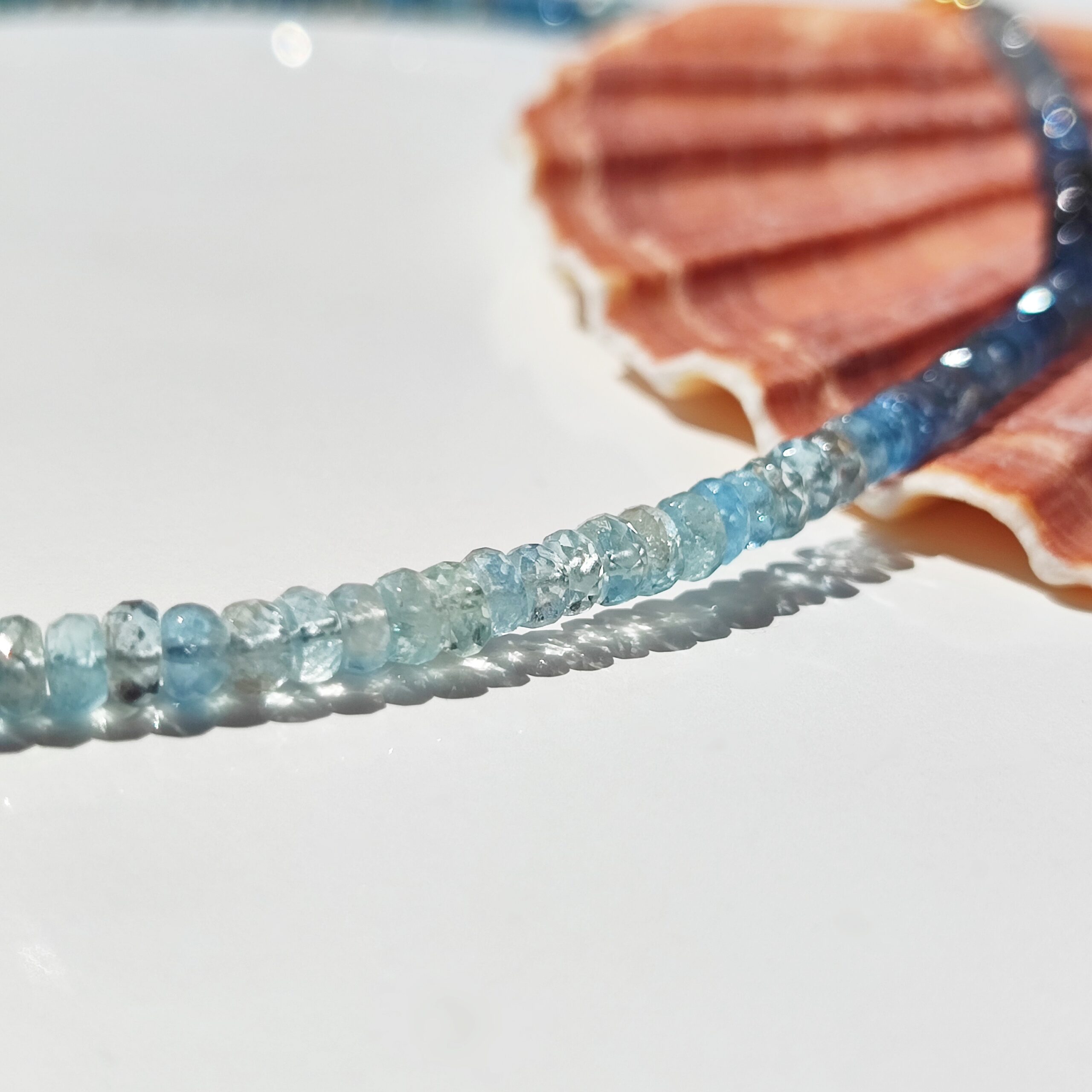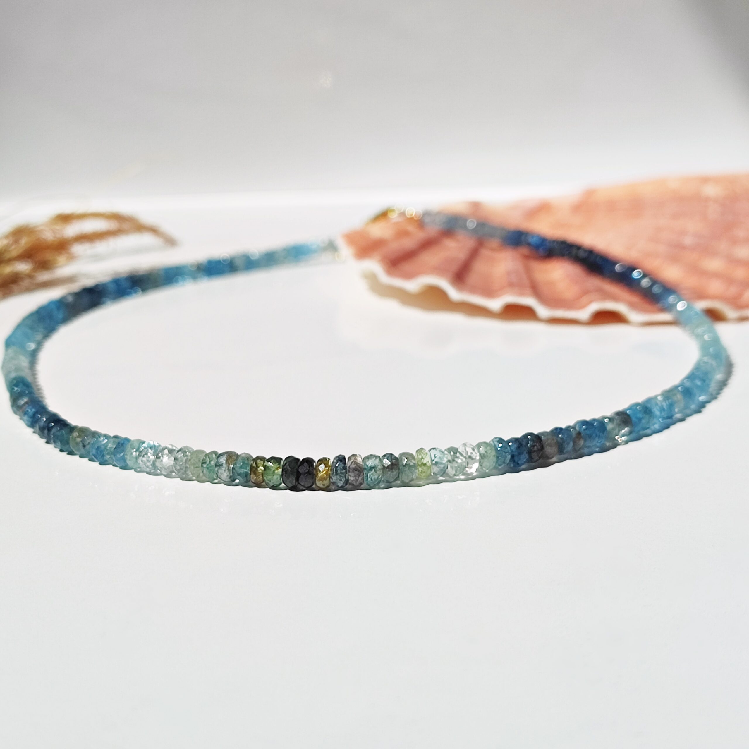 Pełen subtelnego uroku, ręcznie wykonany naszyjnik z rzadkiego, naturalnego Akwamarynu mszystego klasy klejnotu. Fasetowane oponki o wymiarach ok. 4×3mm układają się w lekką, harmonijną kompozycję barw – od przejrzystych i mlecznych tonów, przez odcienie błękitu, niebieskości, po zieleń i szarość.