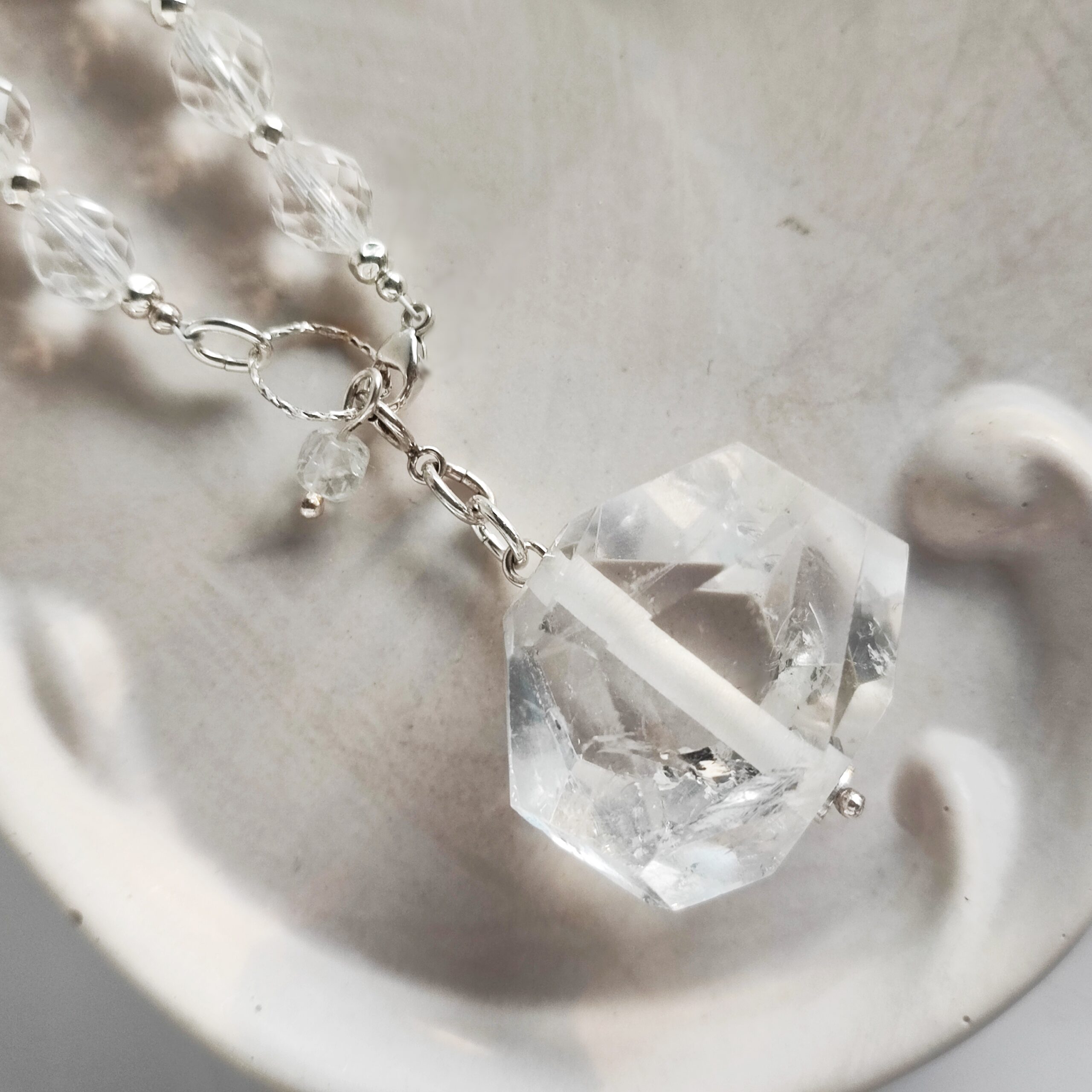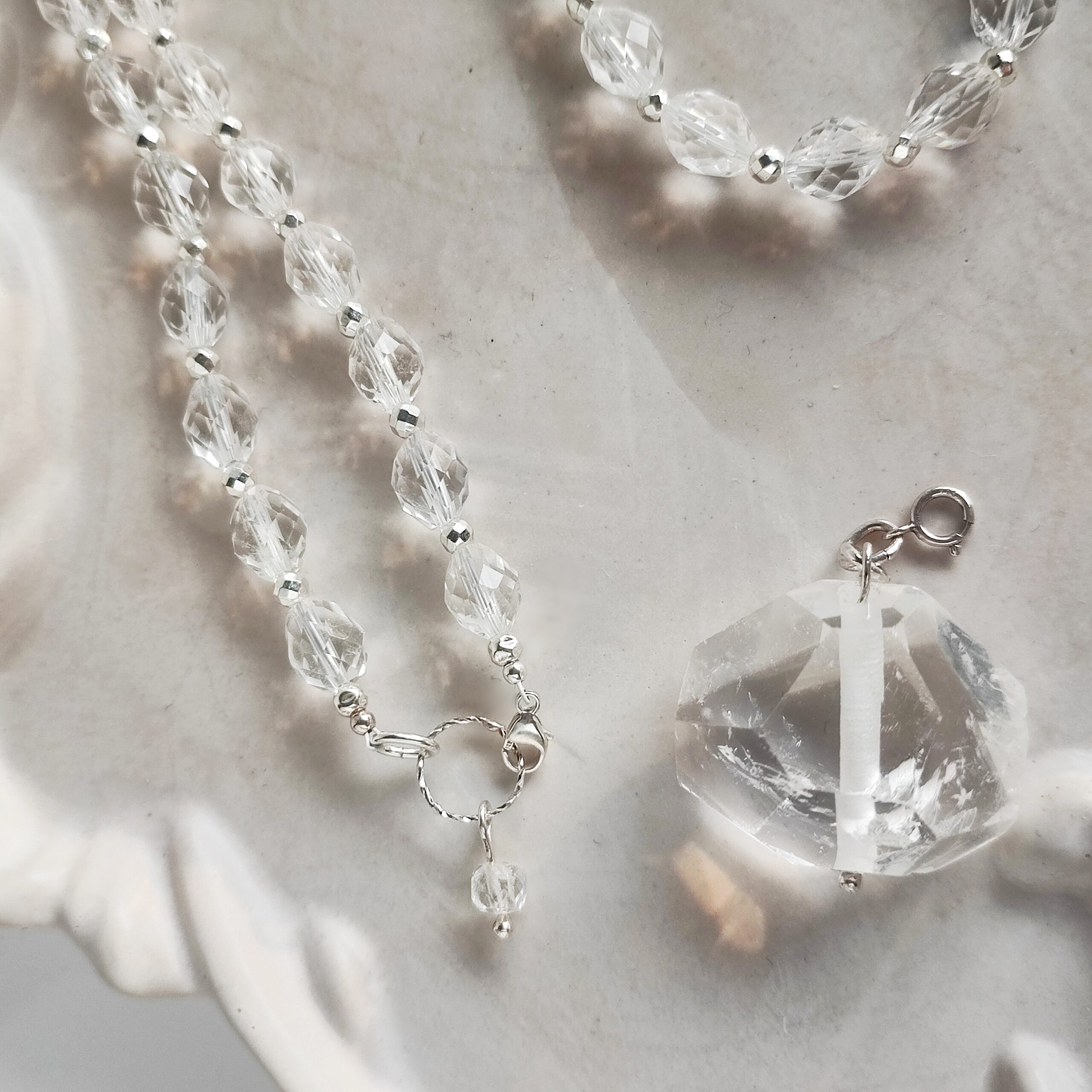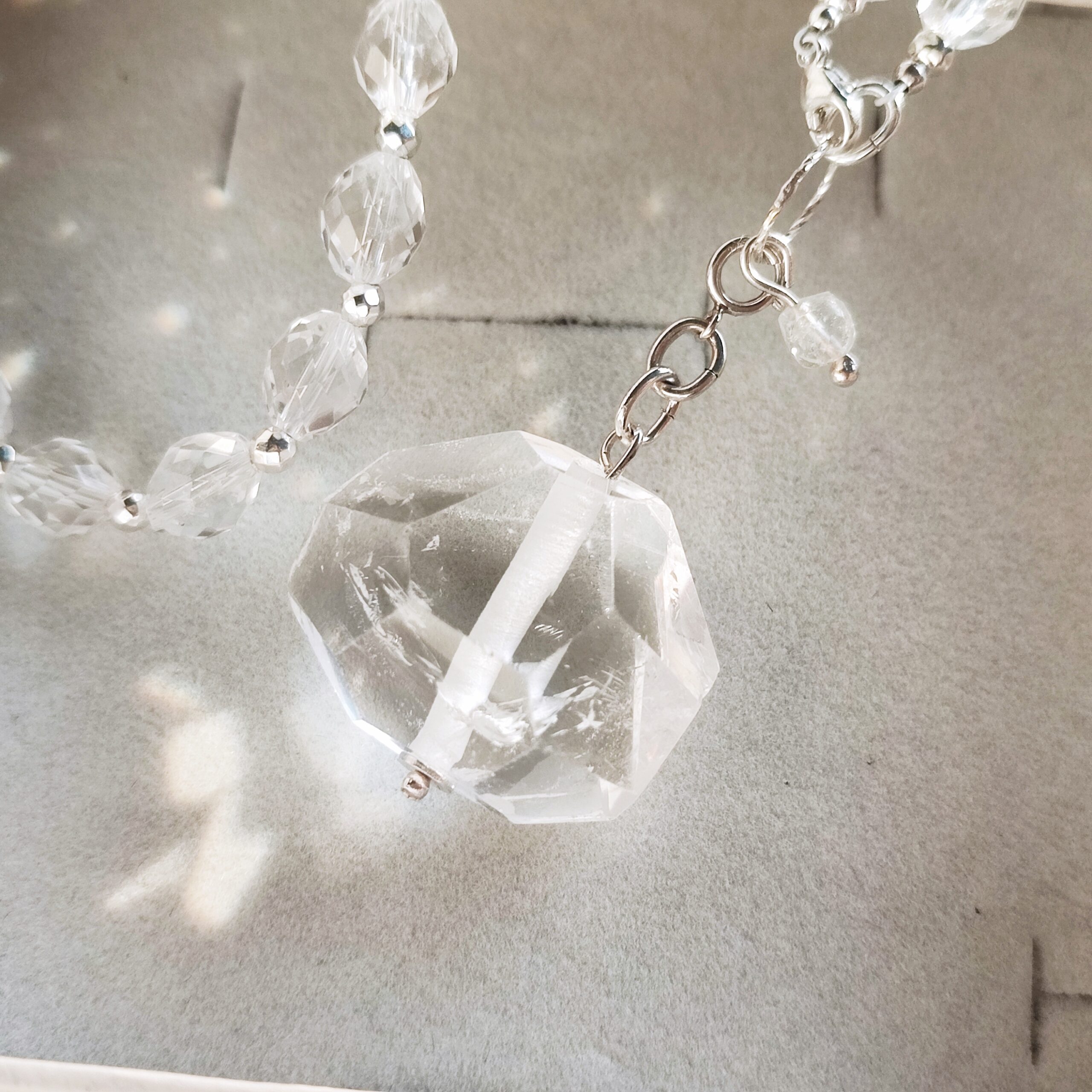 Do zapięcia przypięta jest imponująca, przejrzysta bryłka Kwarcu Górskiego, o nieregularnym, owalnym kształcie (ok. 28×28×16mm) i surowym szlifie typu ciosany. Bryłkę można odpiąć, nosząc naszyjnik w dwóch odsłonach: bardziej minimalistycznej lub spektakularnej.