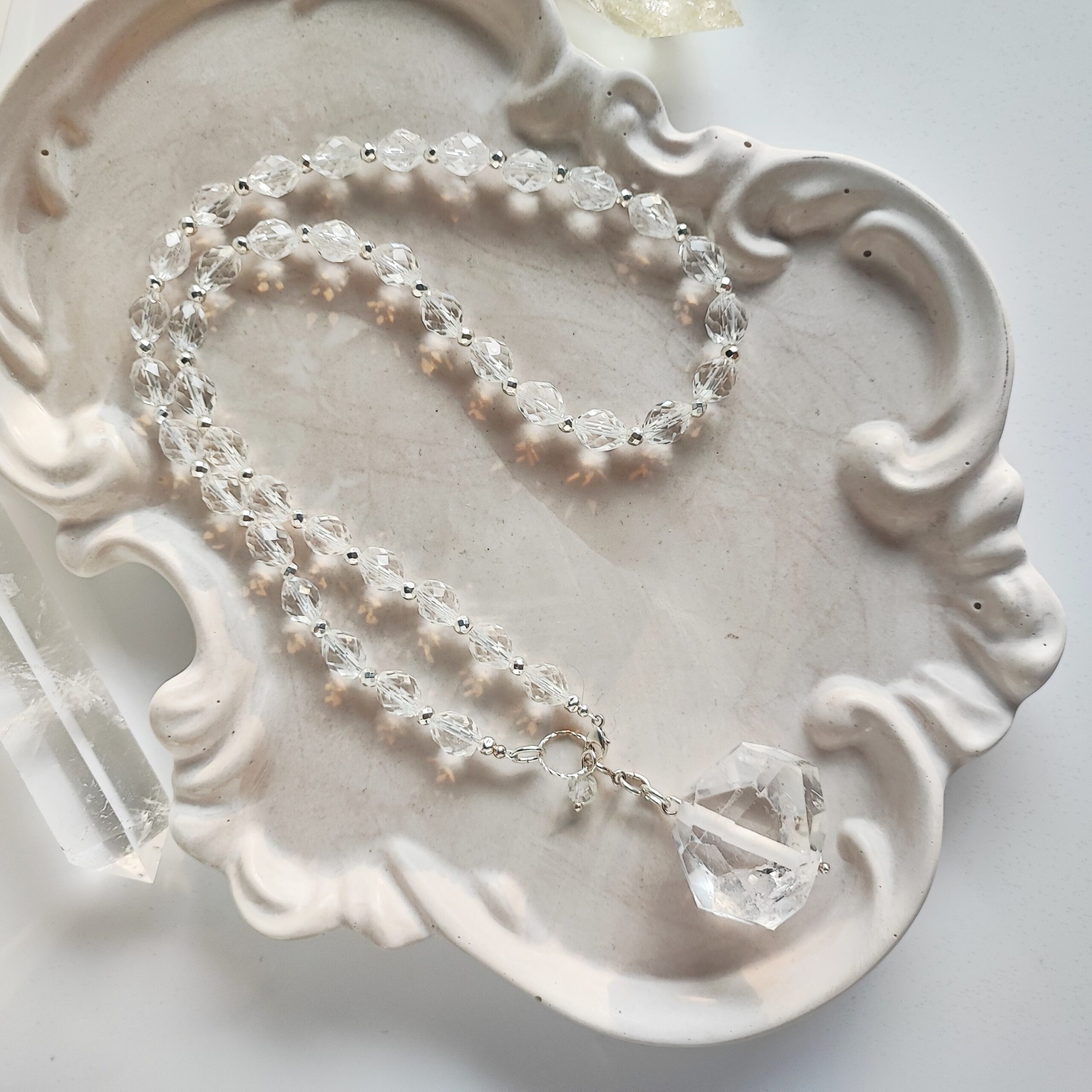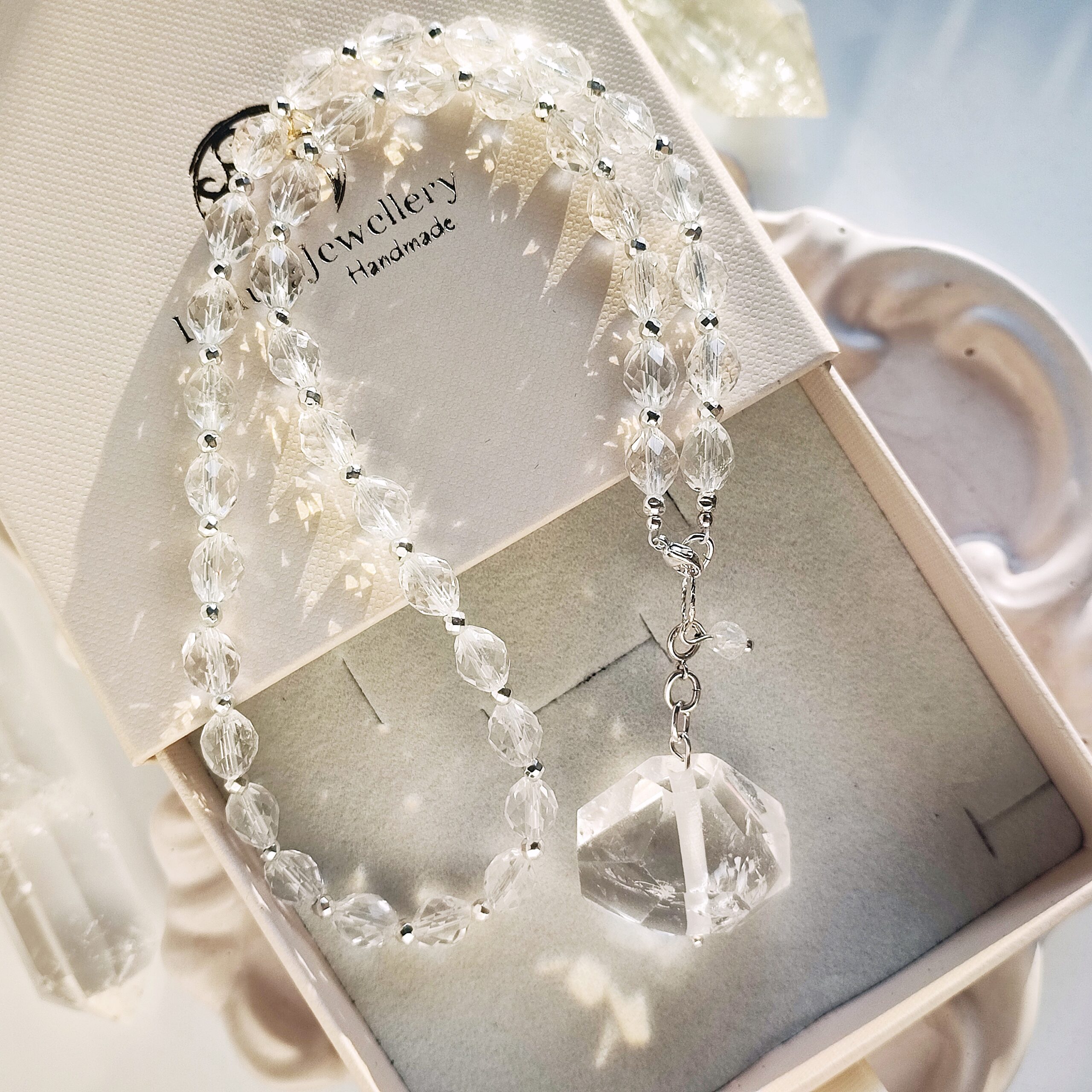Naszyjnik tworzy sznur naturalnego Kwarcu Górskiego w formie wydłużonych, fasetowanych oliwek o wymiarach ok. 8×7 mm. Każdy kamień oddzielony jest drobną, fasetowaną kulką Hematytu (3mm) w srebrnym kolorze, co nadaje całości rytm i subtelny, nowoczesny kontrast.