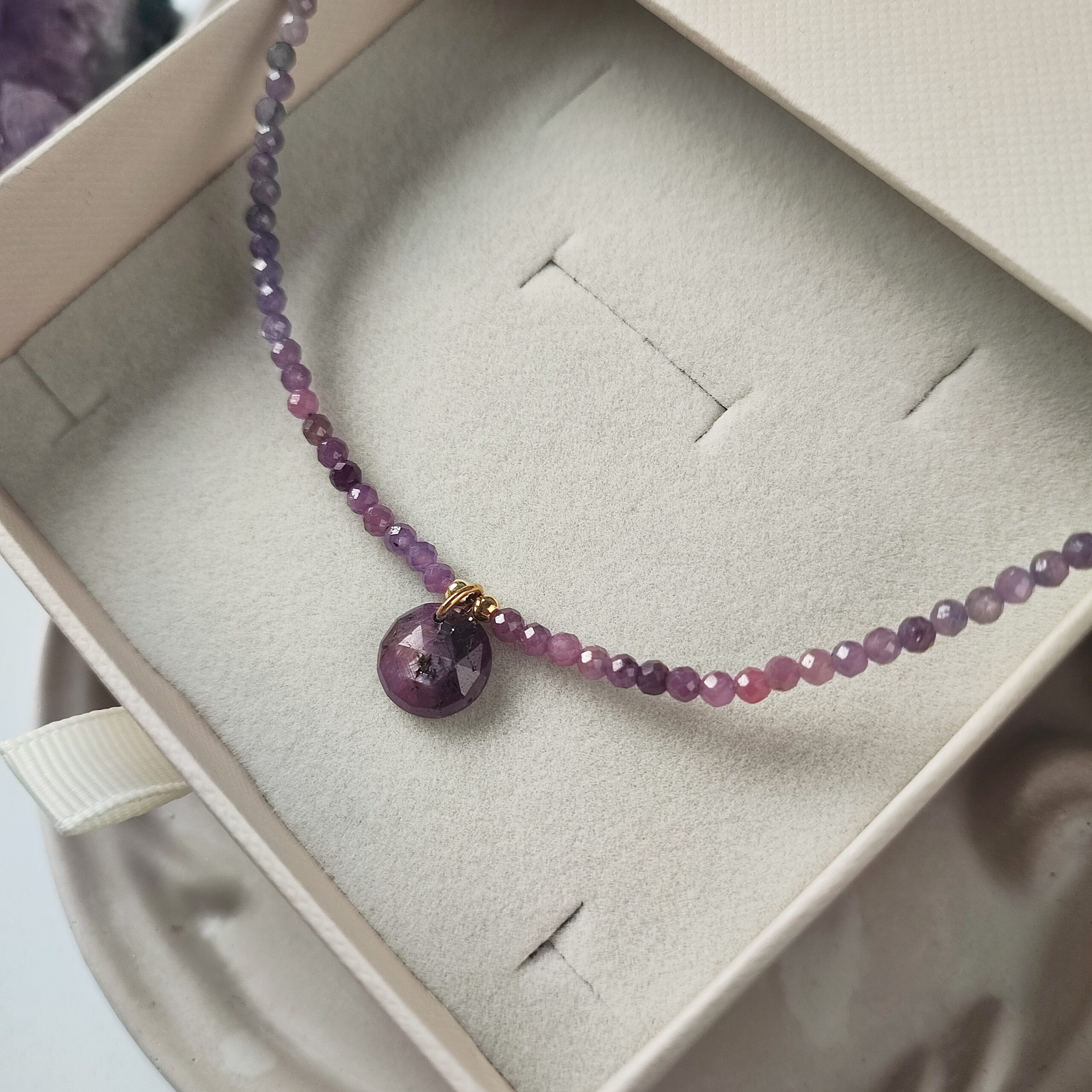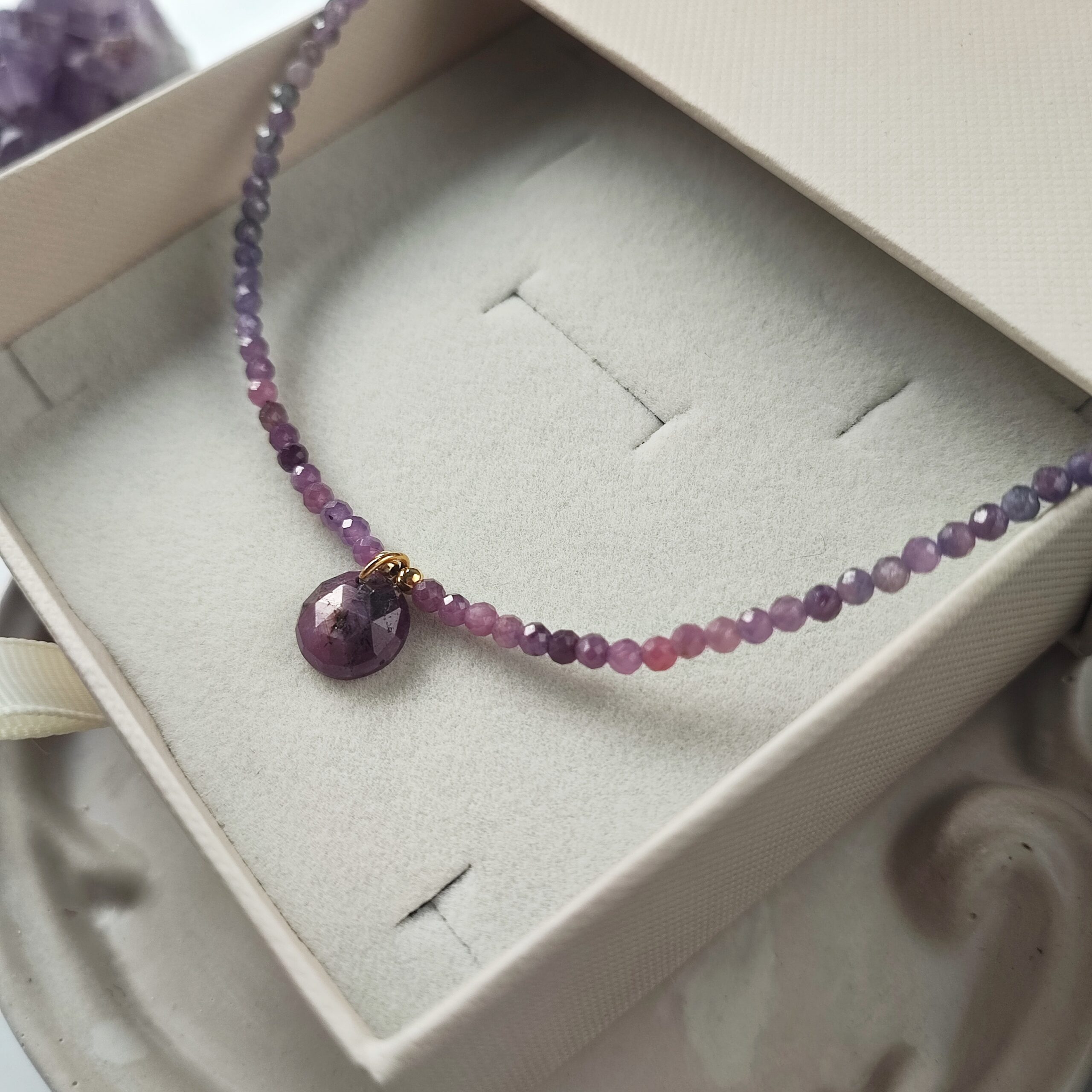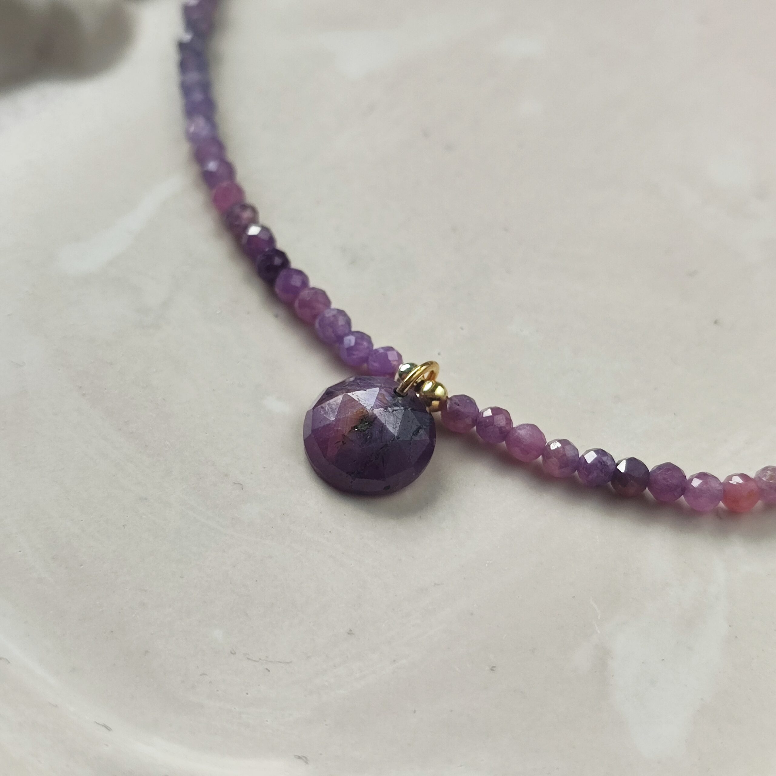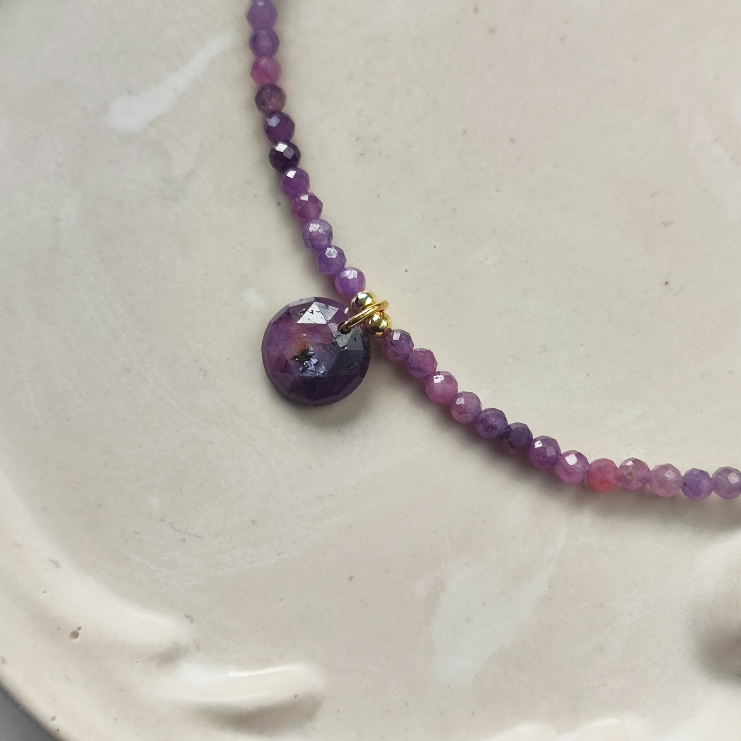 Wyjątkowy, ręcznie wykonany naszyjnik z naturalnych Szafirów o niezwykłej, wielowymiarowej kolorystyce. Kamienie w odcieniach różu, fioletu i niebieskiego, tworząc eteryczną, szlachetną kompozycję, która pięknie reaguje na światło.