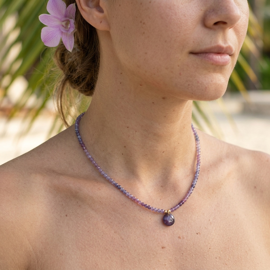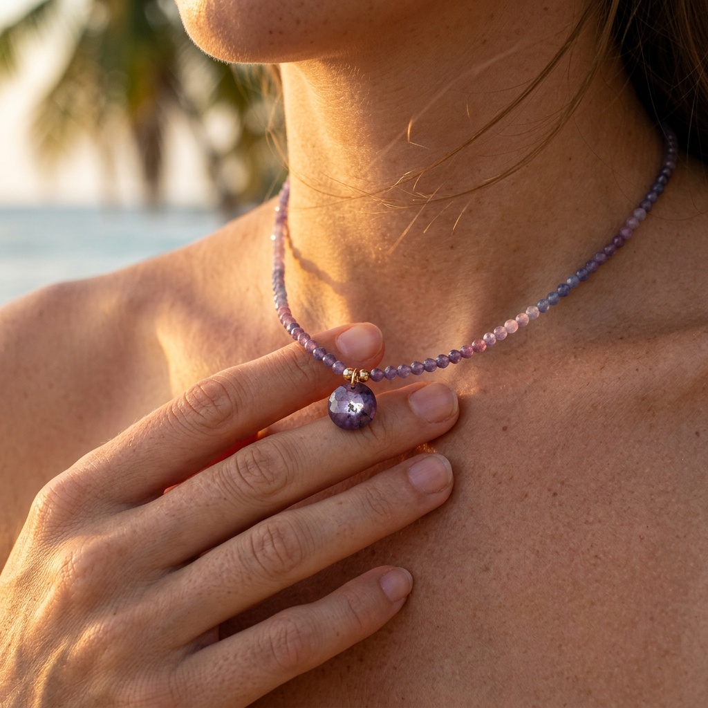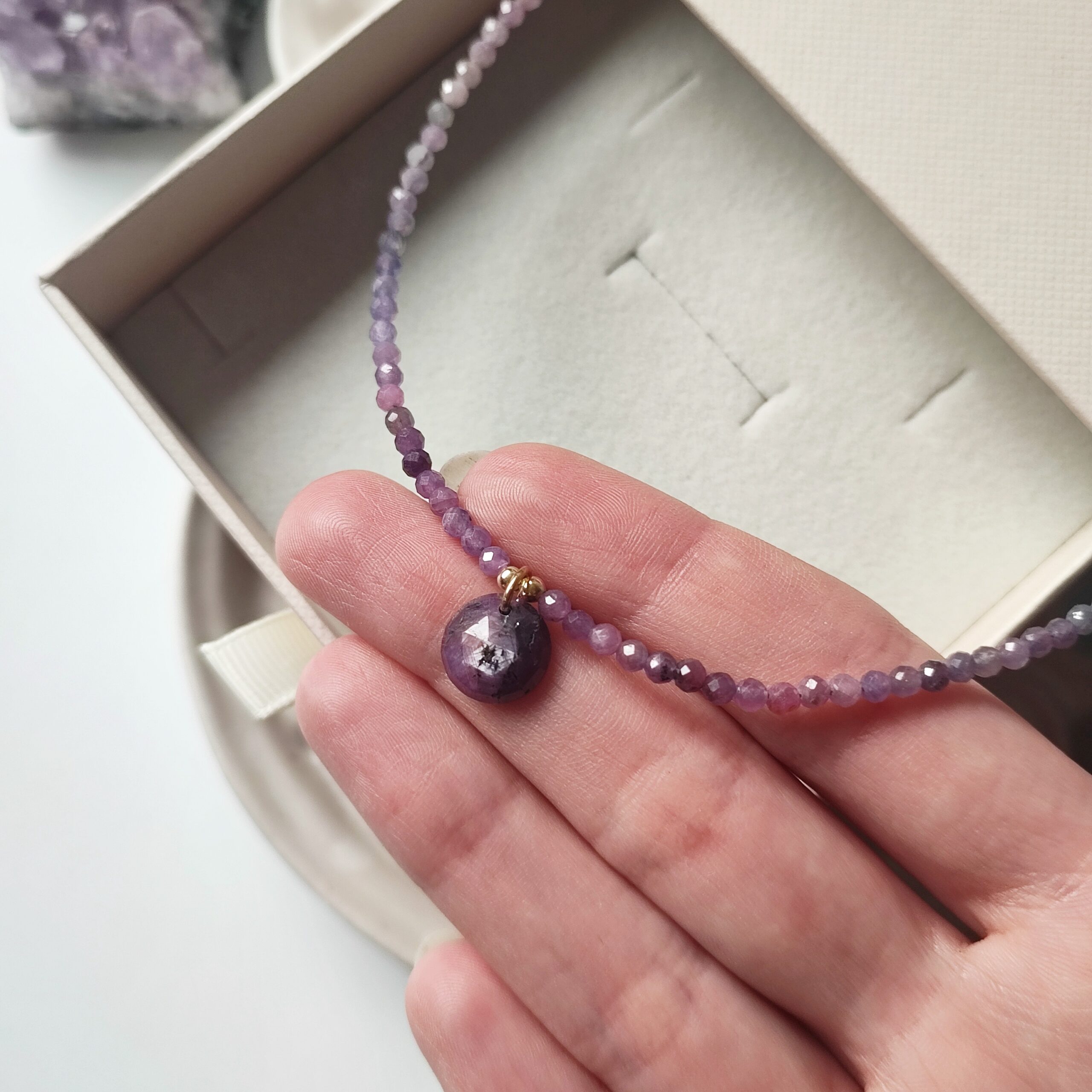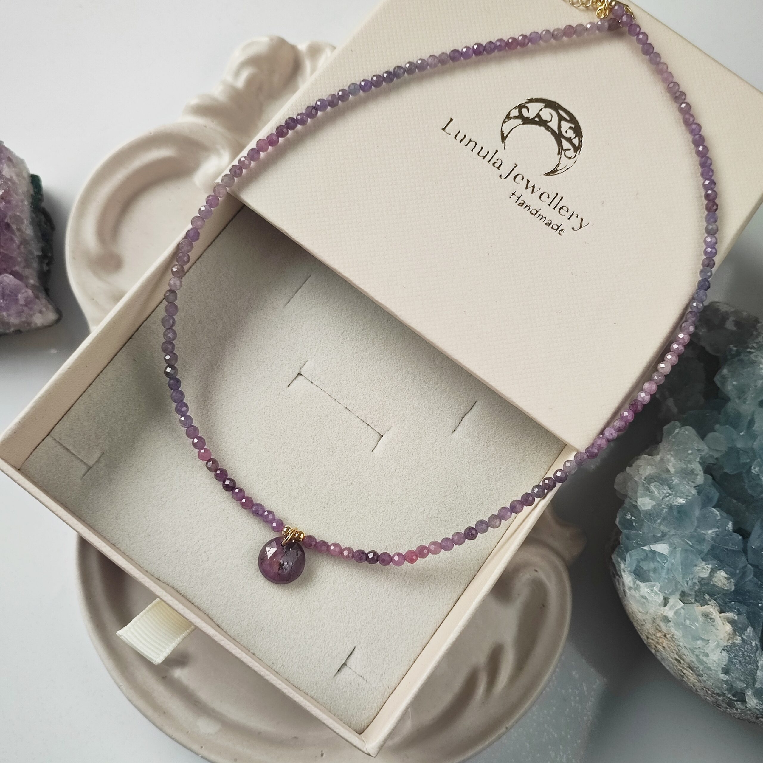 Wyjątkowy, ręcznie wykonany naszyjnik z naturalnych Szafirów o niezwykłej, wielowymiarowej kolorystyce. Kamienie w odcieniach różu, fioletu i niebieskiego, tworząc eteryczną, szlachetną kompozycję, która pięknie reaguje na światło.