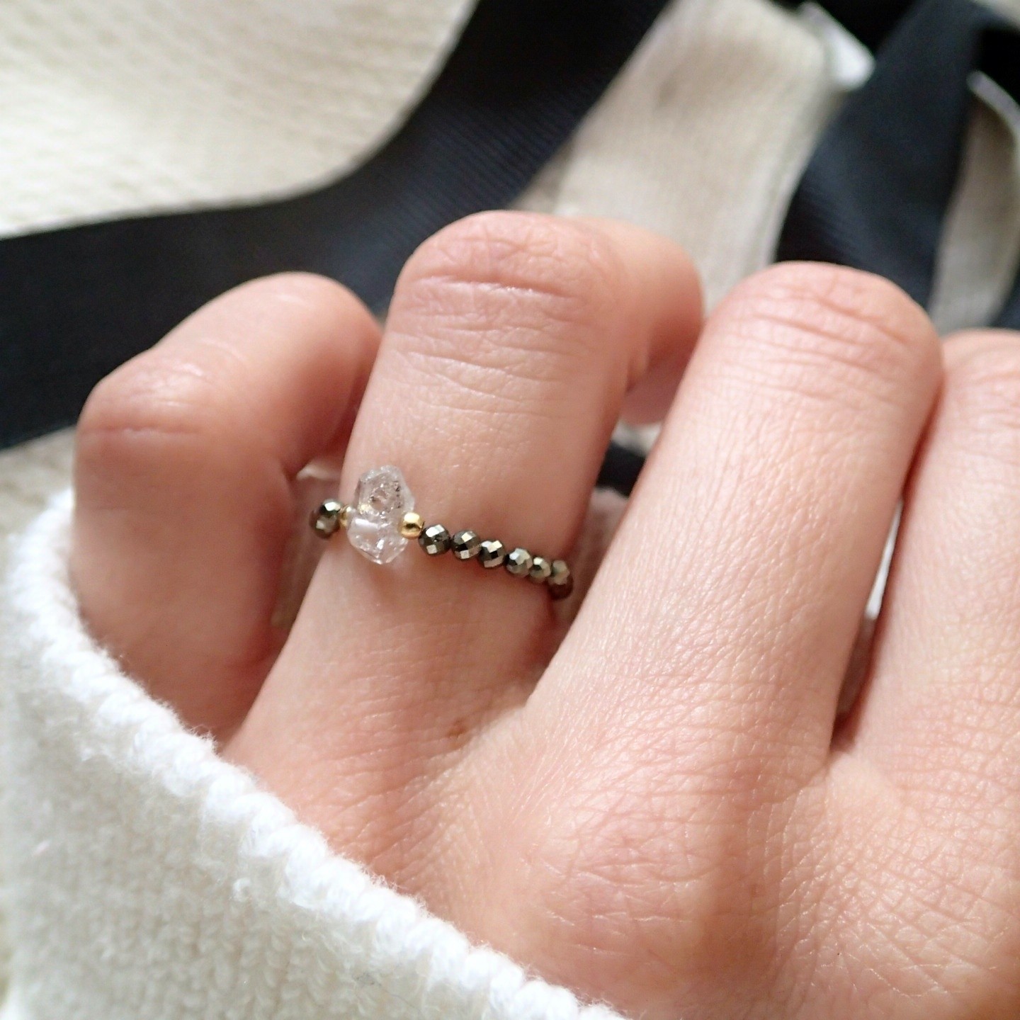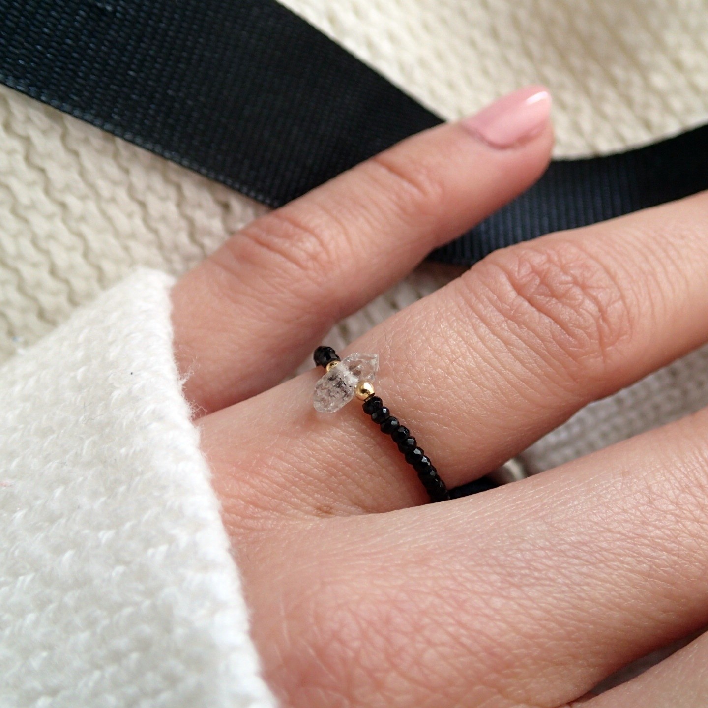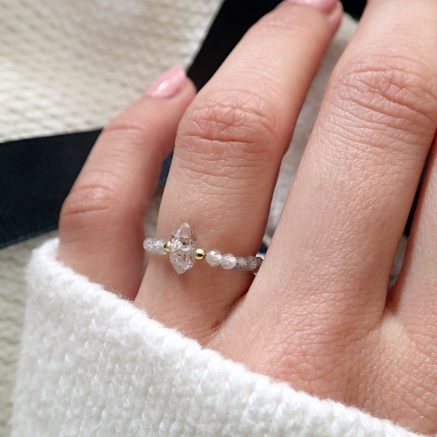 Ręcznie wykonany pierścionek z rzadkim minerałem – surowym, nieoszlifowanym diamentem Herkimer. Każdy z pierścionków jest ozdobiony srebrnymi lub srebrnymi pozłacanymi kuleczkami do wyboru. Wykonane na elastycznej, jubilerskiej żyłce.