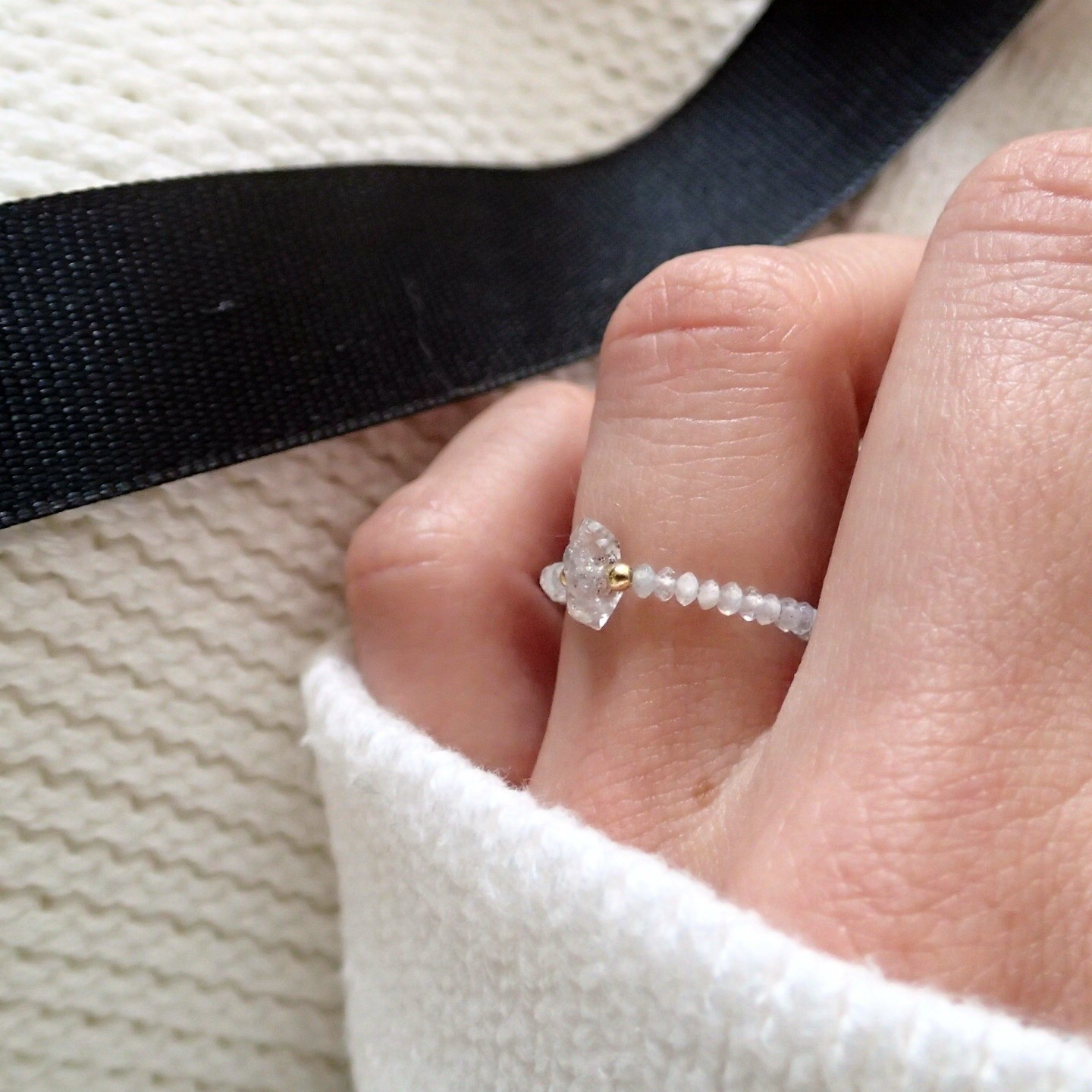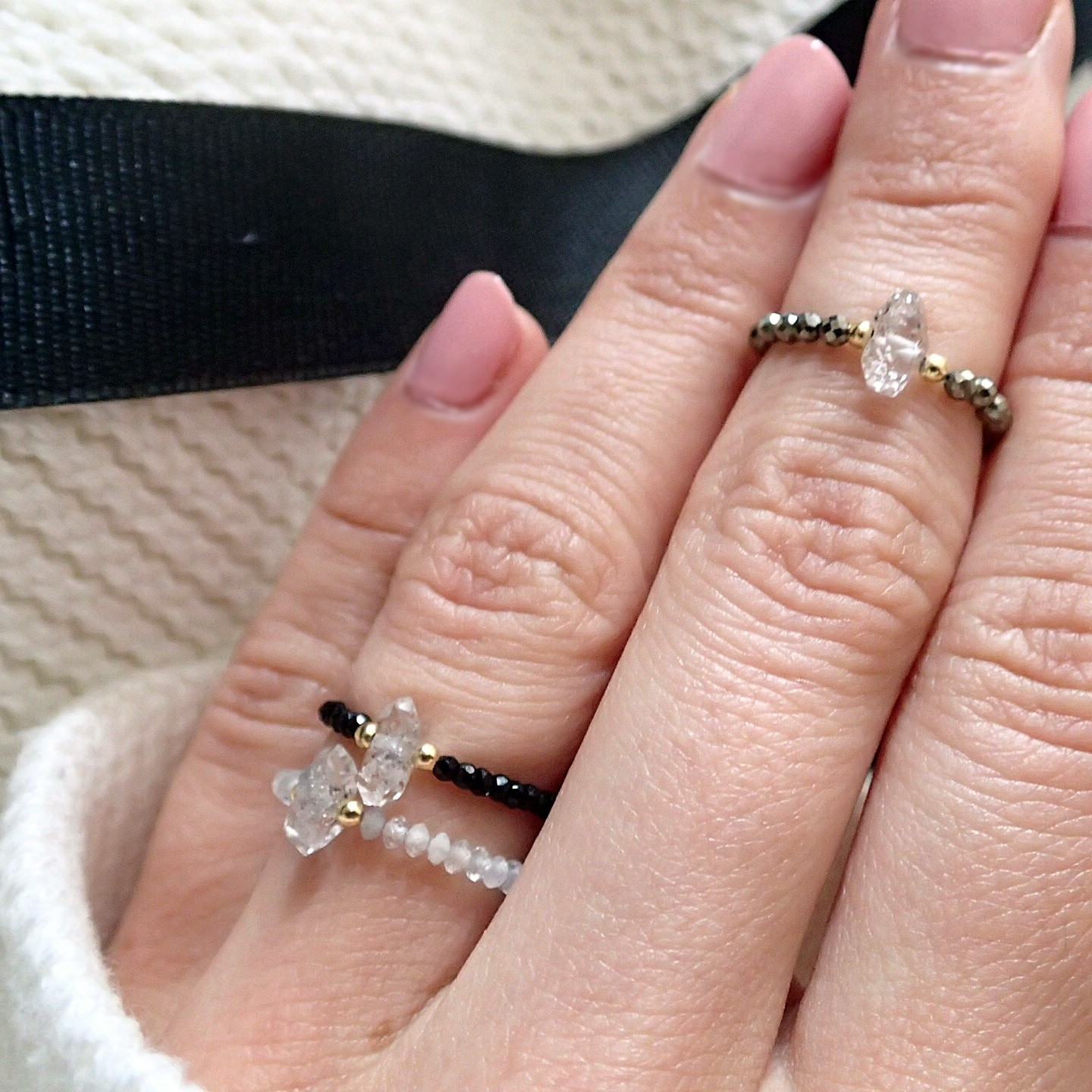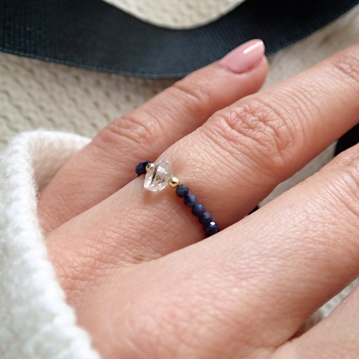 Ręcznie wykonany pierścionek z rzadkim minerałem – surowym, nieoszlifowanym diamentem Herkimer. Każdy z pierścionków jest ozdobiony srebrnymi lub srebrnymi pozłacanymi kuleczkami do wyboru. Wykonane na elastycznej, jubilerskiej żyłce.