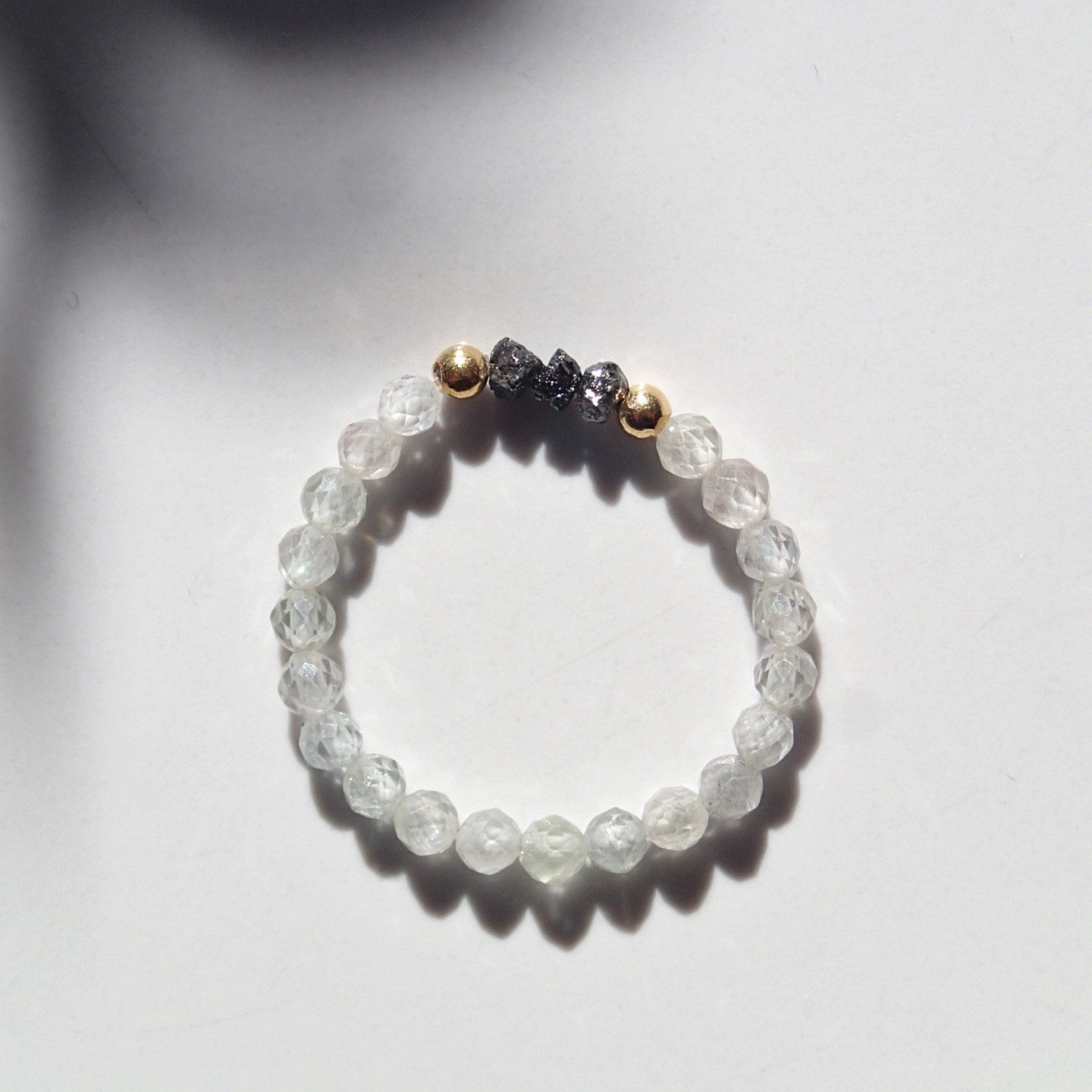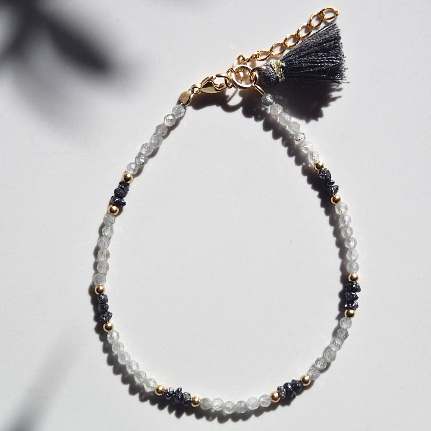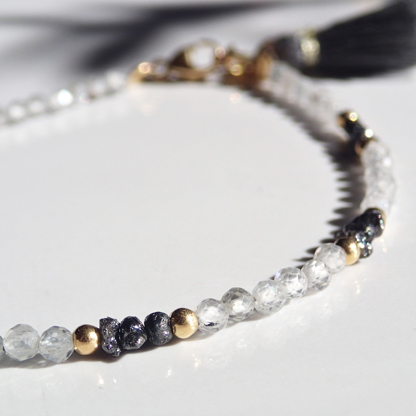 Cechy kamieni: Cyrkon – około 3 mm, kulisty fasetowany, czarny diament – nieregularny kształt, około 2-3 mm
