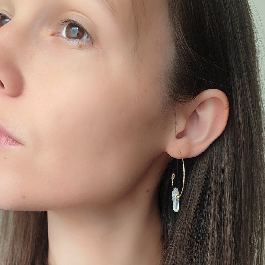 – Design: Kółeczka diamentowane – specjalny proces diamentowania nadaje im maximum iskrzenia. Nieregularne słupki kwarcu aura dodają im unikalnego uroku, a iskrzące kuleczki z pozłacanego srebra przykuwają uwagę.