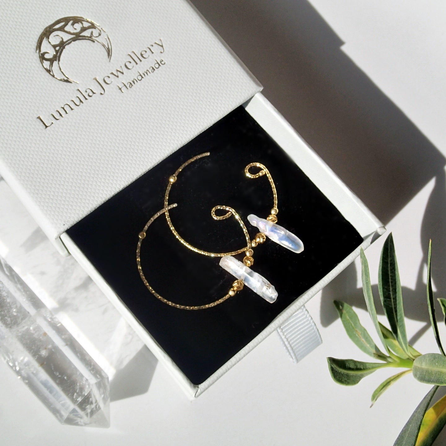 – Eleganckie firmowe pudełeczko z logo Lunula Jewellery, idealne do przechowywania i prezentacji kolczyków.