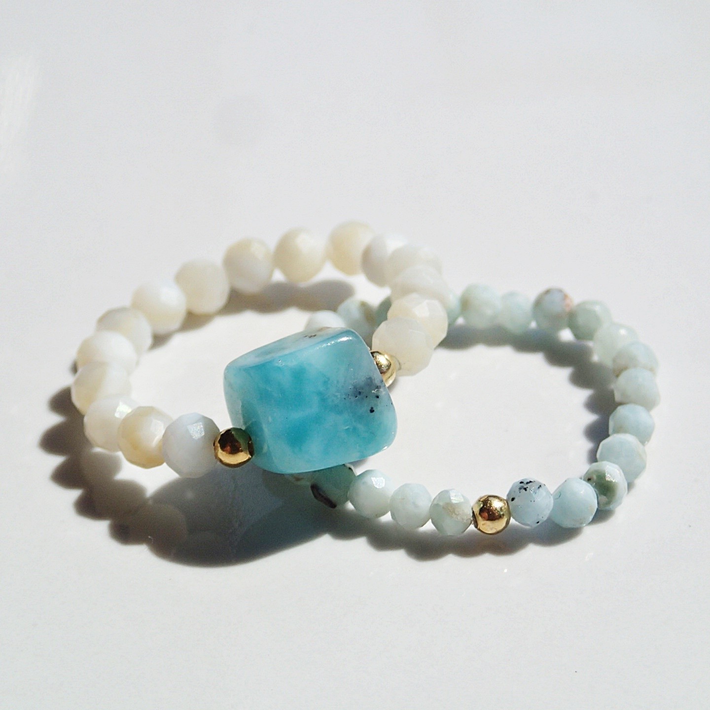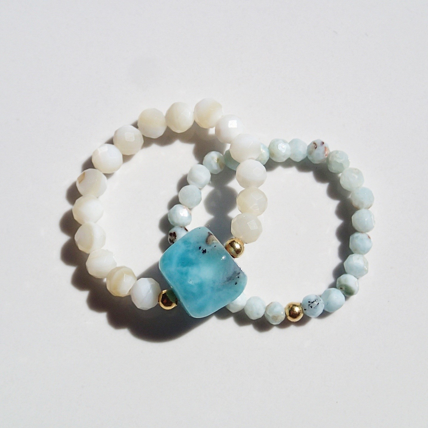 Ręcznie robione pierścionki z naturalnych muszli i larimaru. Ozdobne kulki są wykonane ze srebra i pozłacanego srebra.