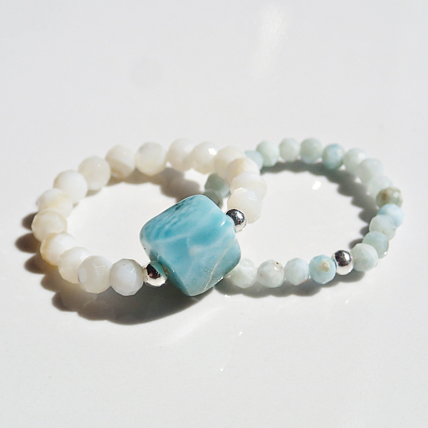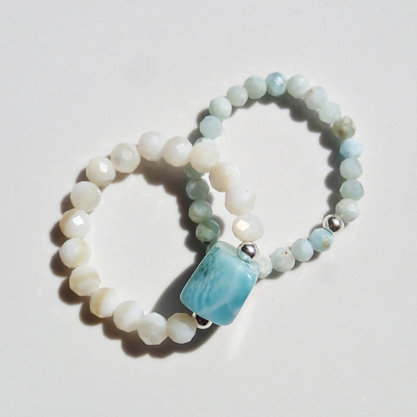 Cechy kamienia: muszla 3mm fasetowana kulka, larimar nieregularna kostka 6-8mm, larimar fasetowana kulka ~2,5mm